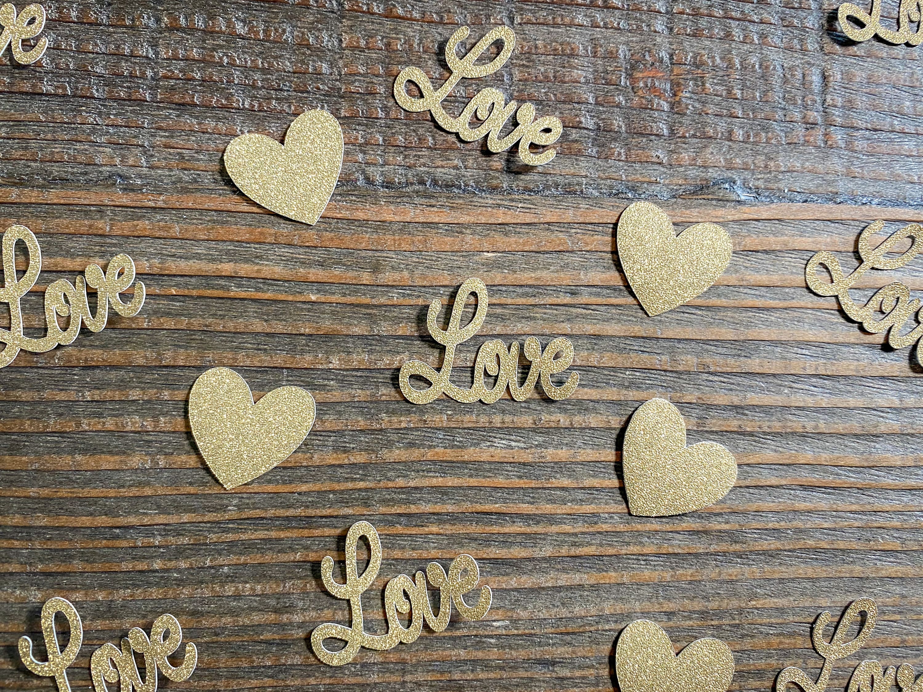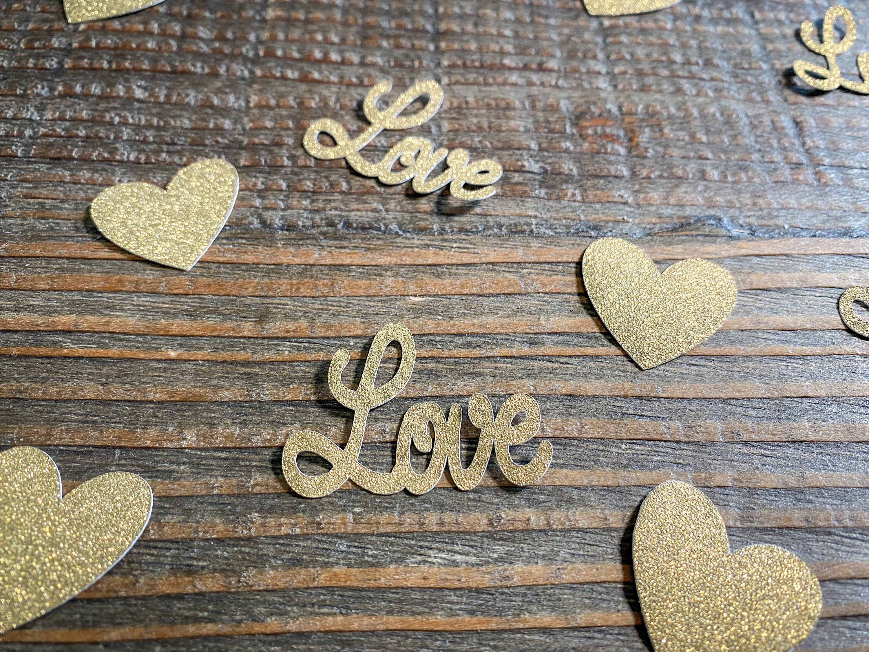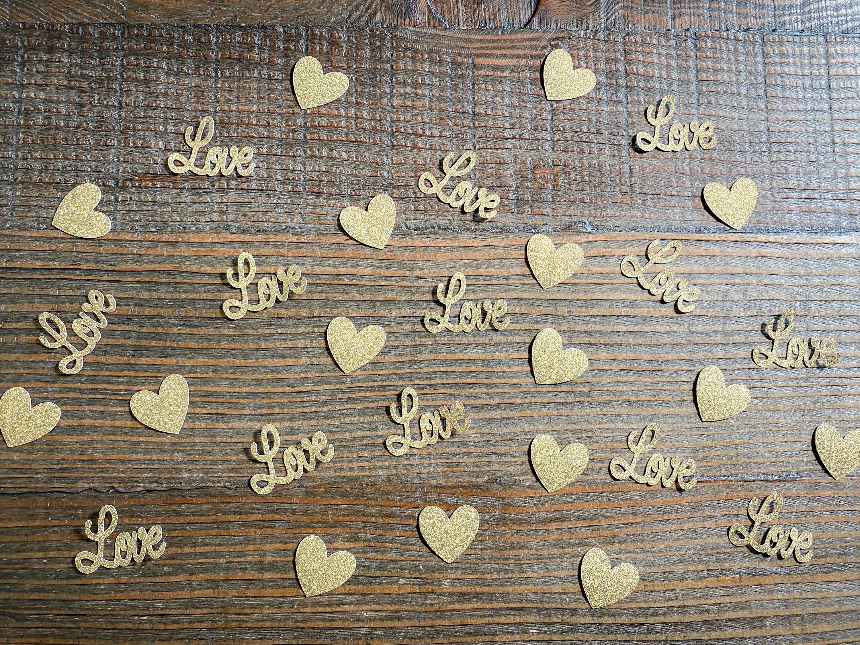 This listing is for 100 pieces of confetti! It includes 25 pieces of glitter gold love confetti and 75 pieces of glitter gold heart confetti. The hearts measure 1 inch and the love pieces measure 1.5 inches in length and 1.25 inches in height. The glitter confetti is white on the reverse side.