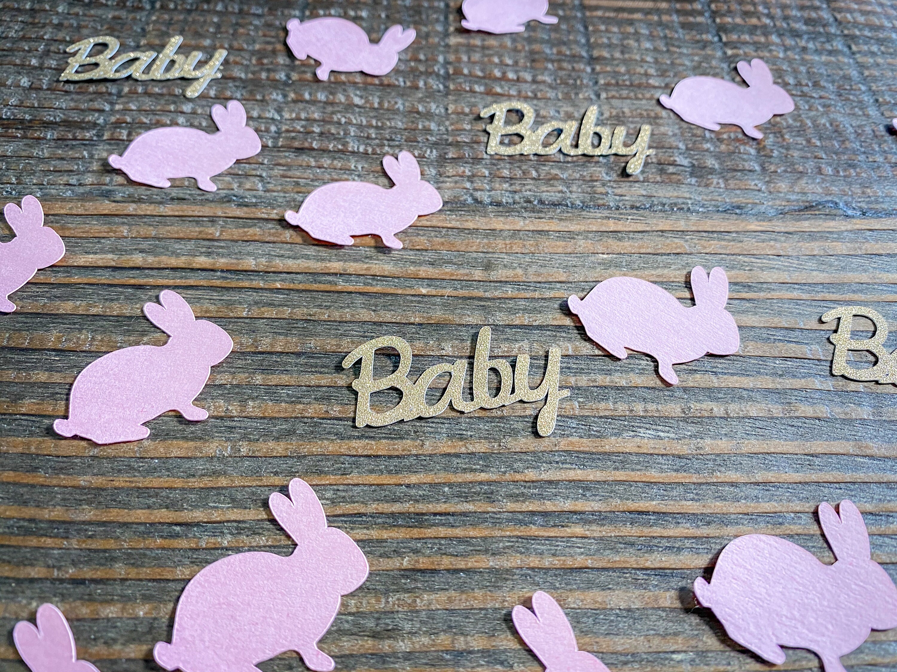 Add a touch of sparkle to your bunny themed baby shower decor with this pink and gold glitter confetti!