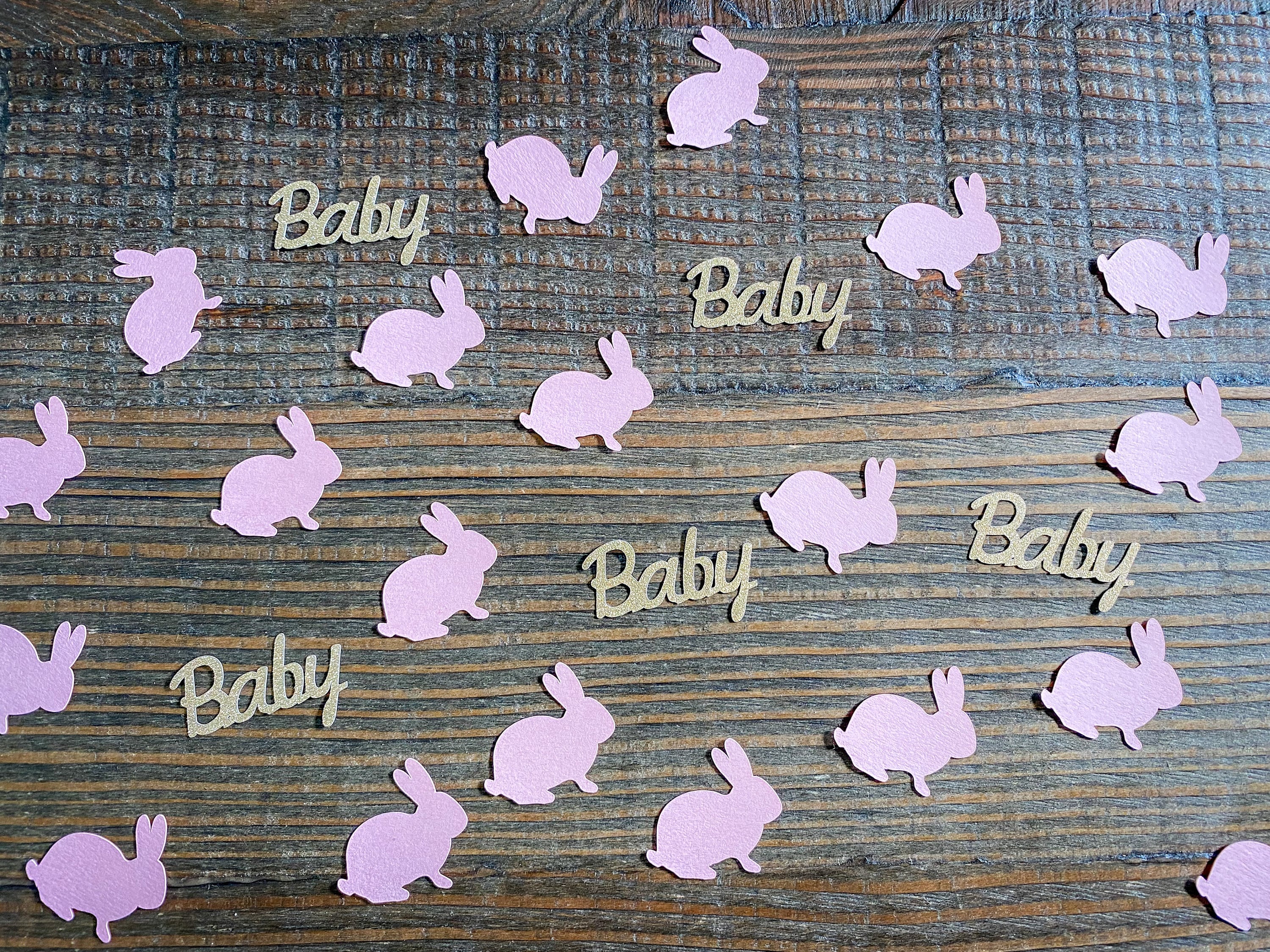 This listing is for 100 pieces of confetti! It includes 25 pieces of glitter gold "baby" confetti and 75 pieces of pink bunny confetti. The "baby" confetti is made with premium glitter cardstock that is white on the reverse side and measures approximately 1.5 inches in length. The bunnies are made from pink cardstock and measure approximately 1.25 inches.