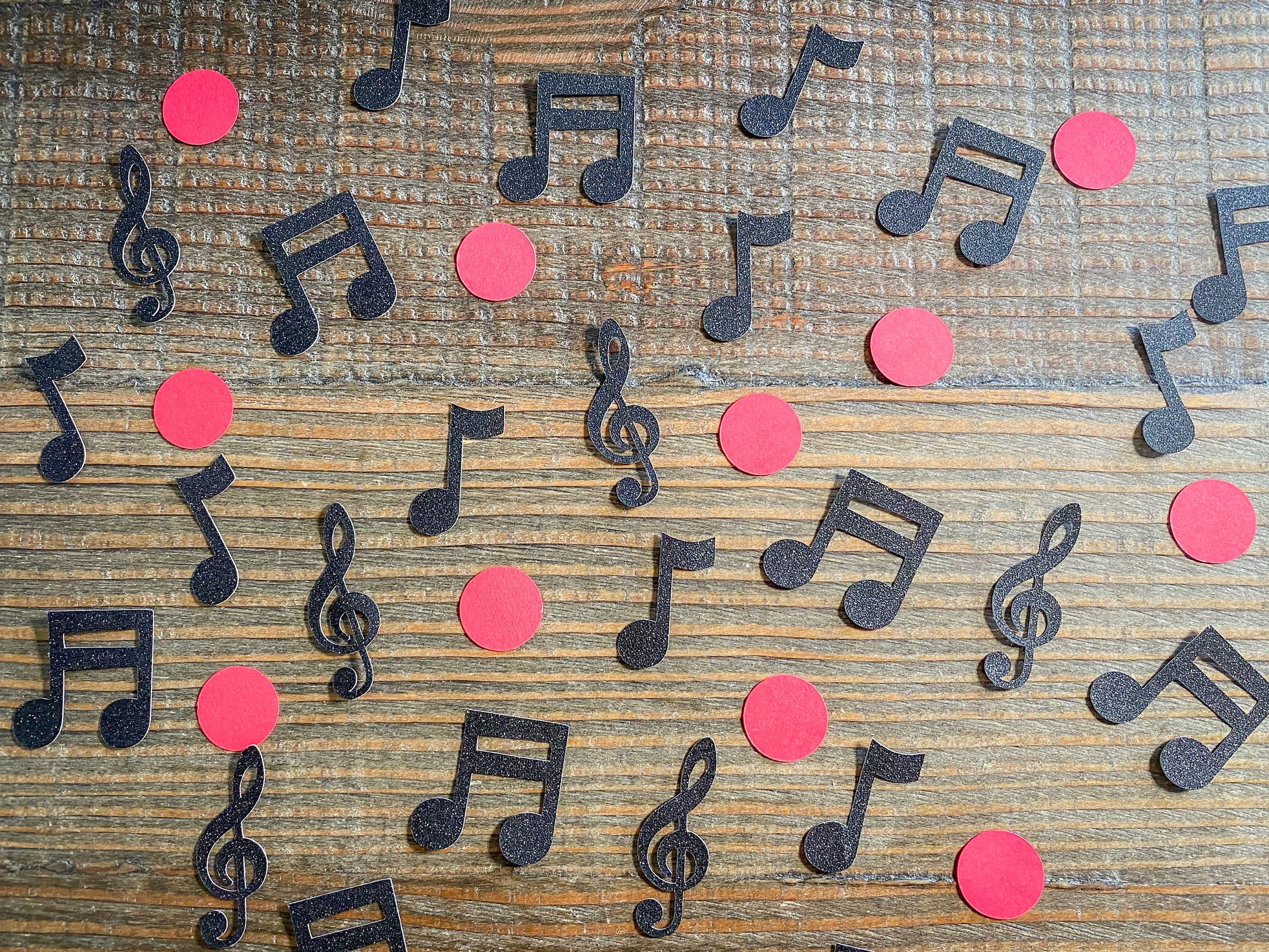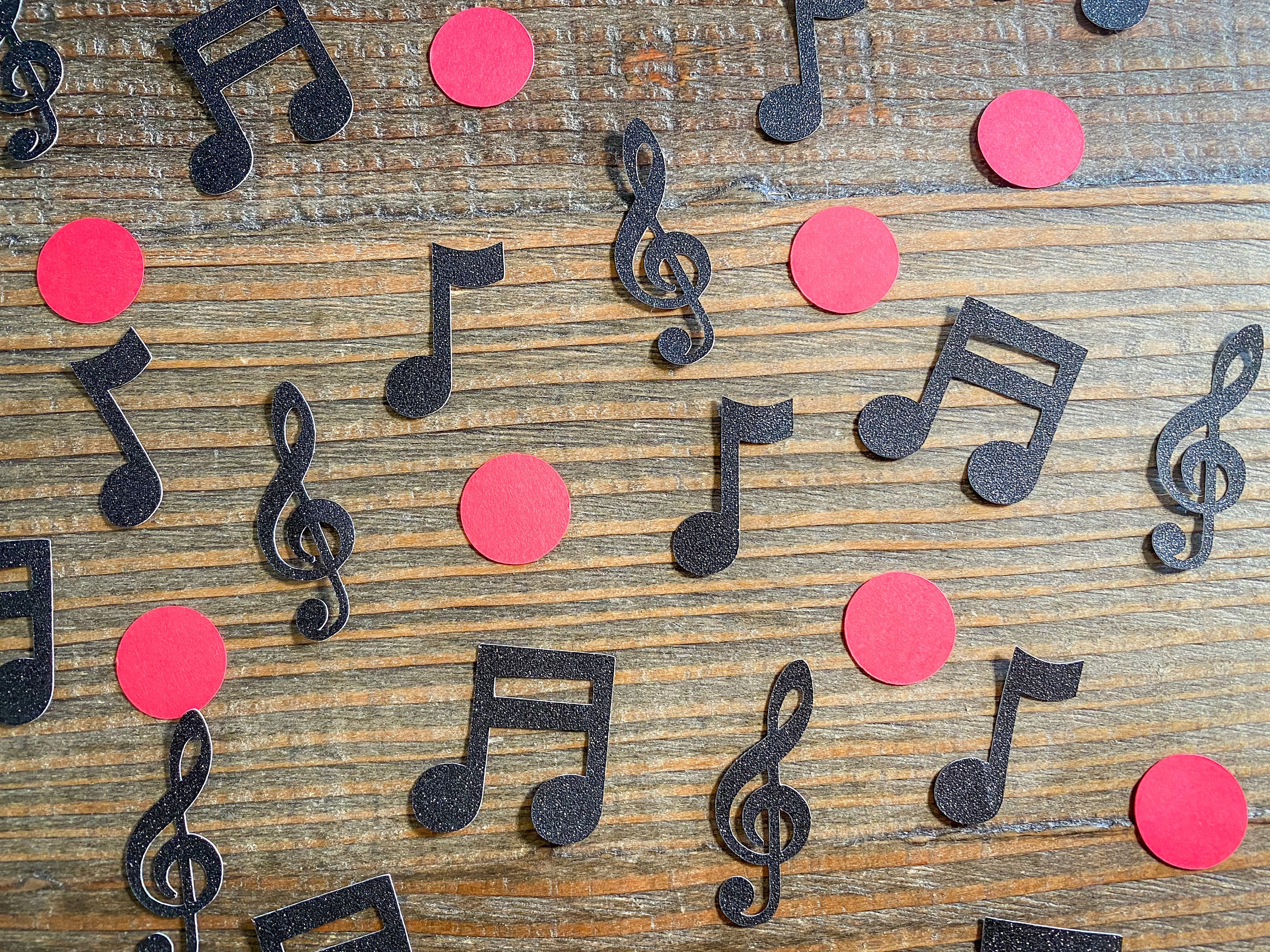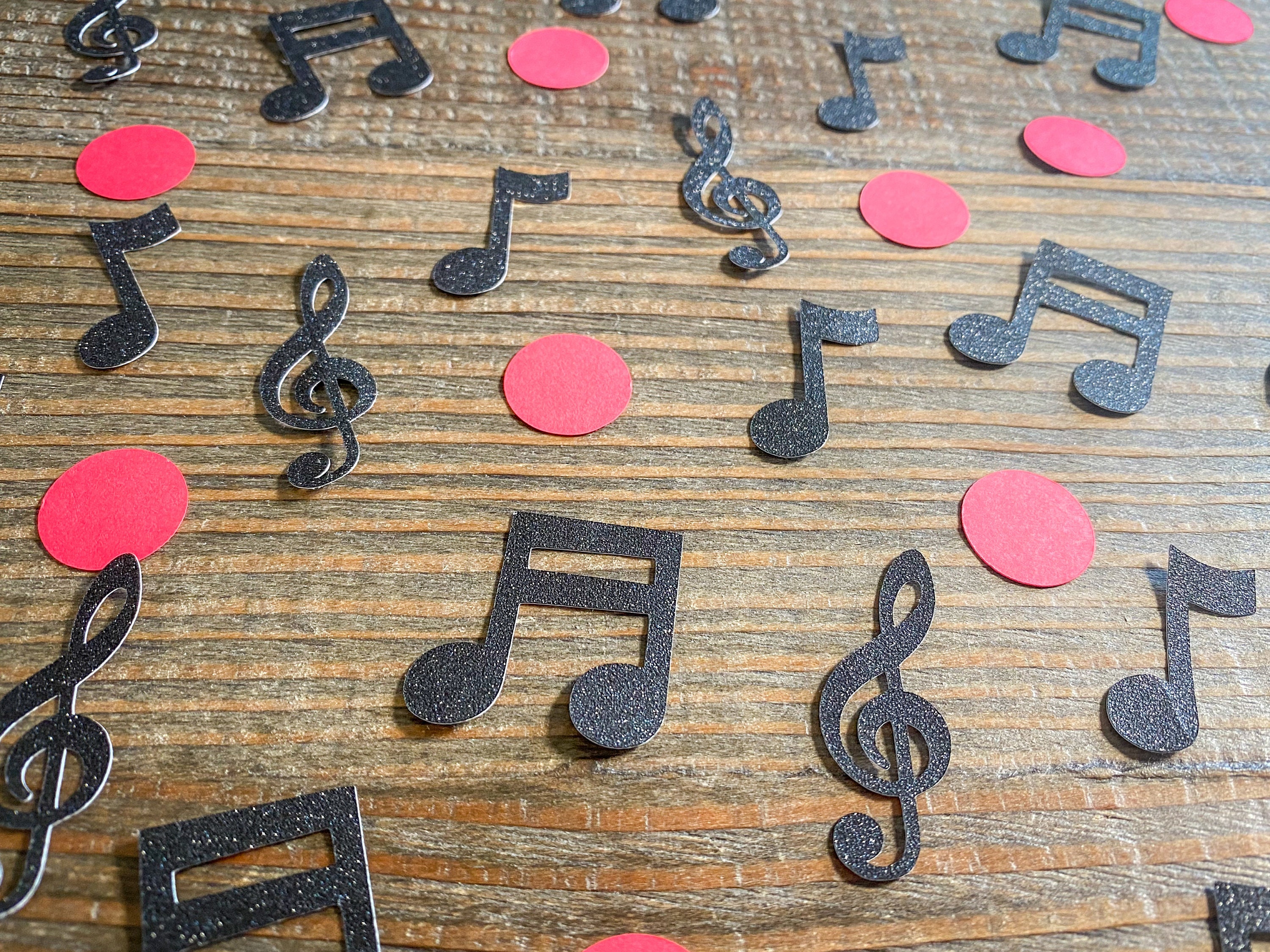 This listing is for 100 pieces of confetti! It includes 25 piece of black glitter music note confetti and 75 pieces of red circle confetti. The music notes are made from premium black glitter cardstock that is white on the reverse side and the pieces measure approximately 1.25-1.75 inches in height. The circles are made from red cardstock and measure .75 inches in diameter.