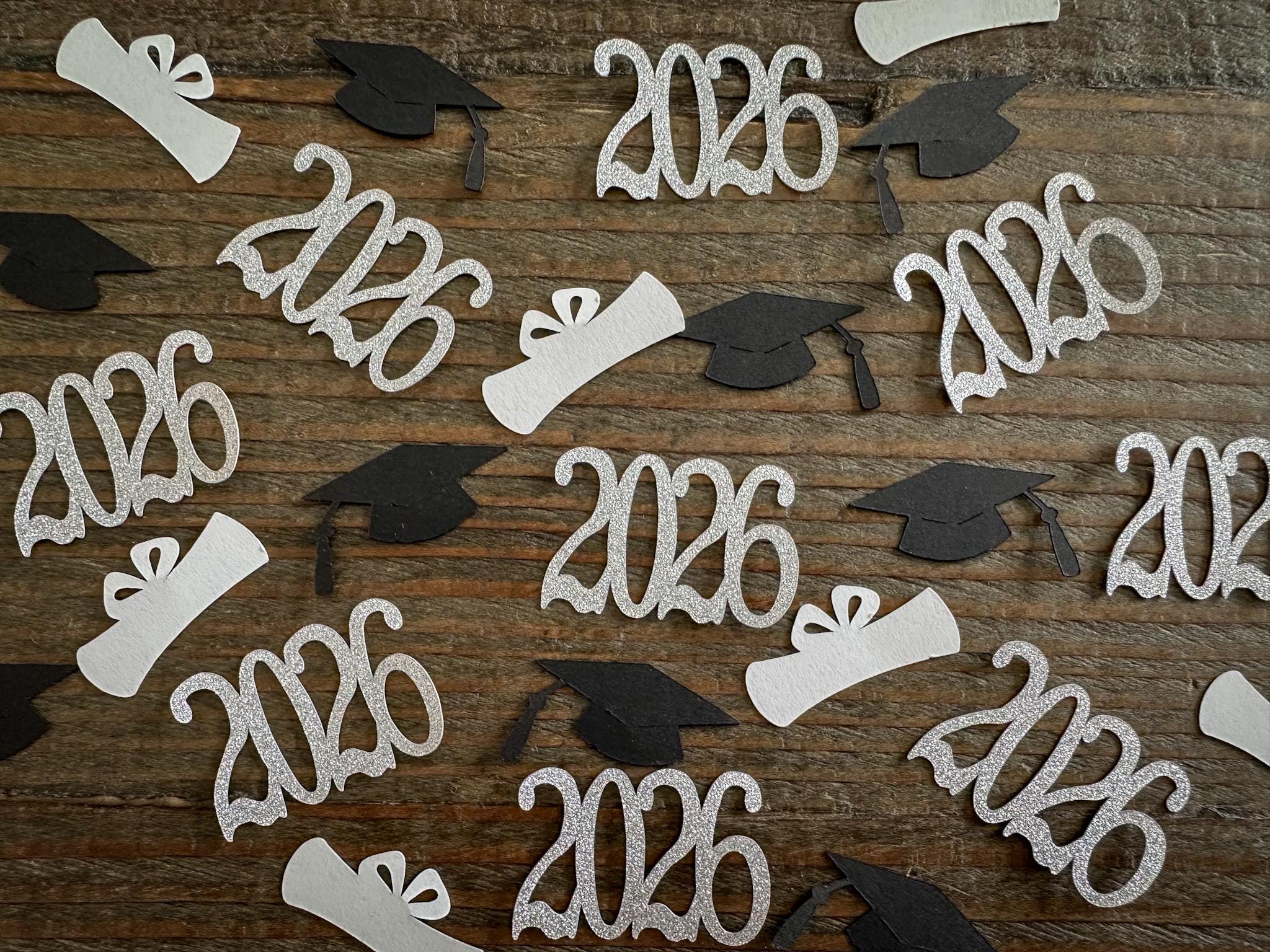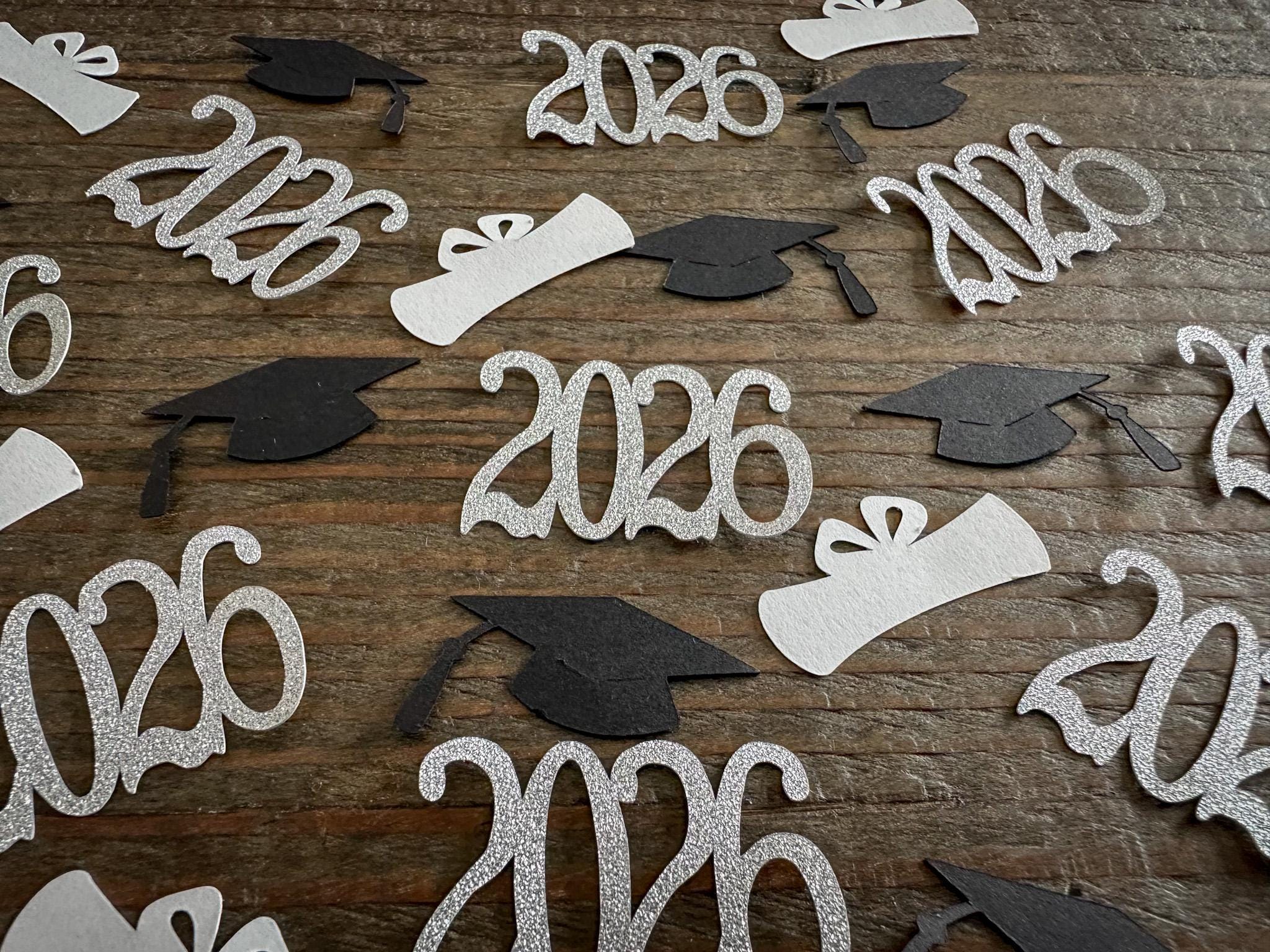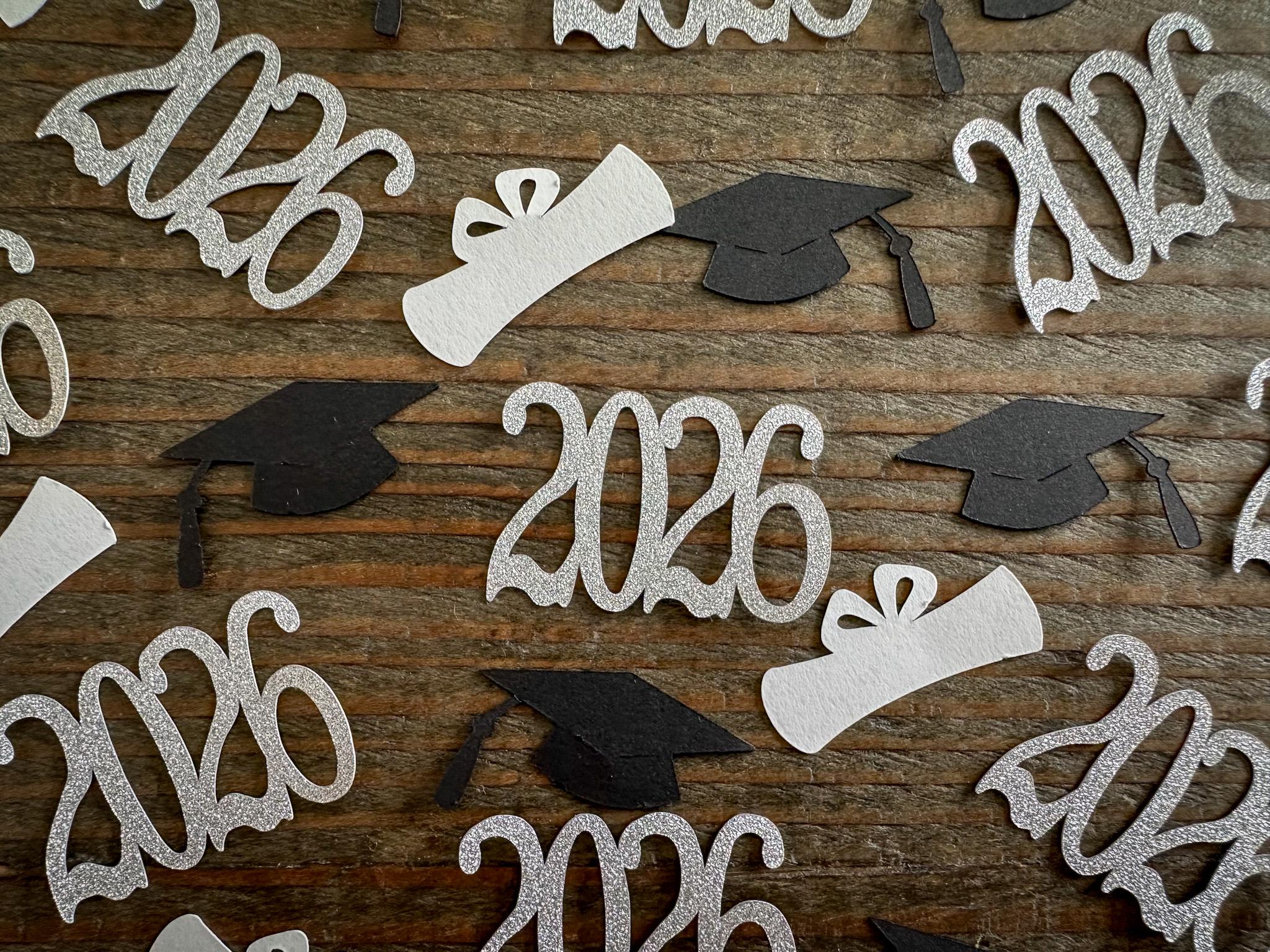 This listing is for 100 pieces of confetti! It includes 30 pieces of silver glitter 2026 confetti, 35 pieces of black graduation caps, and 35 pieces of white diploma confetti. The "2026" pieces are white on the reverse side and measure approximately 1 inch in height and 1.25 inches in width. The graduation caps measure approximately 1.25 inches and the diplomas measure approximately 1.25 inches.