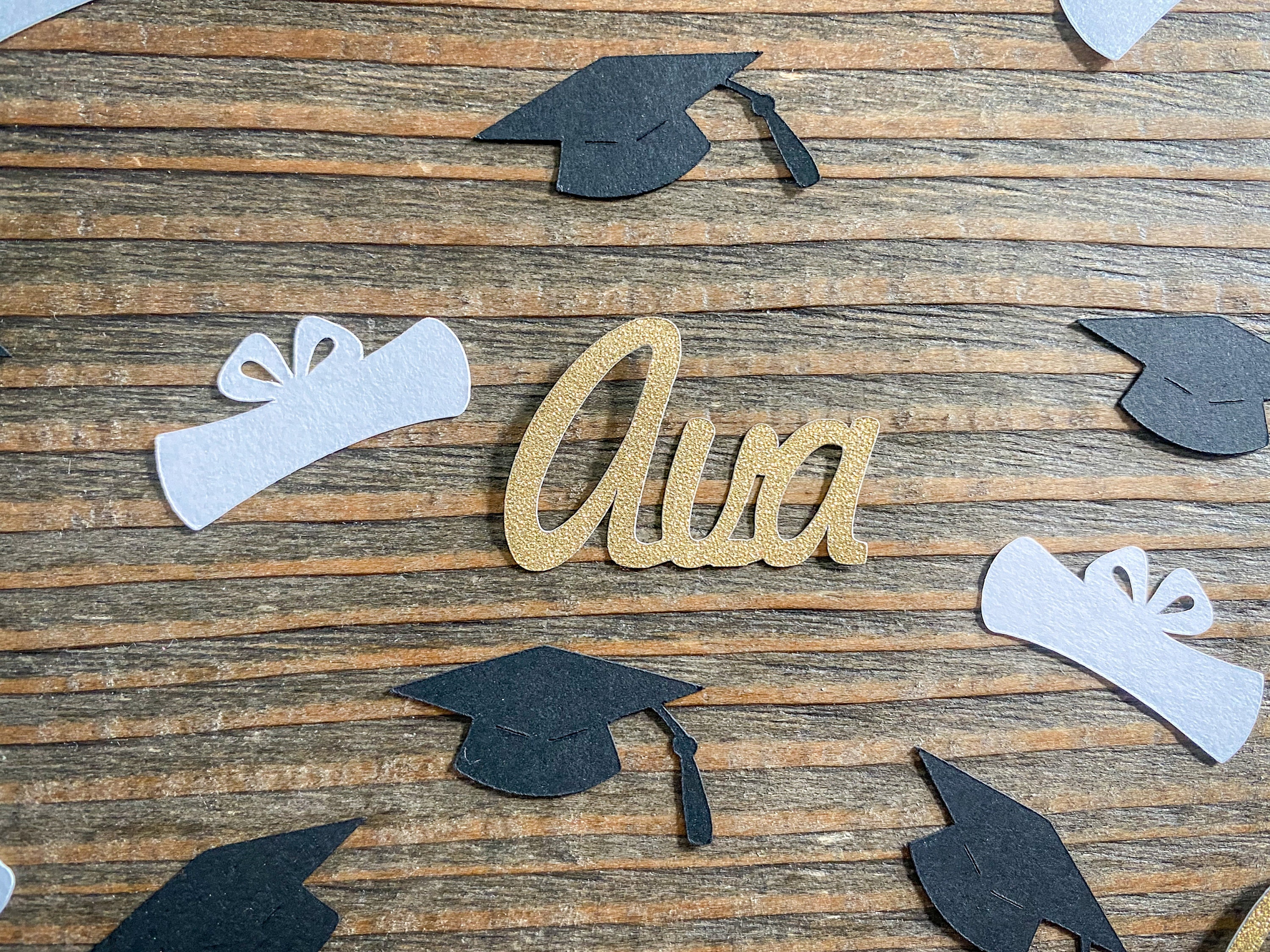This listing is for 100 pieces of confetti! It includes 30 pieces of gold glitter name confetti, 35 pieces of black graduation caps, and 35 pieces of white diploma confetti. The name pieces are white on the reverse side and measure approximately 1 inch in height and the length varies based on the name. The graduation caps measure approximately 1.25 inches and the diplomas measure approximately 1.25 inches.