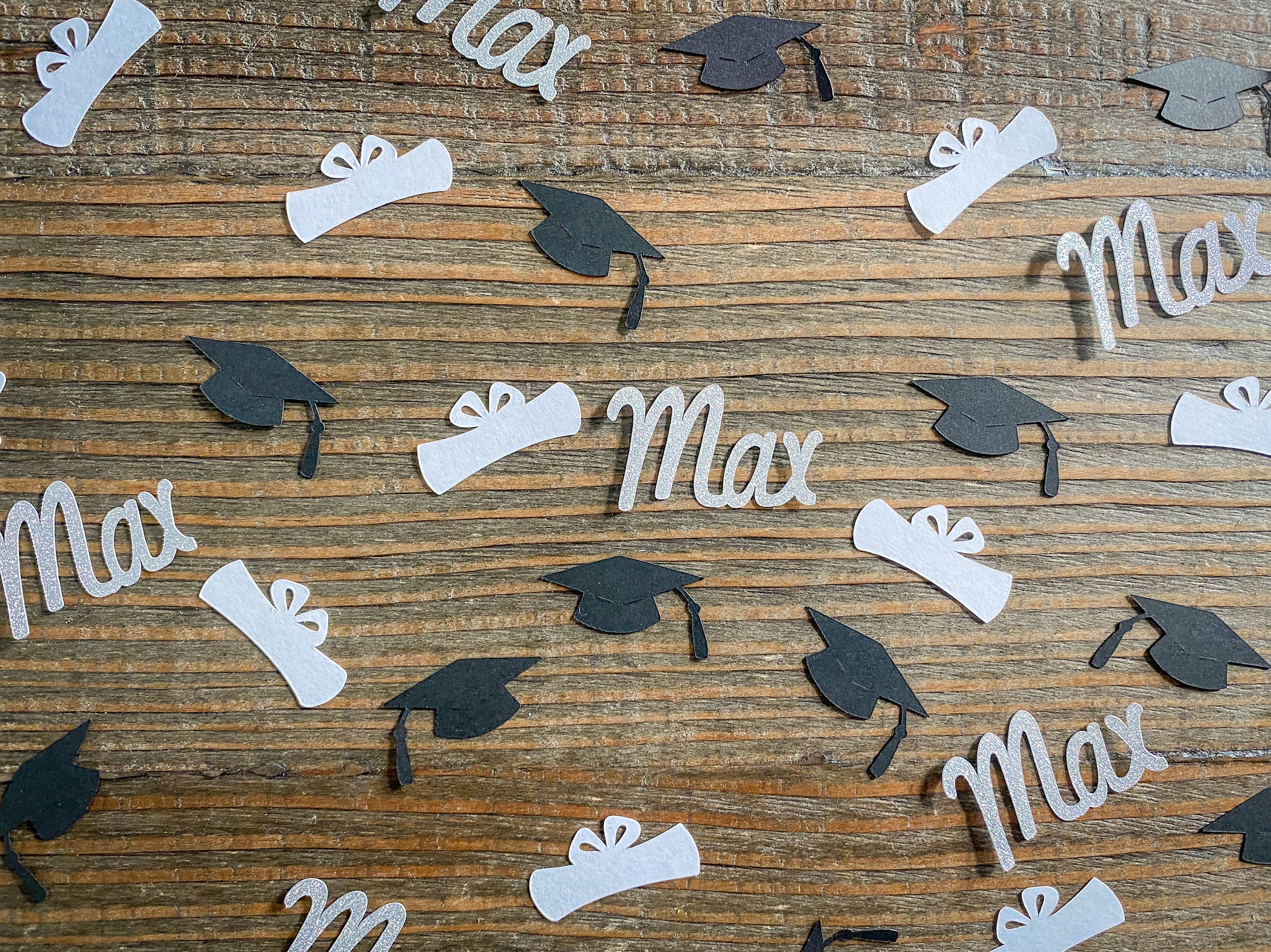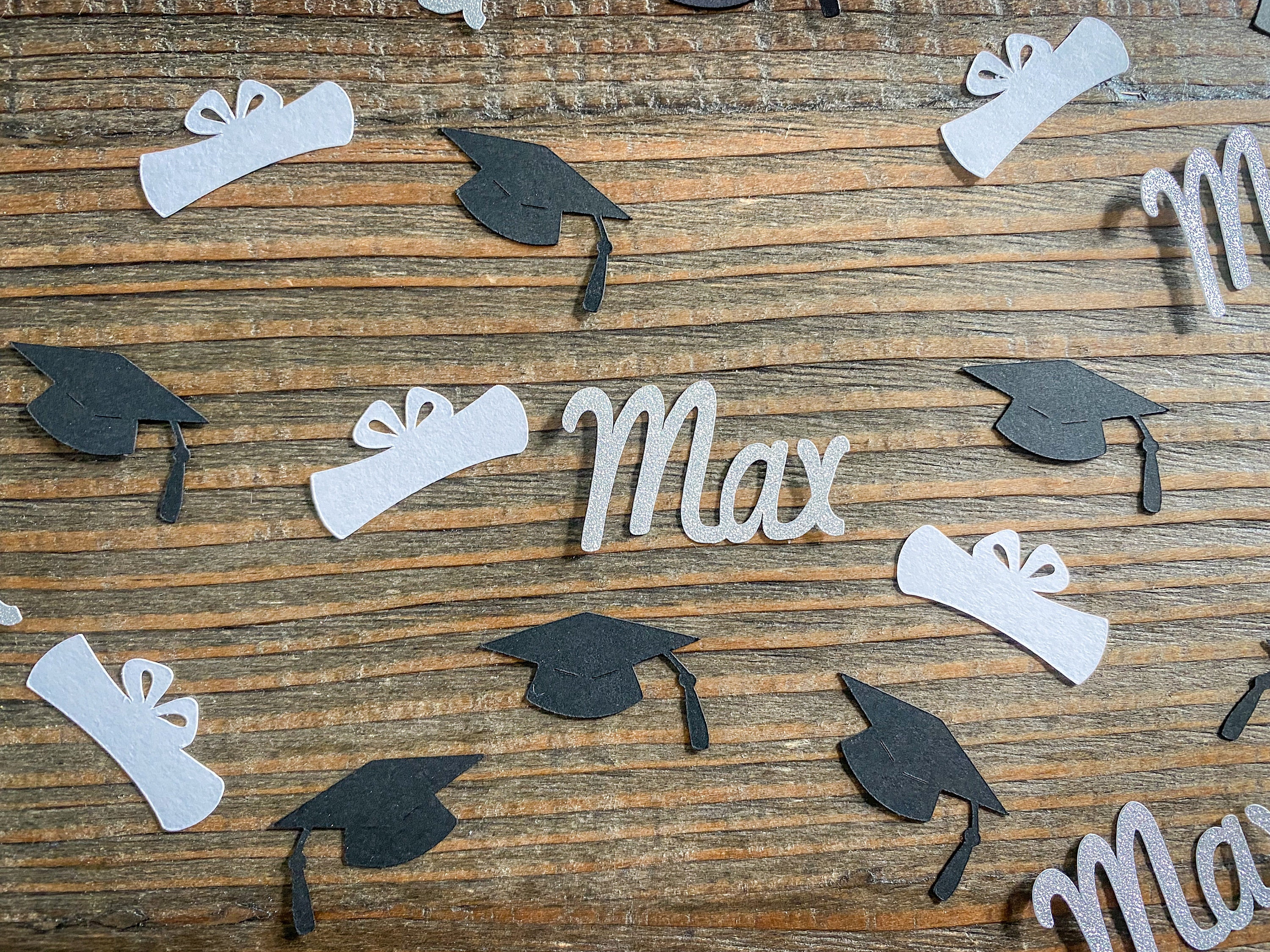 This listing is for 100 pieces of confetti! It includes 30 pieces of silver glitter name confetti, 35 pieces of black graduation caps, and 35 pieces of white diploma confetti. The name pieces are white on the reverse side and measure approximately 1 inch in height and the length varies based on the name. The graduation caps measure approximately 1.25 inches and the diplomas measure approximately 1.25 inches.