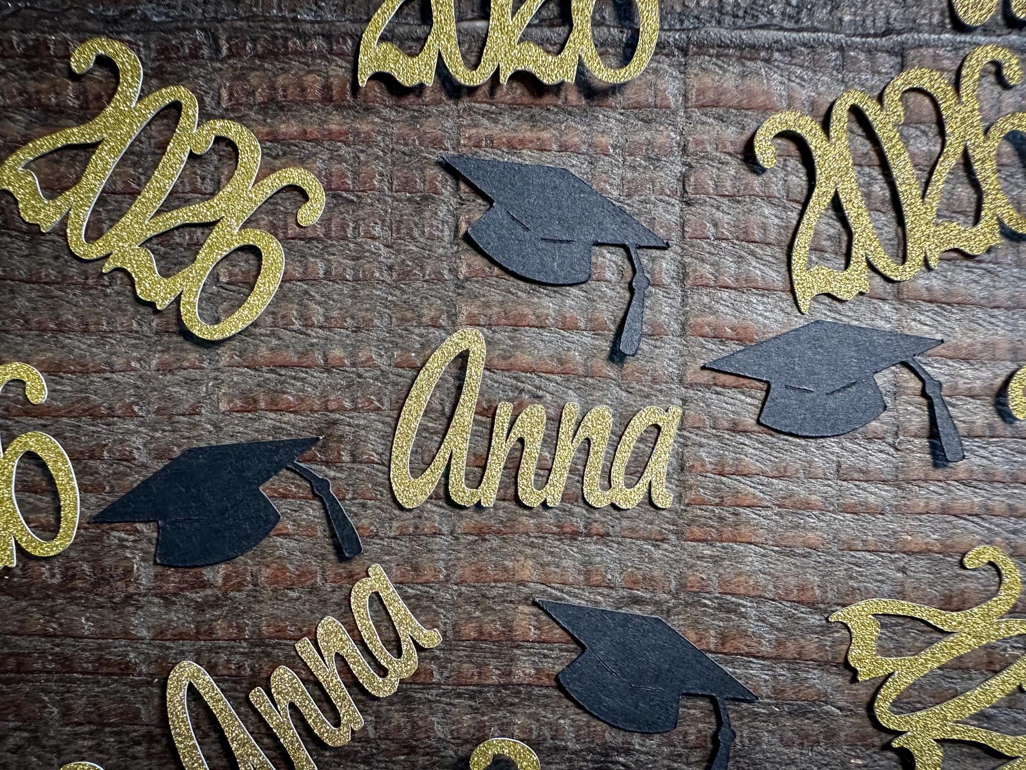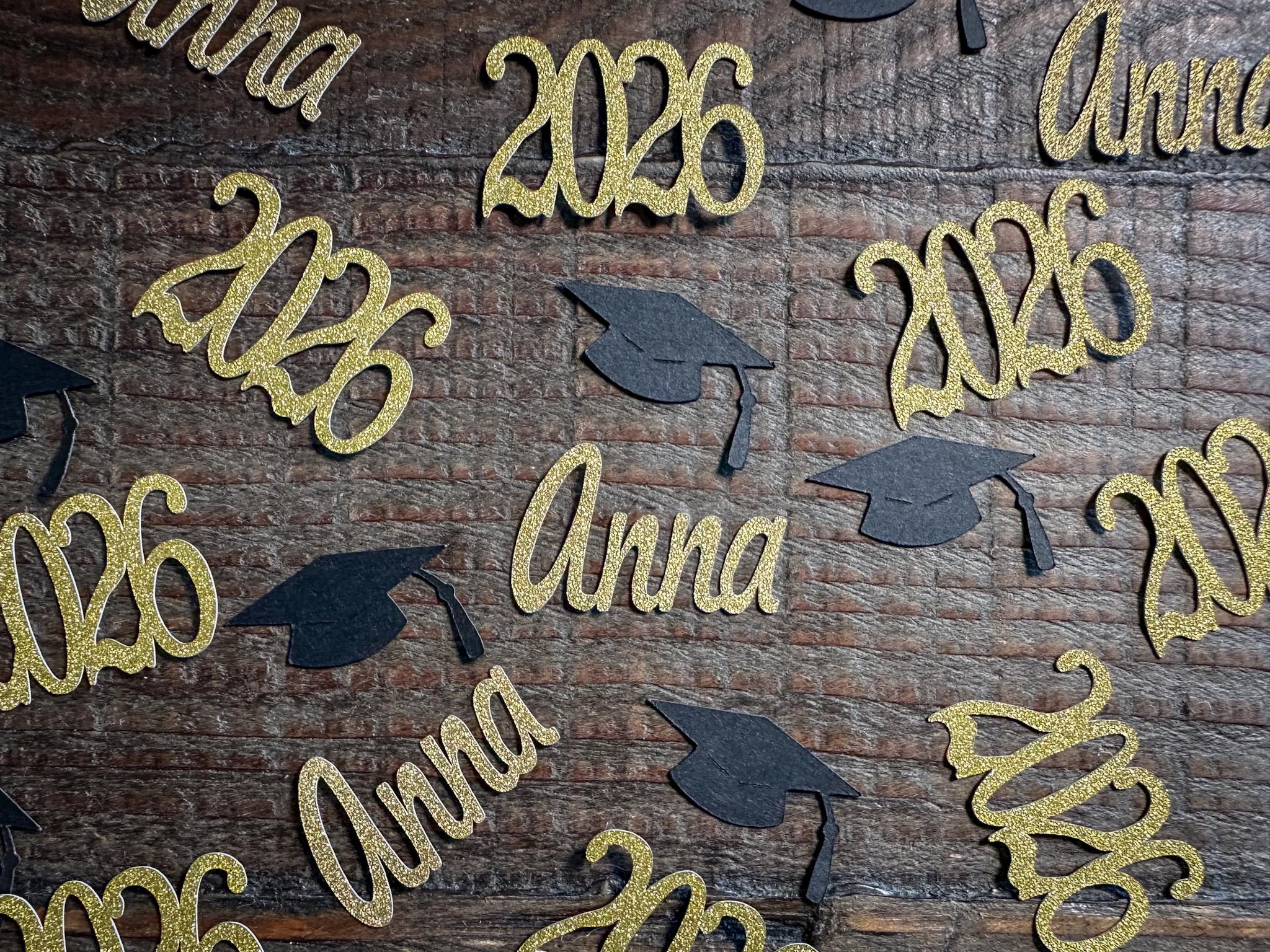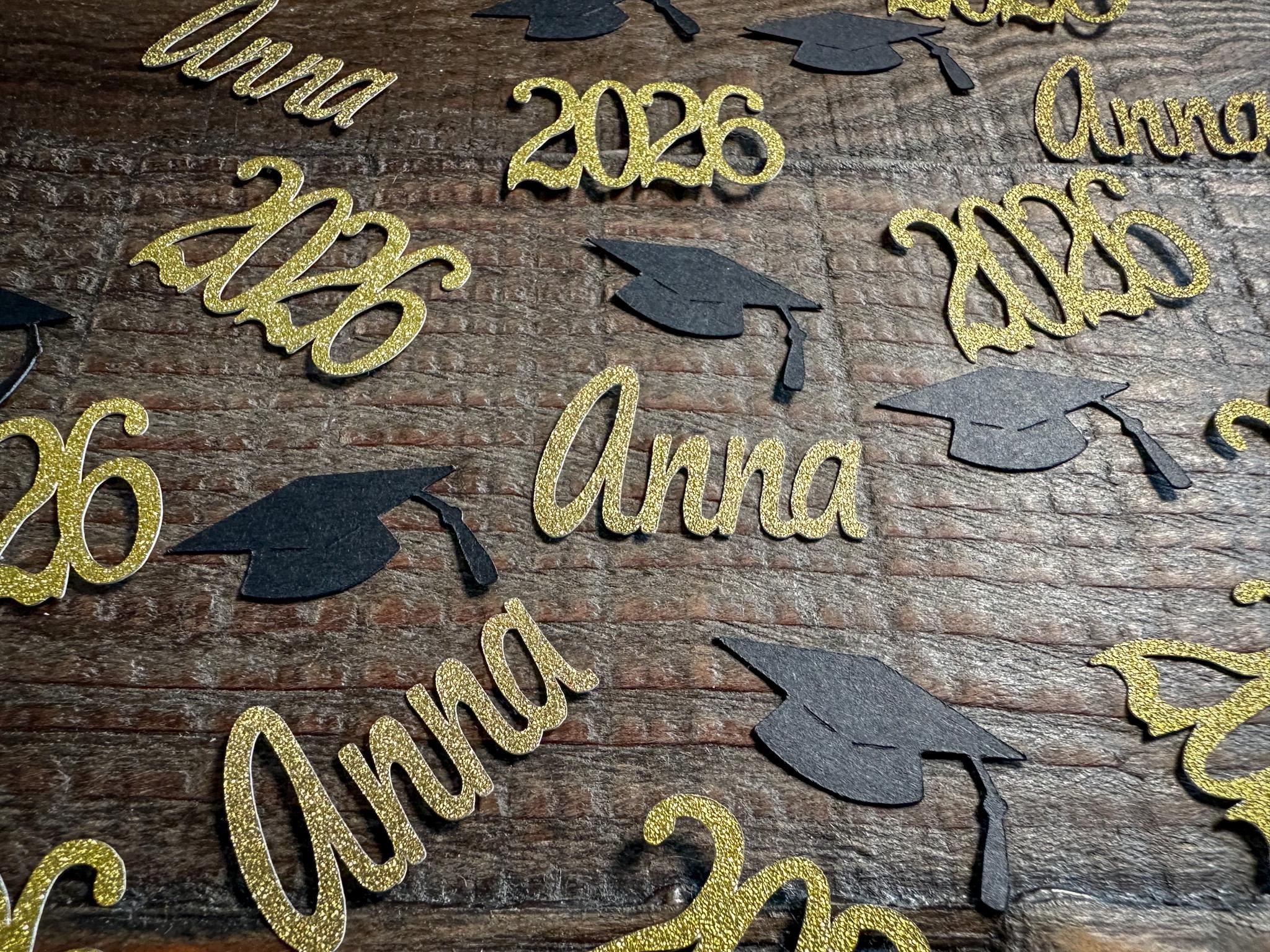 This listing is for 100 pieces of confetti. It includes 20 pieces of gold name confetti made with gold glitter paper (white on the reverse), 20 pieces of glitter gold 2026 (white on the reverse), and 60 pieces of black graduation caps. The name pieces measure approximately 1 inch in height and the length varies based on the name, the caps measure 1.25 inches, and the 2026 measure 1.25 inches.