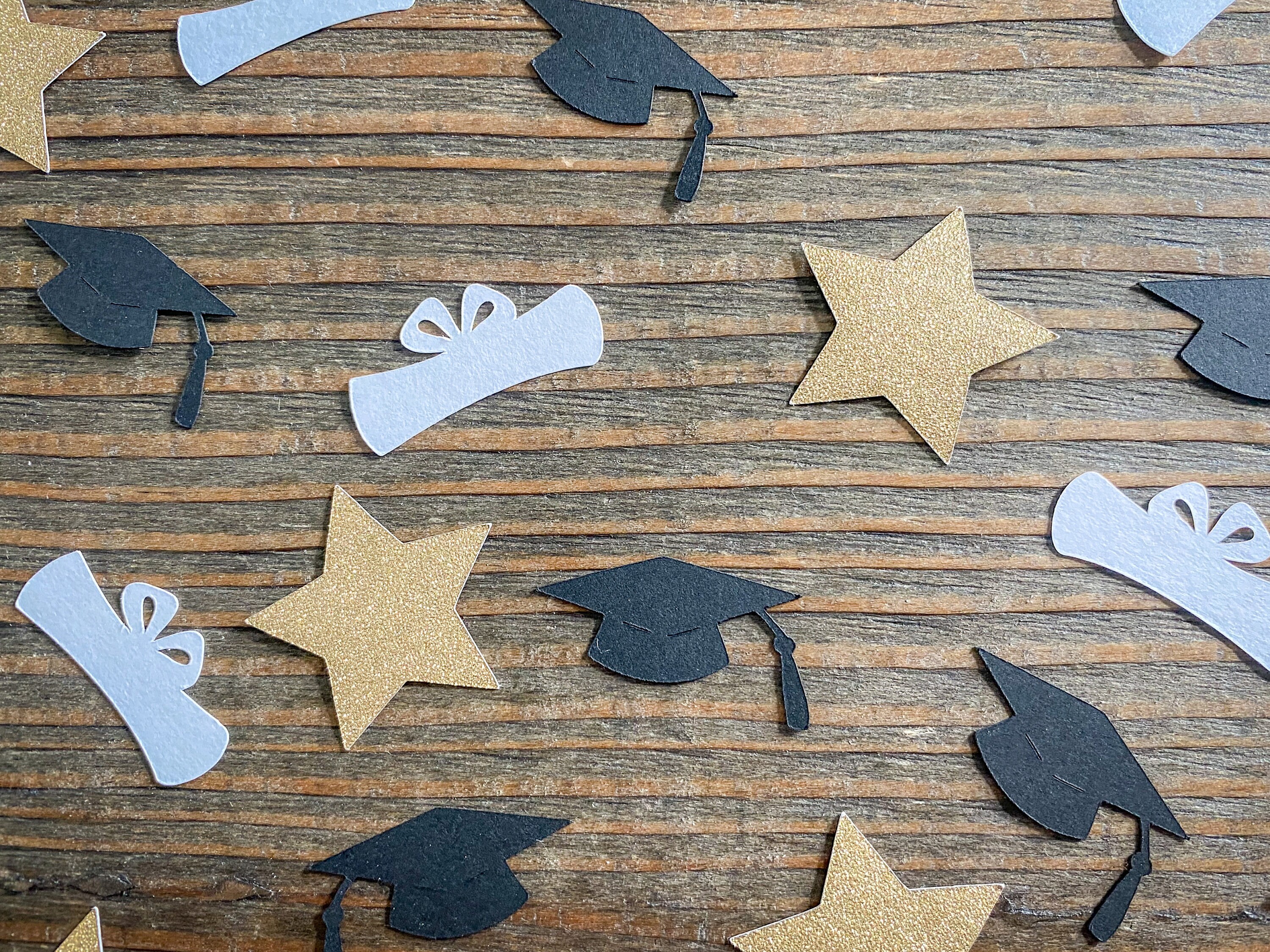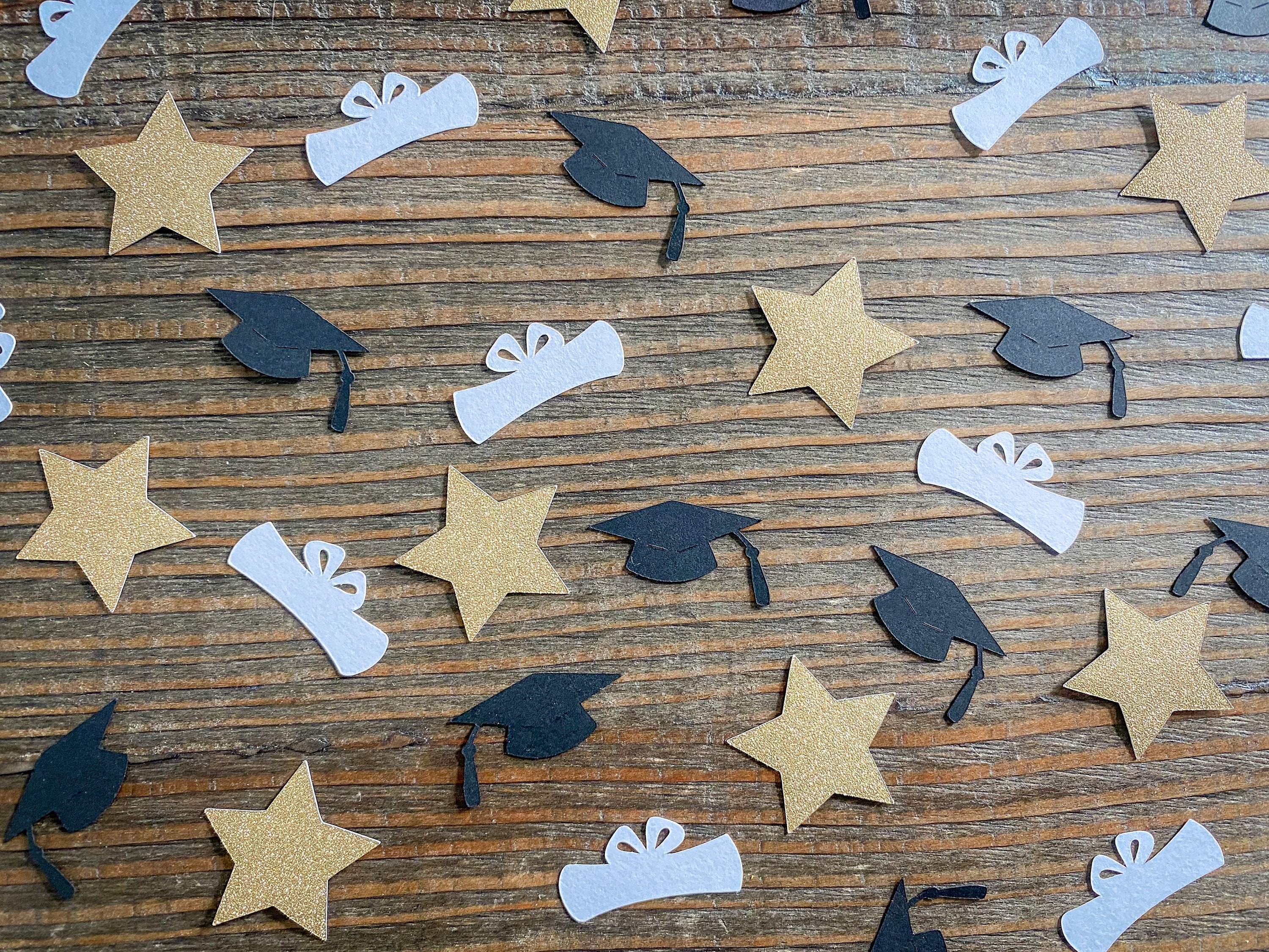 This listing is for 100 pieces of confetti! It includes 30 pieces of gold glitter star confetti, 35 pieces of black graduation caps, and 35 pieces of white diploma confetti. The star pieces are white on the reverse side and measure approximately 1.25 inches. The graduation caps measure approximately 1.25 inches and the diplomas measure approximately 1.25 inches.