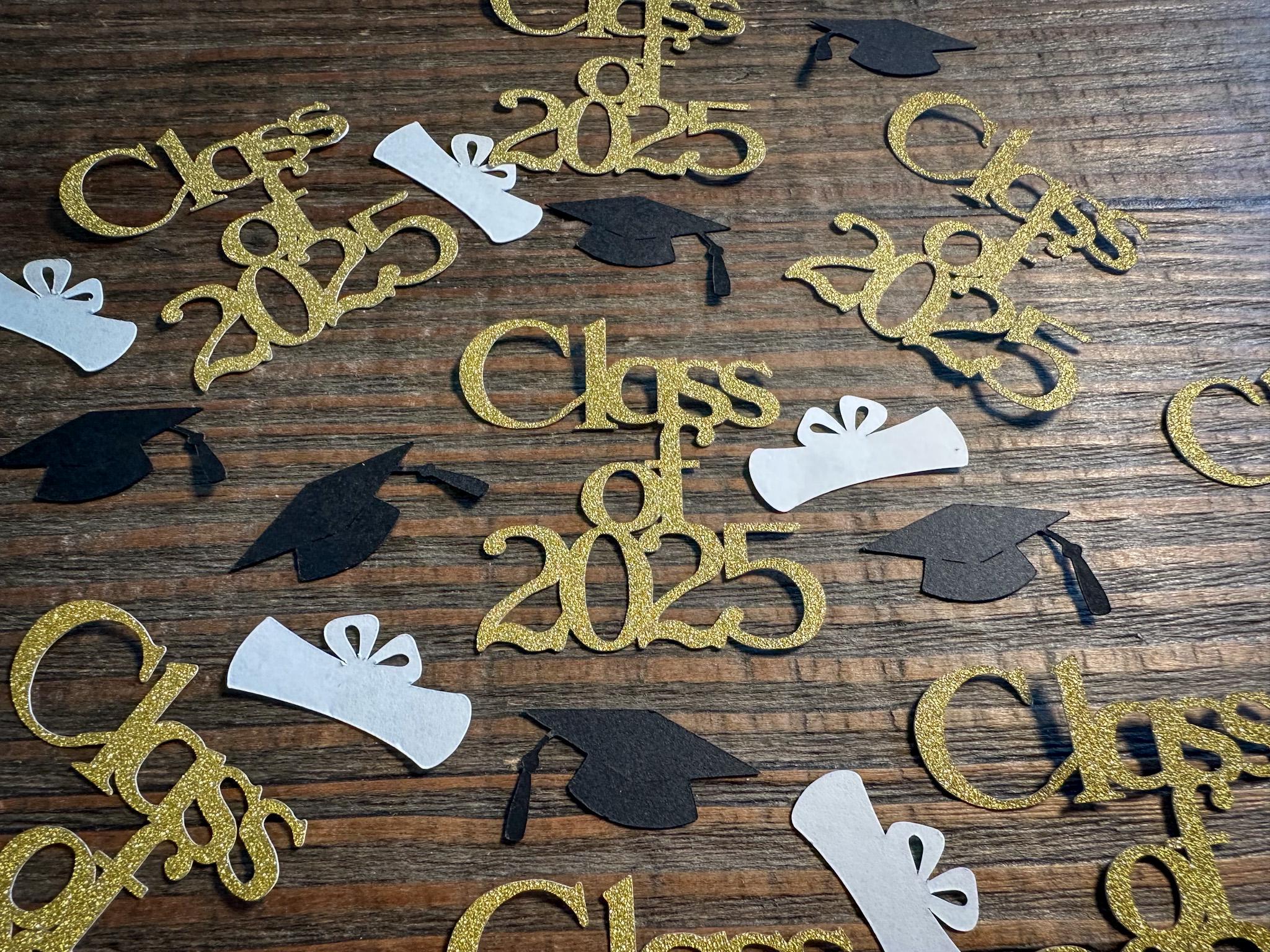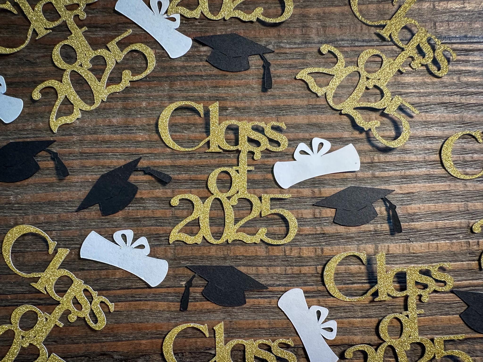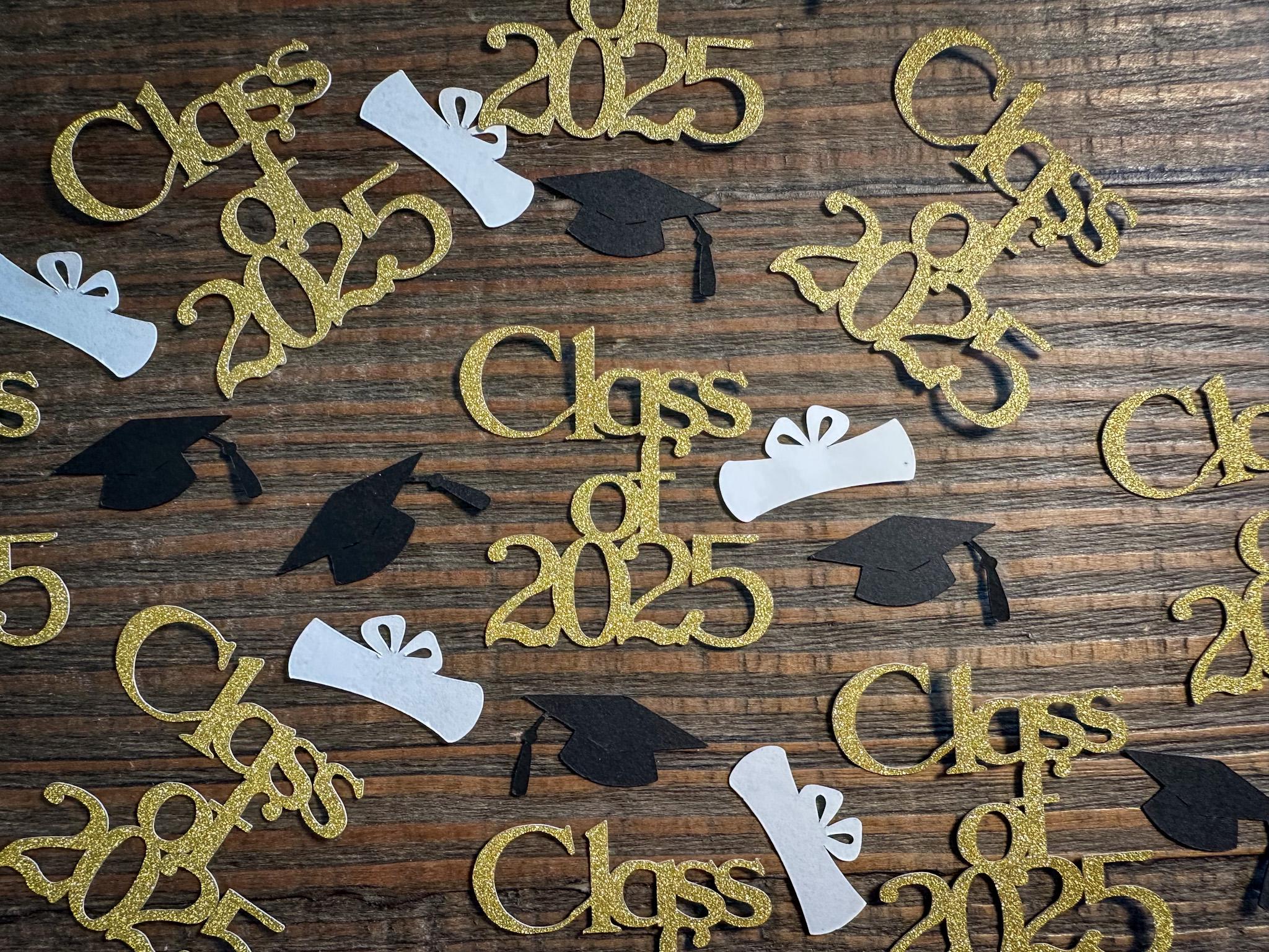 This listing is for 100 pieces of confetti! It includes 15 pieces of gold glitter class of 2025 confetti, 45 pieces of black graduation caps, and 40 pieces of white diploma confetti. The "class of 2025" pieces are white on the reverse side and measure approximately 2 inches in height by 2 inches in width. The graduation caps measure approximately 1.25 inches and the diplomas measure approximately 1.25 inches.