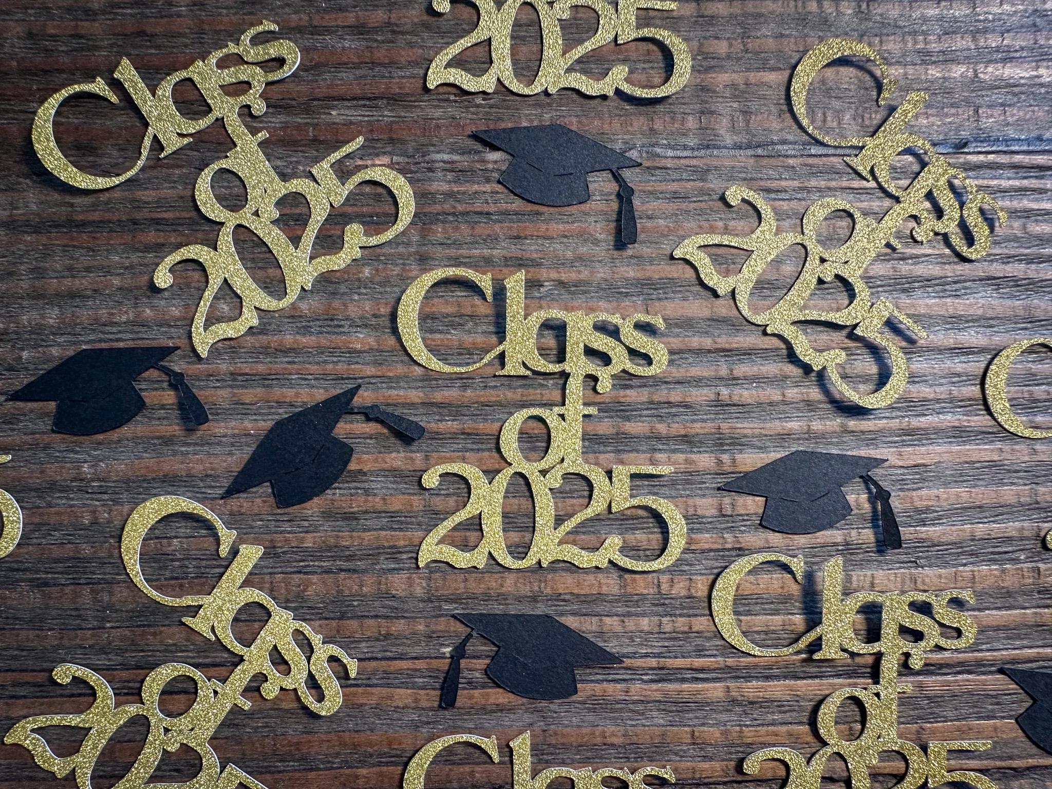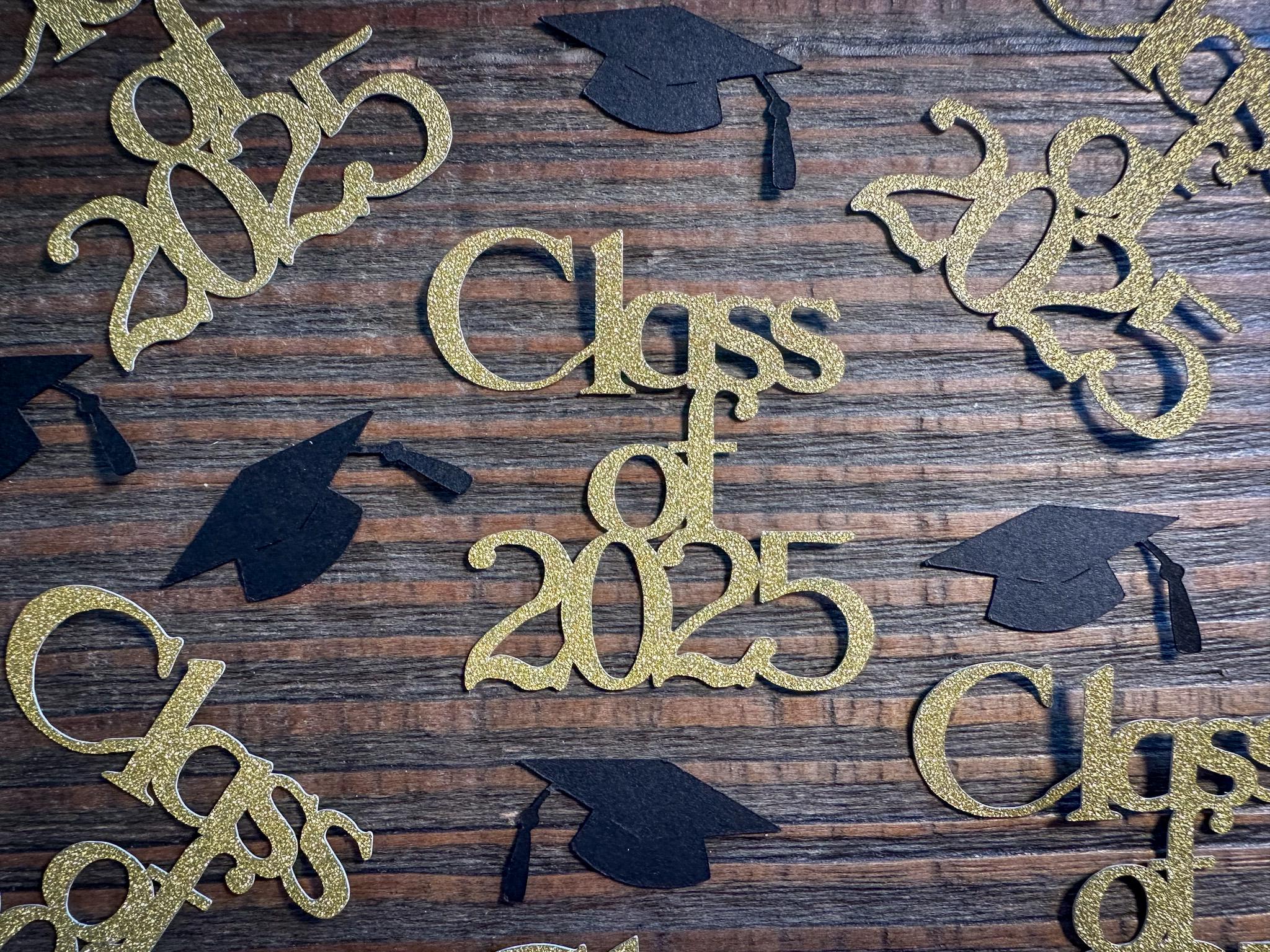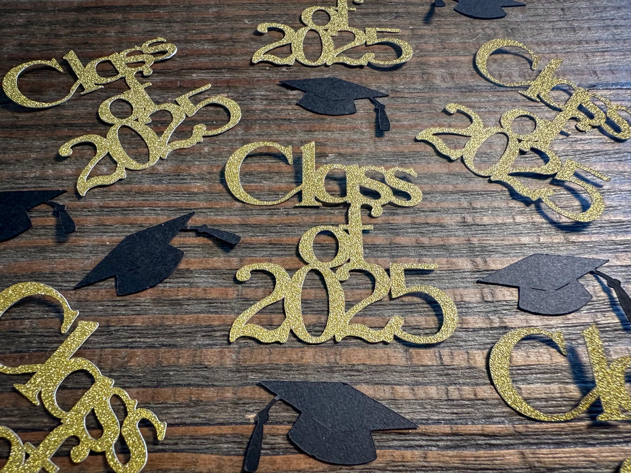 This listing is for 100 pieces of confetti! It includes 15 pieces of gold glitter class of 2025 confetti and 85 pieces of black graduation caps. The "class of 2025" pieces are white on the reverse side and measure approximately 2 inches in height by 2 inches in width. The graduation caps measure approximately 1.25 inches.