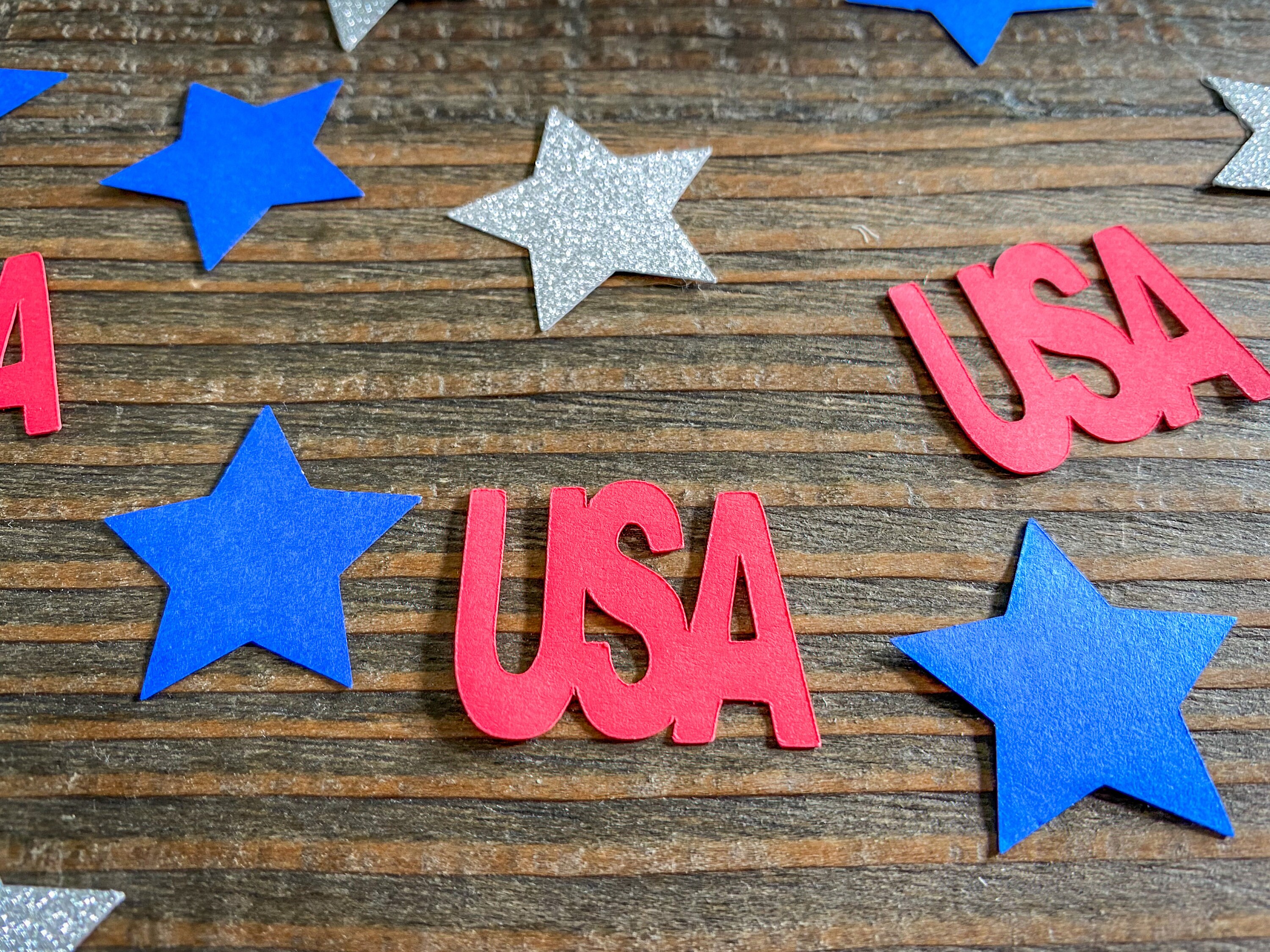 This listing is for 100 pieces of confetti! It includes blue and silver stars that measure approximately 1.25 inches. The silver stars are white on the reverse side. It also includes red USA pieces that measure approximately 1.25 inches.