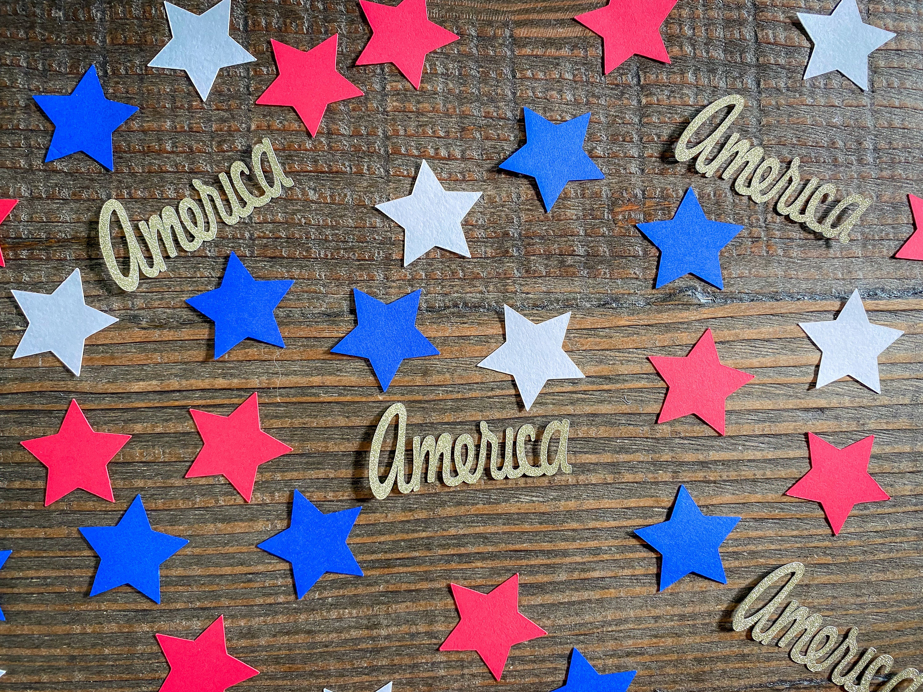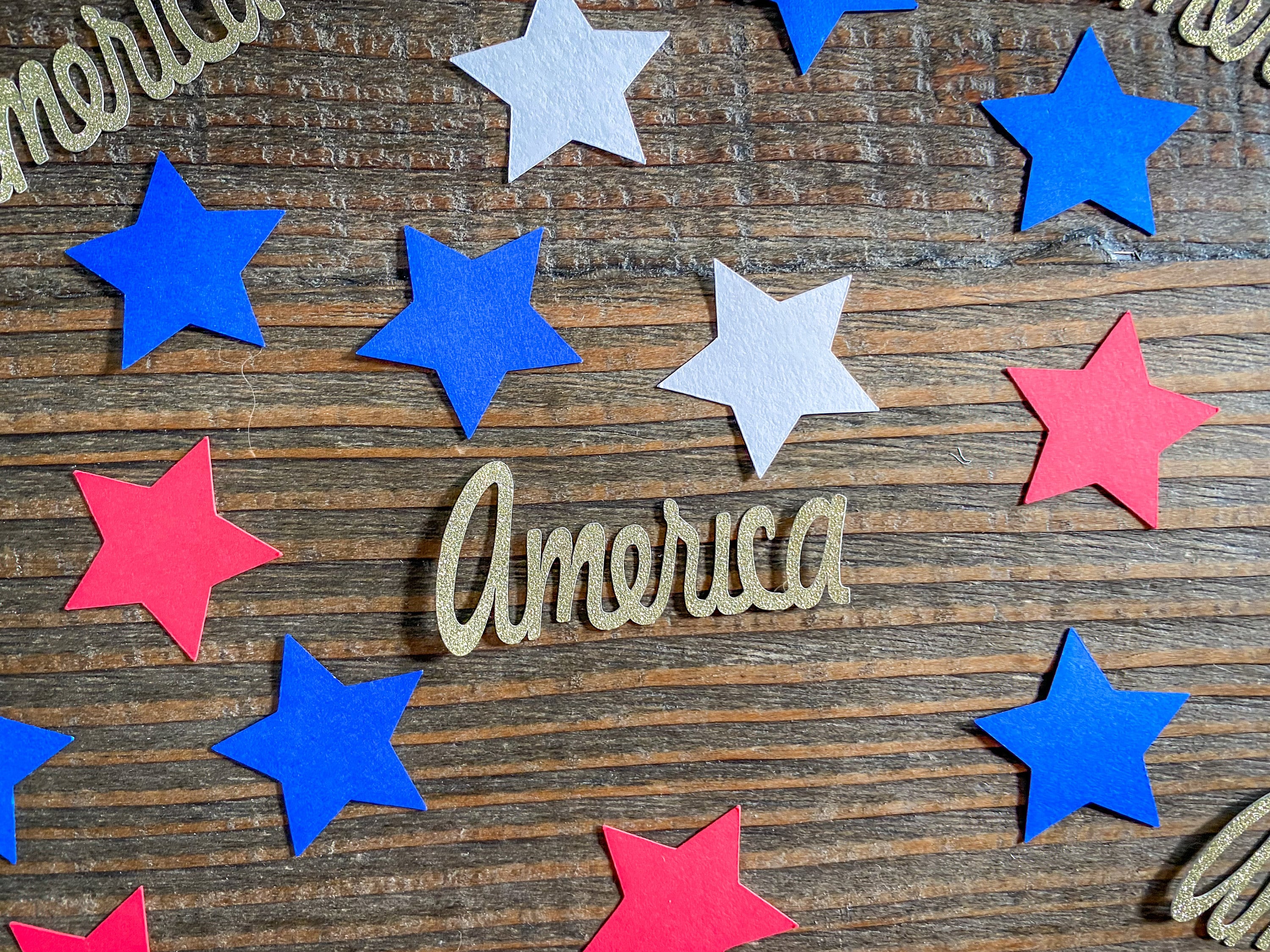 This listing is for 100 pieces of confetti! It includes 25 pieces of gold glitter America confetti which is white on the reverse side, 25 pieces of white stars, 25 pieces of blue stars, and 25 pieces of red stars. The star measure approximately 1.25 inches.