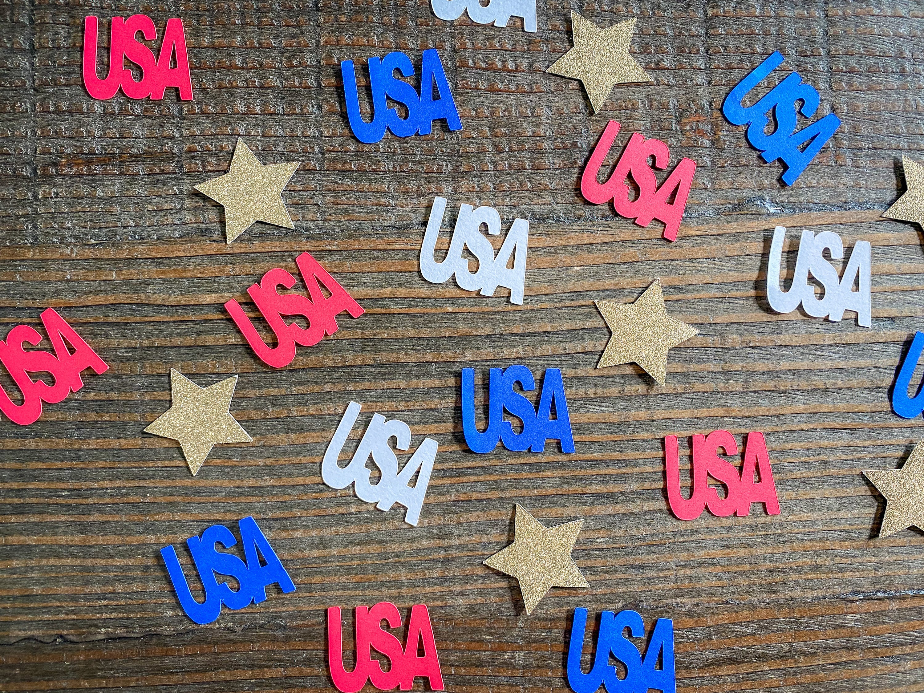 This listing is for 100 pieces of confetti! It includes 25 red, 25 white and 25 blue USA pieces made from premium cardstock that measure approximately 1 inch in height by 1.25 inches wide. It also includes 25 glitter gold stars that are white on the reverse side that measure approximately 1.25 inches.