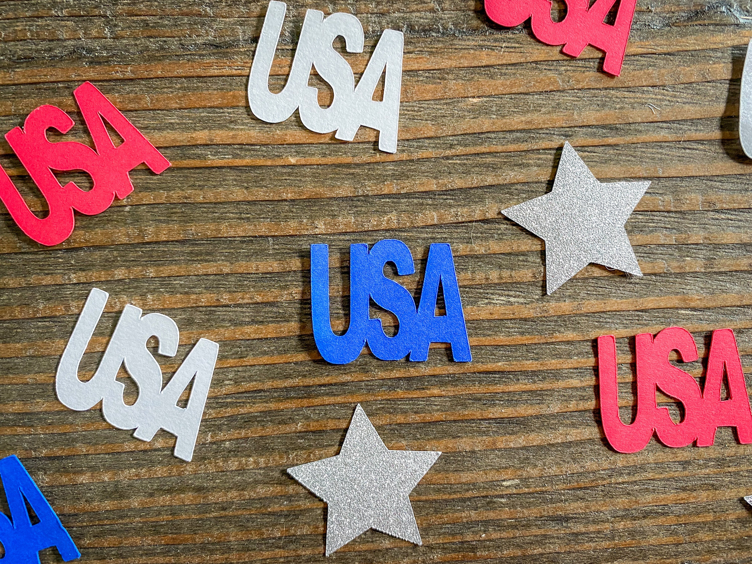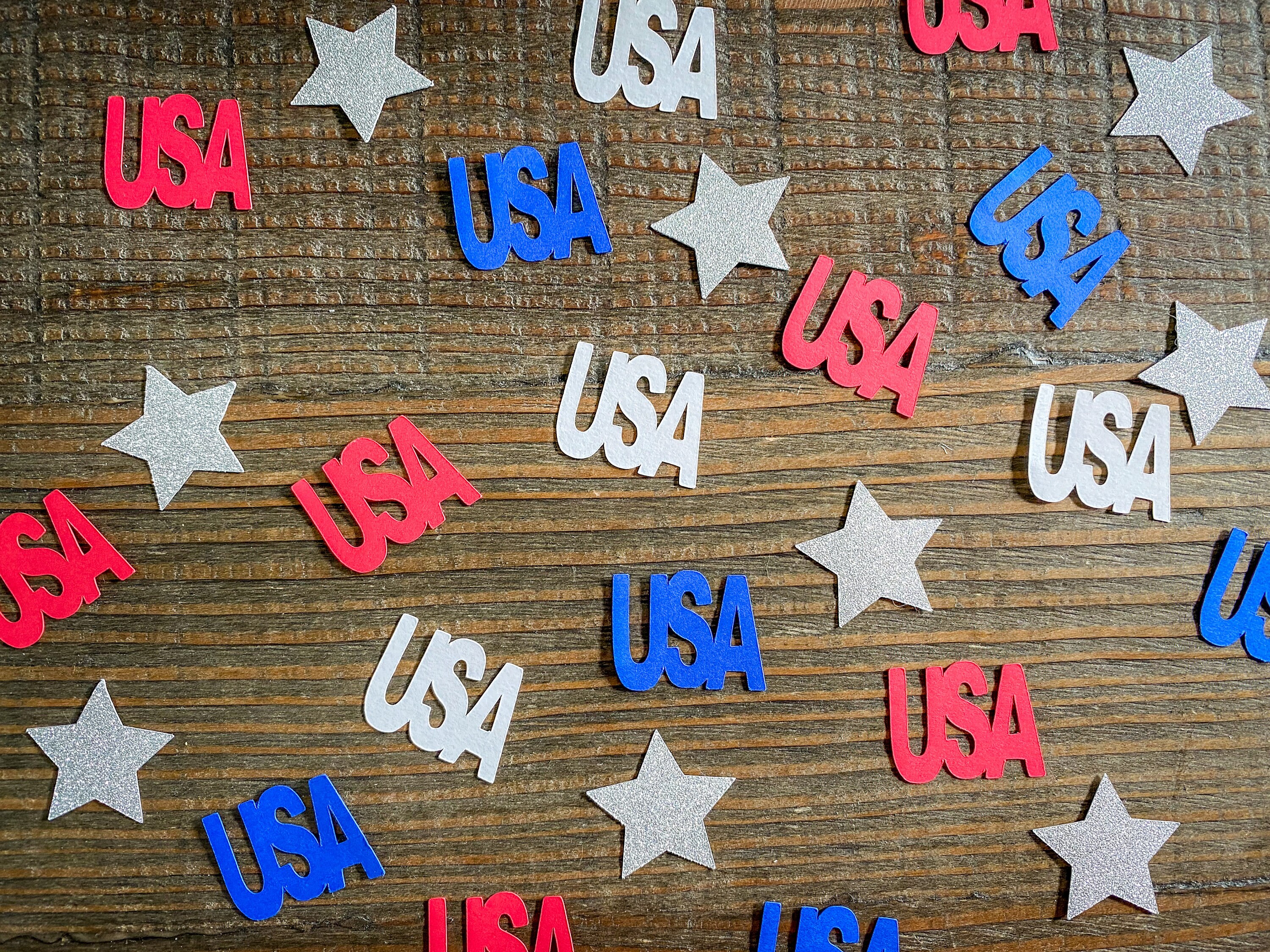This listing is for 100 pieces of confetti! It includes 25 red, 25 white and 25 blue USA pieces made from premium cardstock that measure approximately 1 inch in height by 1.25 inches wide. It also includes 25 glitter silver stars that are white on the reverse side that measure approximately 1.25 inches.