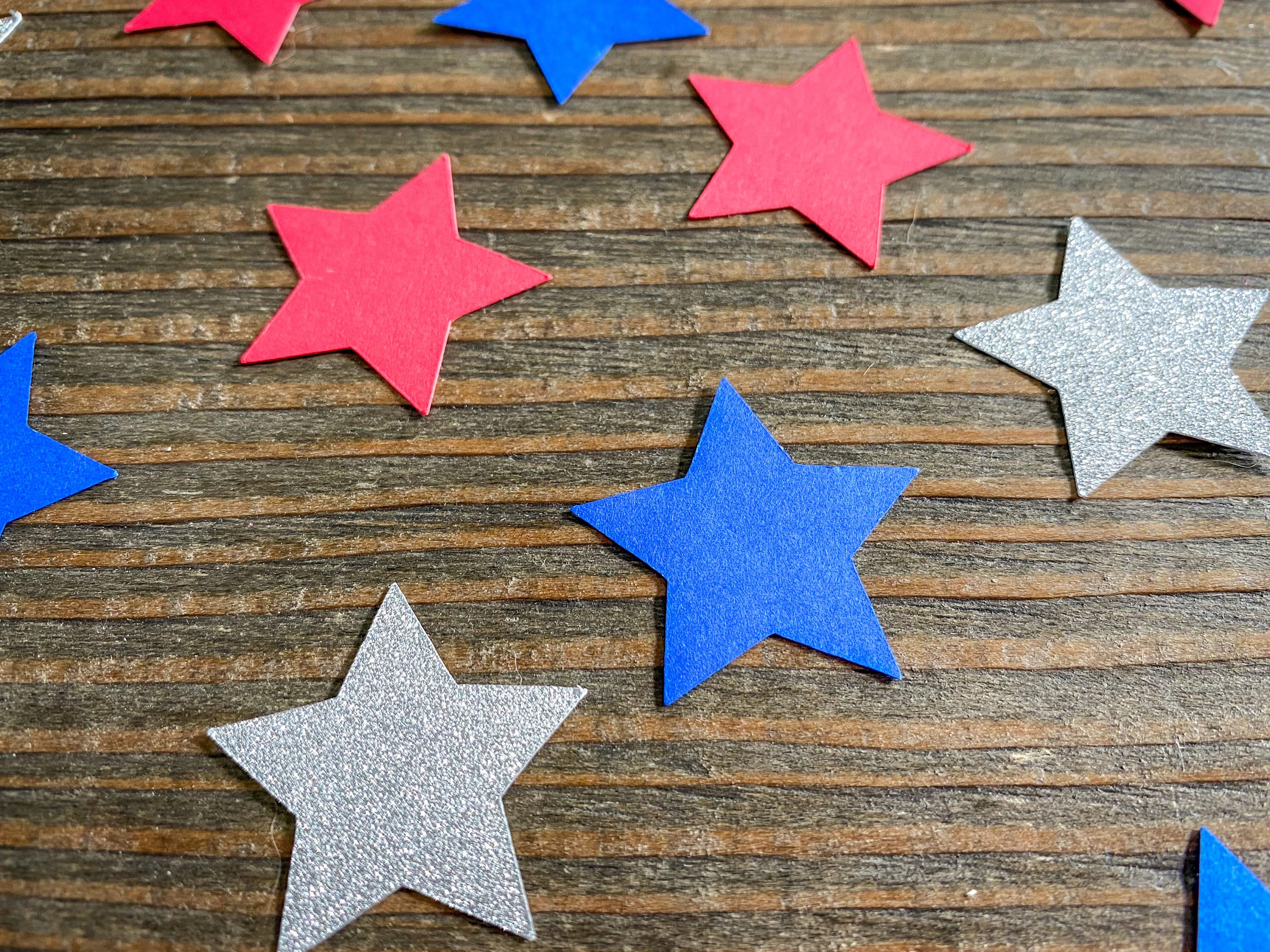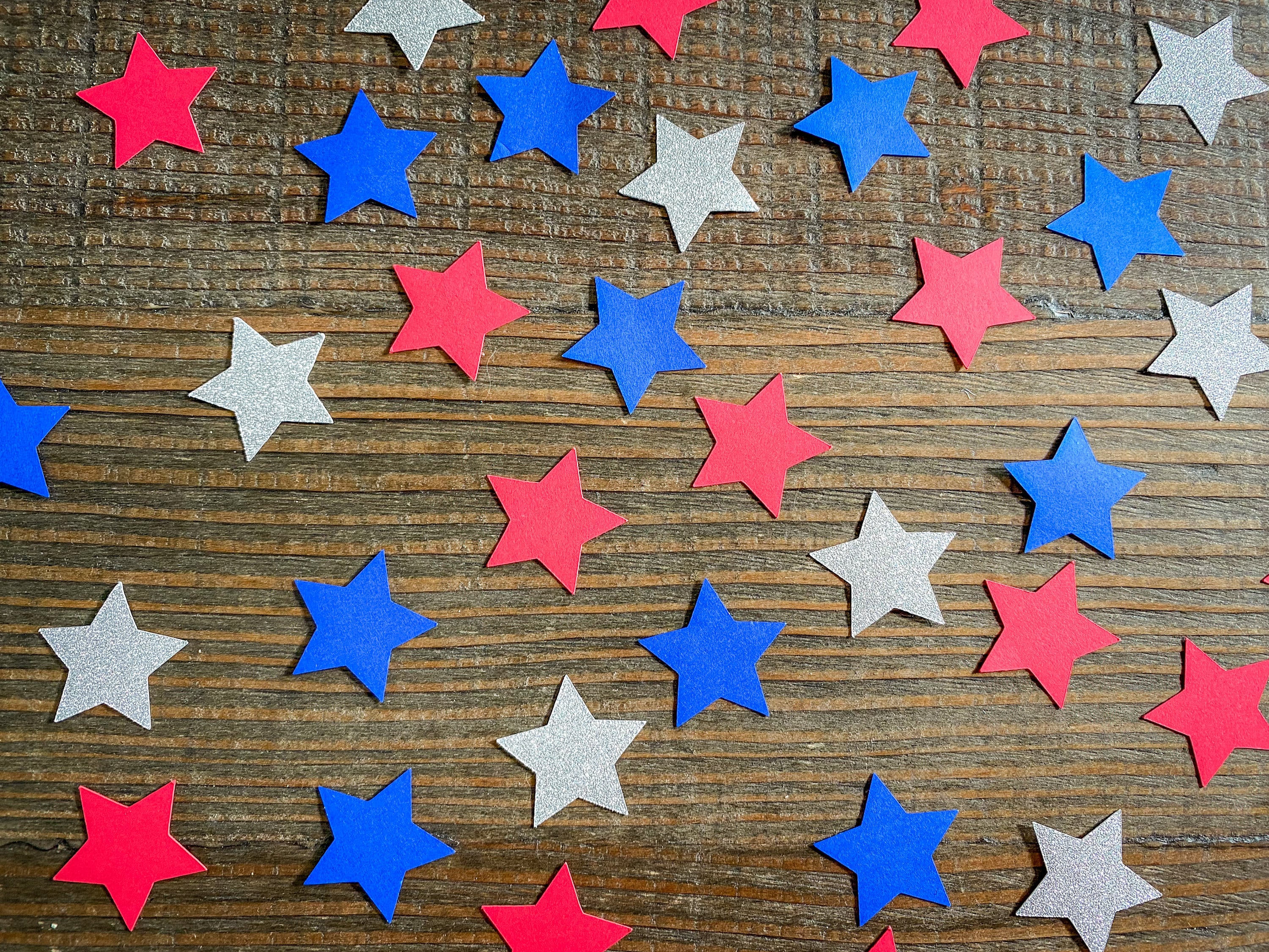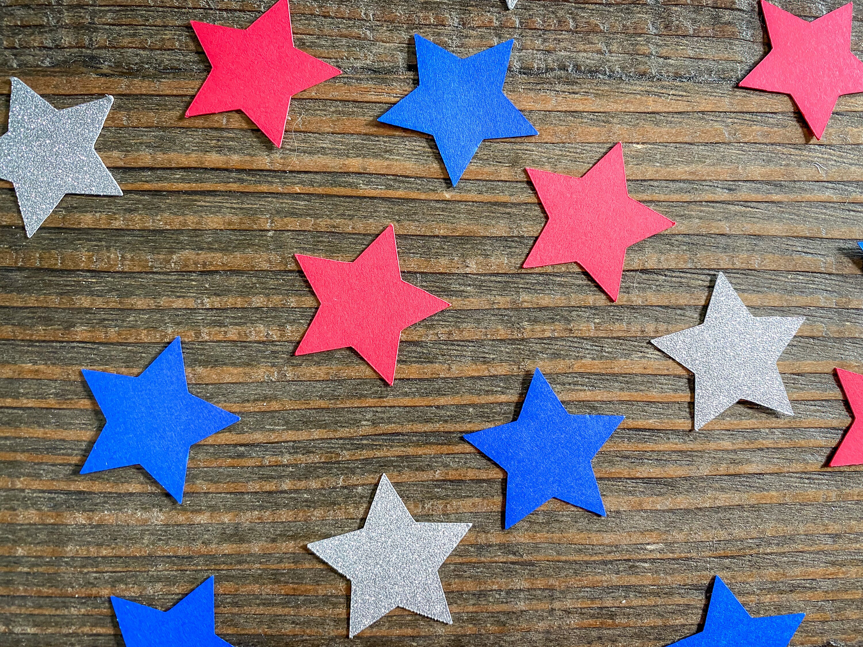This listing is for 100 pieces of confetti! It includes red, blue, and silver stars that measure approximately 1.25 inches. The silver stars are white on the reverse side.