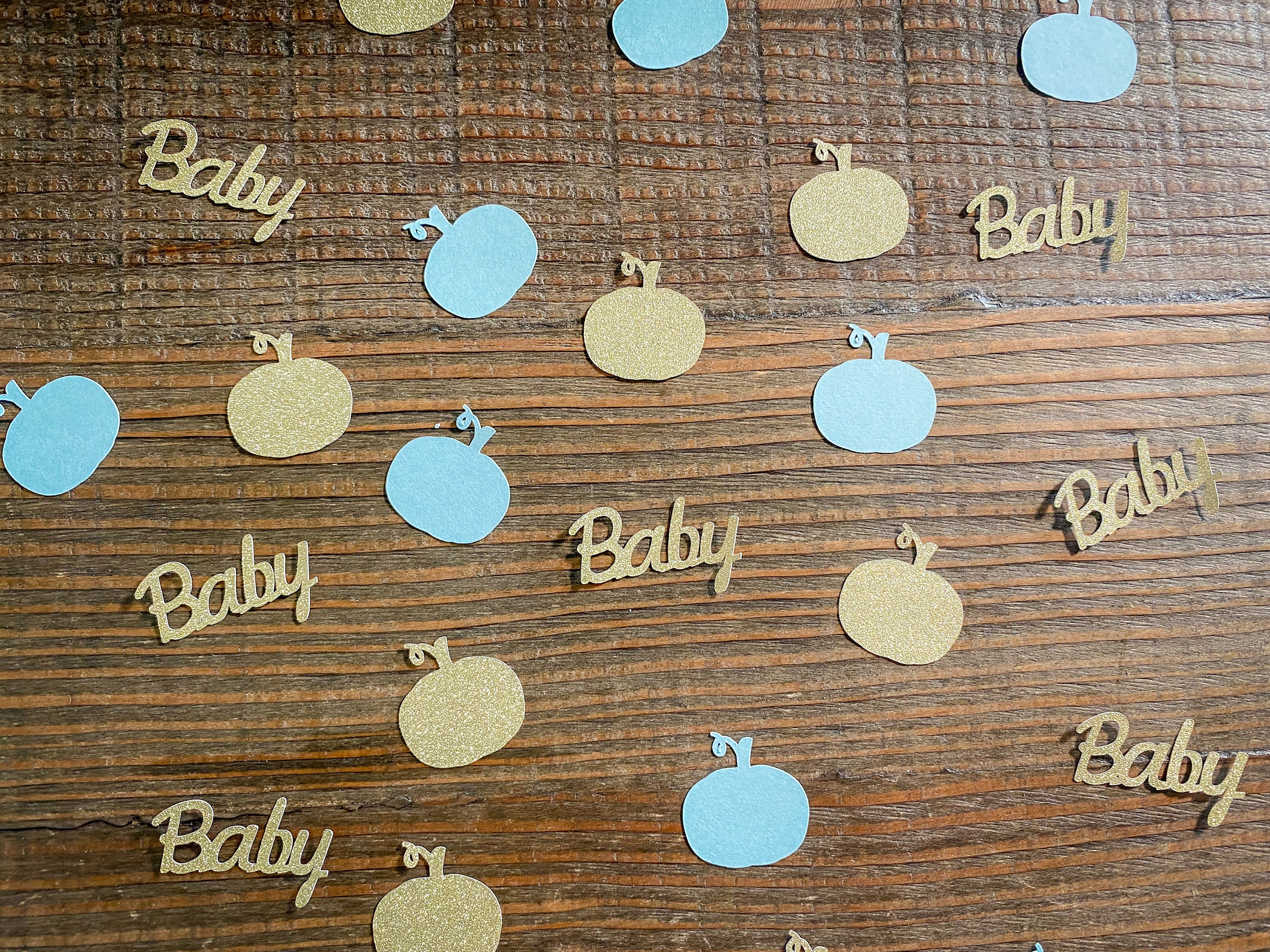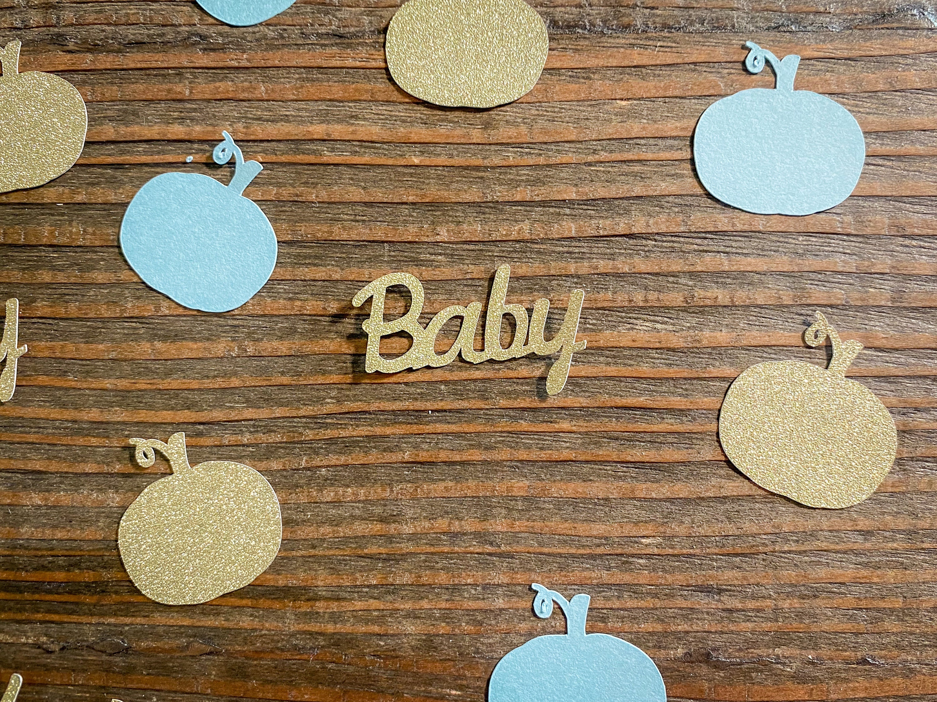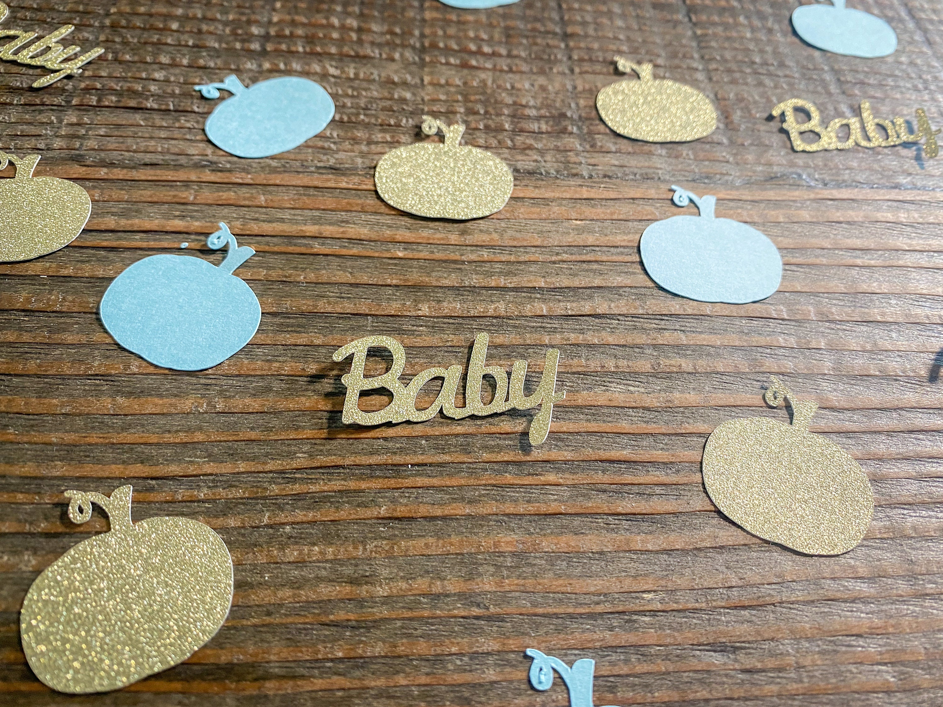 This listing is for 100 pieces of confetti! It includes 25 pieces of glitter gold baby confetti, 25 pieces of gold glitter pumpkins, and 50 pieces of light blue pumpkins. The pumpkins measure approximately 1.25 inches and the gold ones are white on the reverse side.