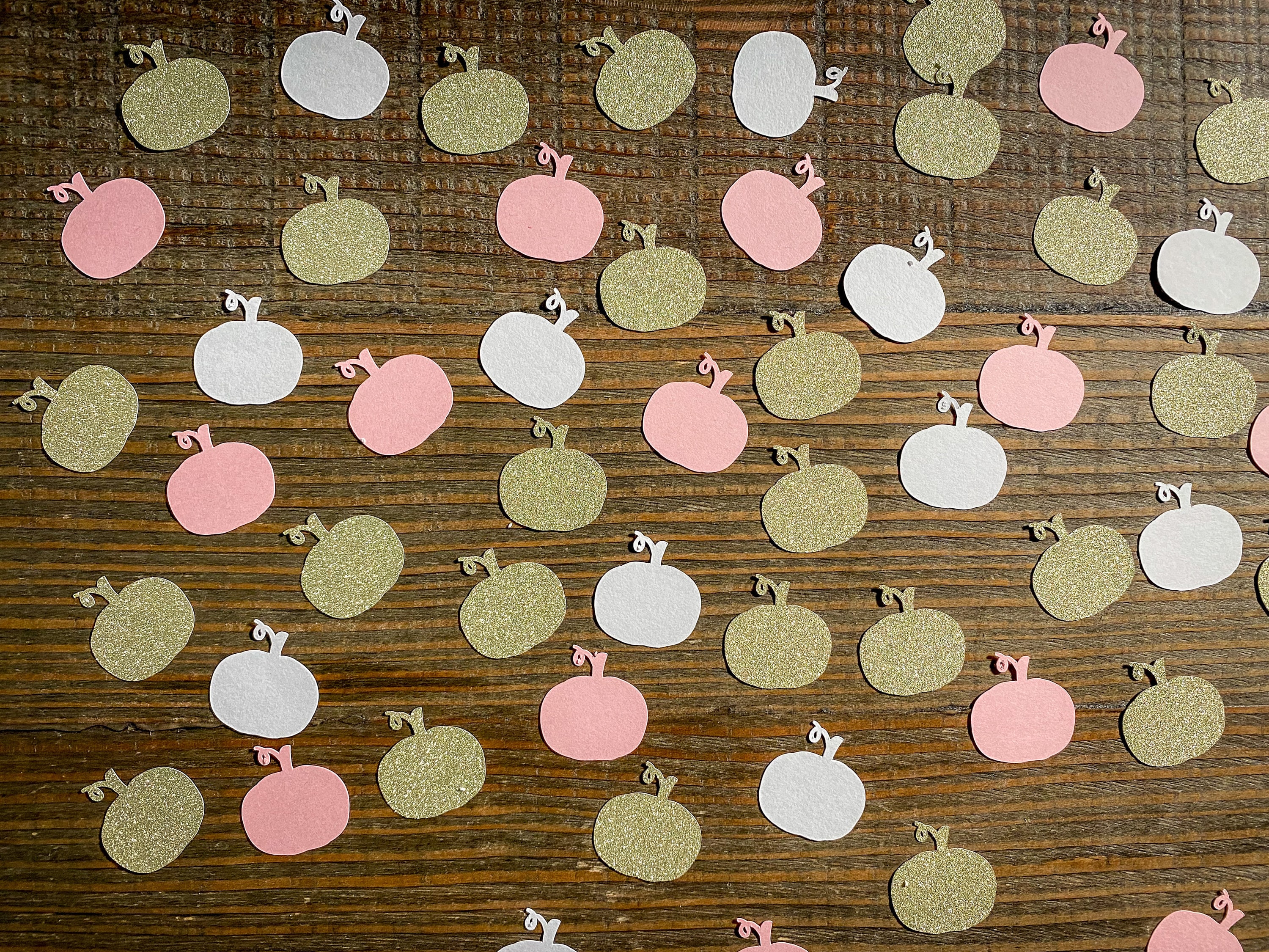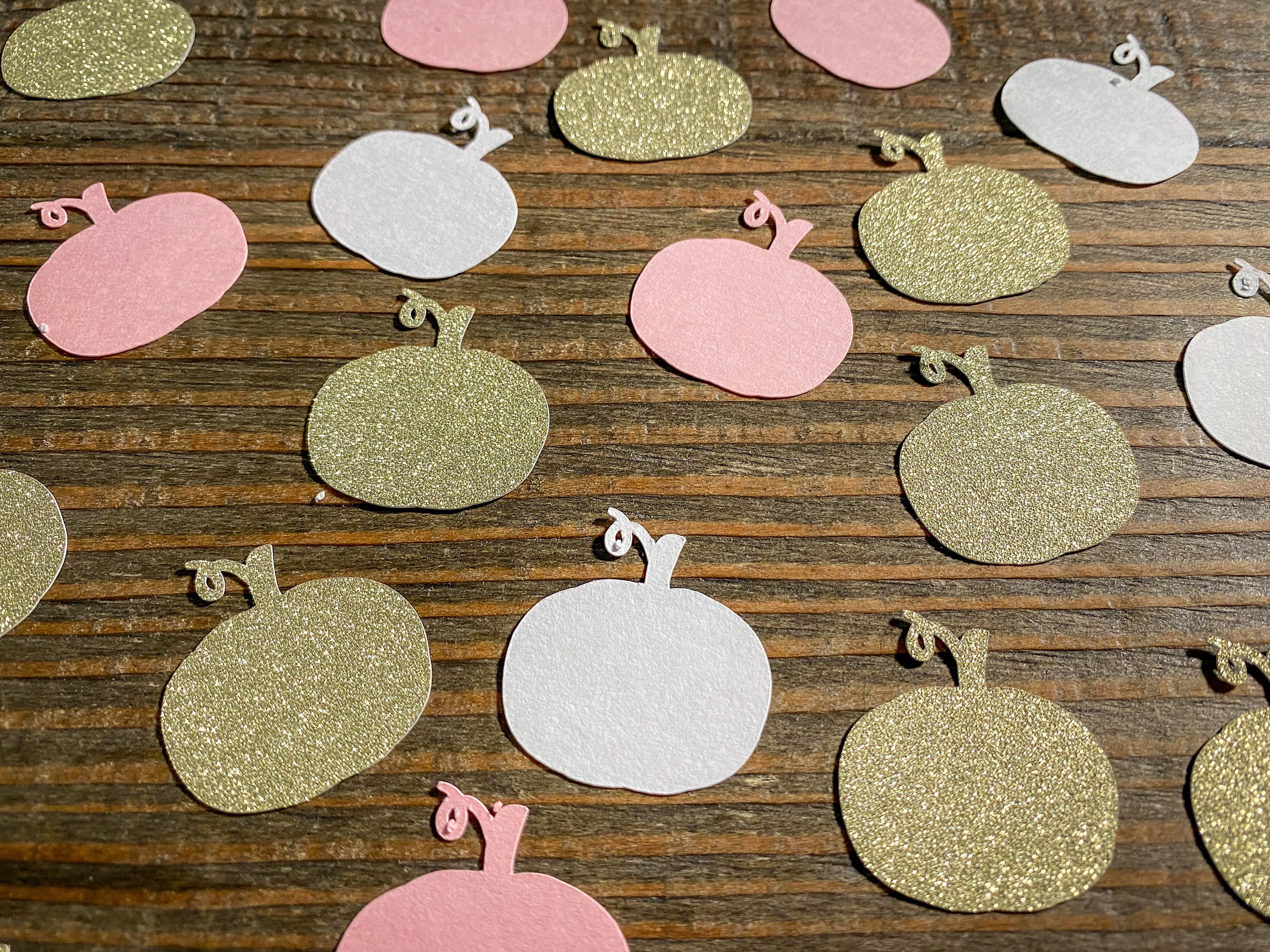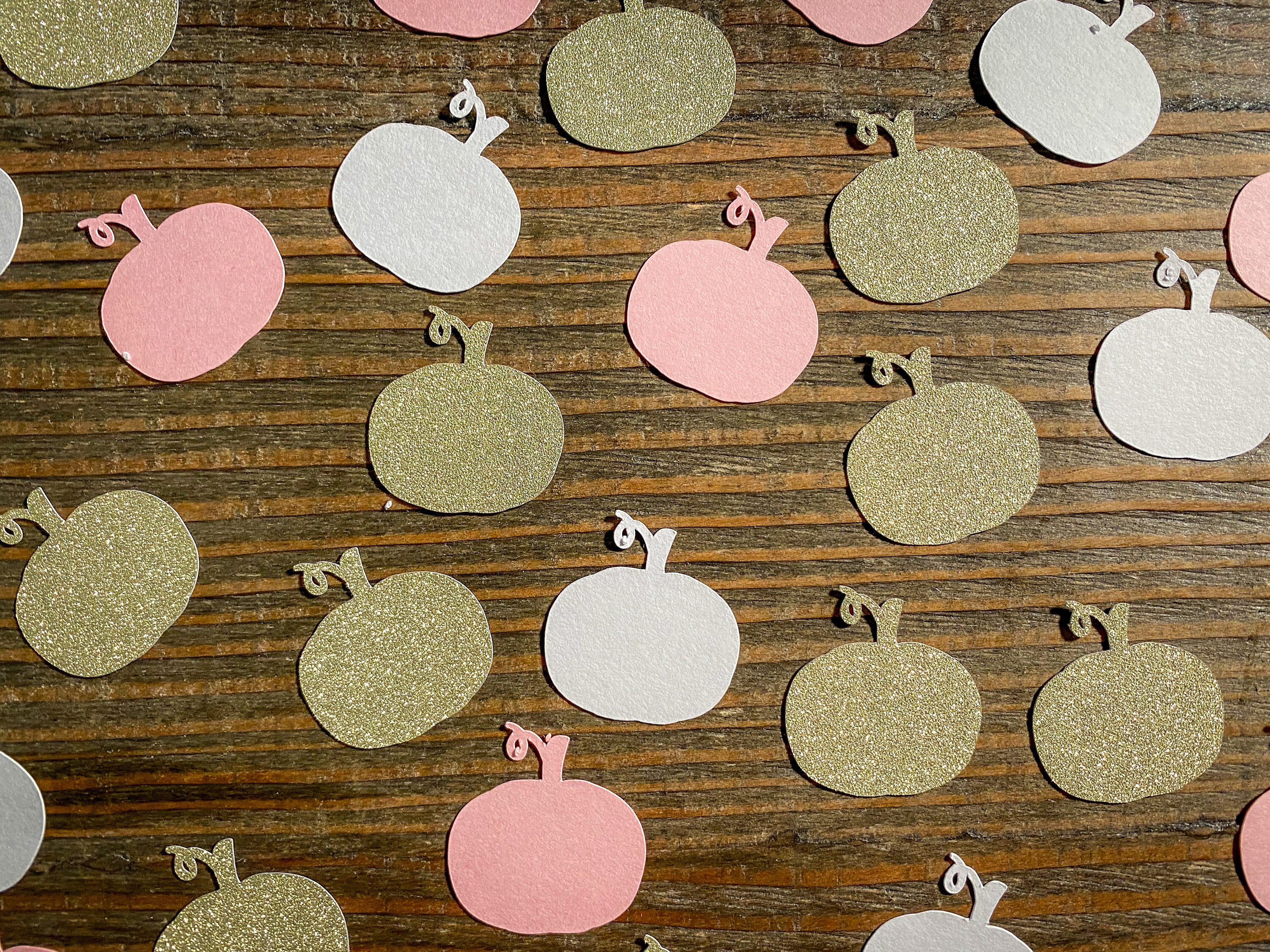 This listing is for 100 pieces of confetti! It includes 25 pieces of glitter gold pumpkins, 35 pieces of light pink pumpkins, and 40 pieces of white pumpkins. The pumpkins measure approximately 1.25 inches and the gold ones are white on the reverse side.