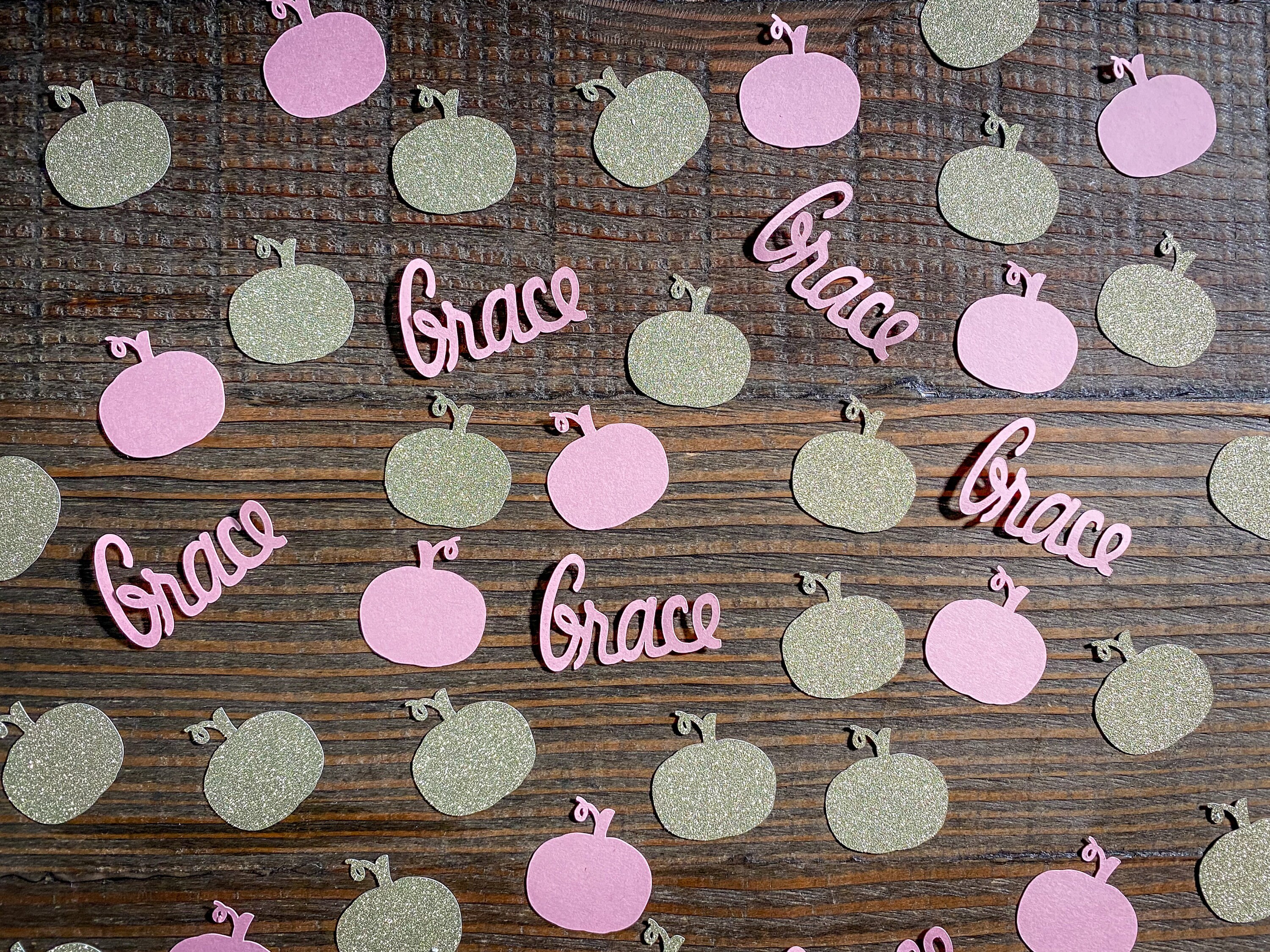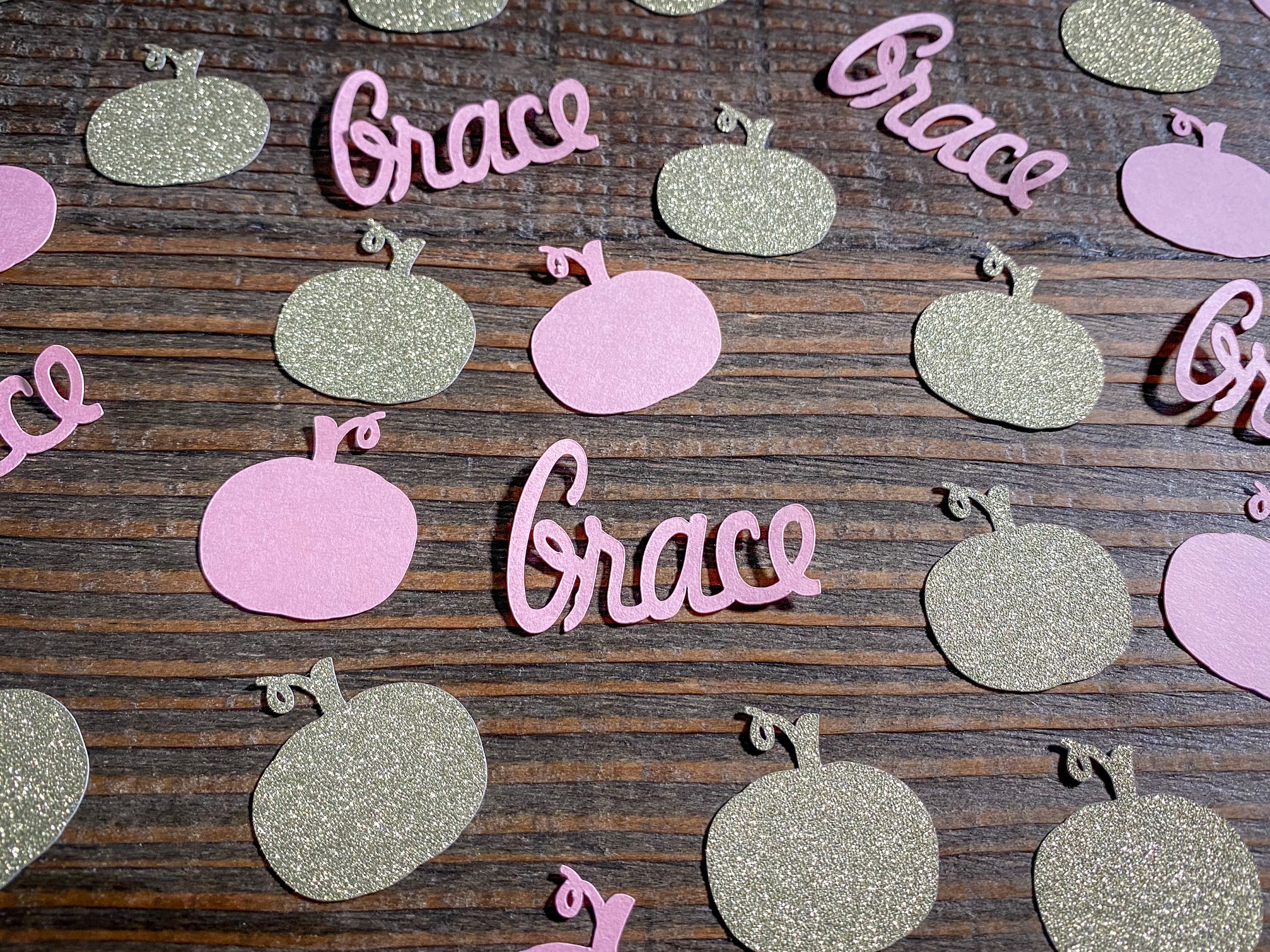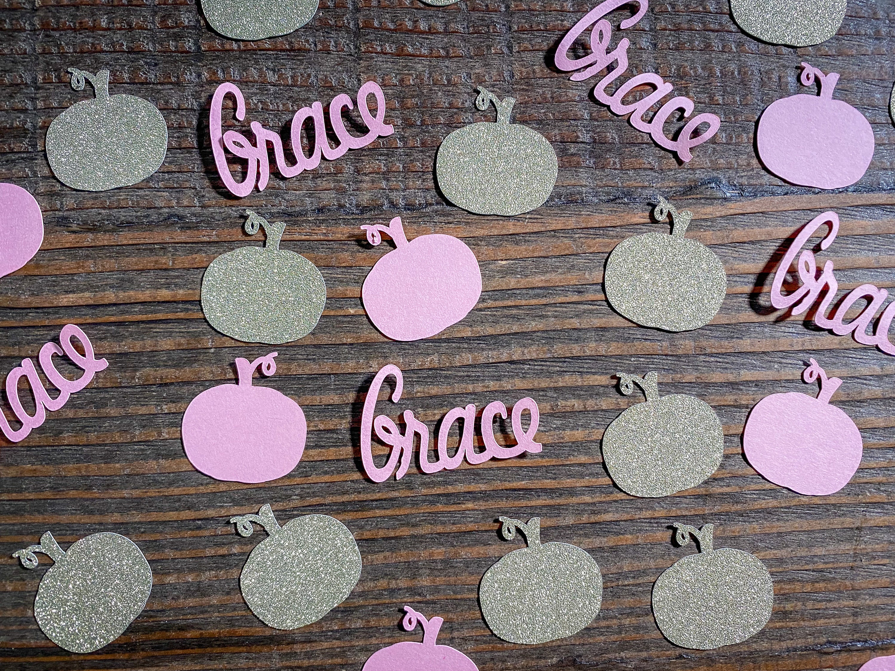 This listing is for 100 pieces of confetti! It includes 25 pieces of pink name confetti, 25 pieces of gold glitter pumpkins, and 50 pieces of light pink pumpkins. The pumpkins measure approximately 1.25 inches and the gold ones are white on the reverse side. The names measure approximately 1 inch in height and the length varies based on the name.