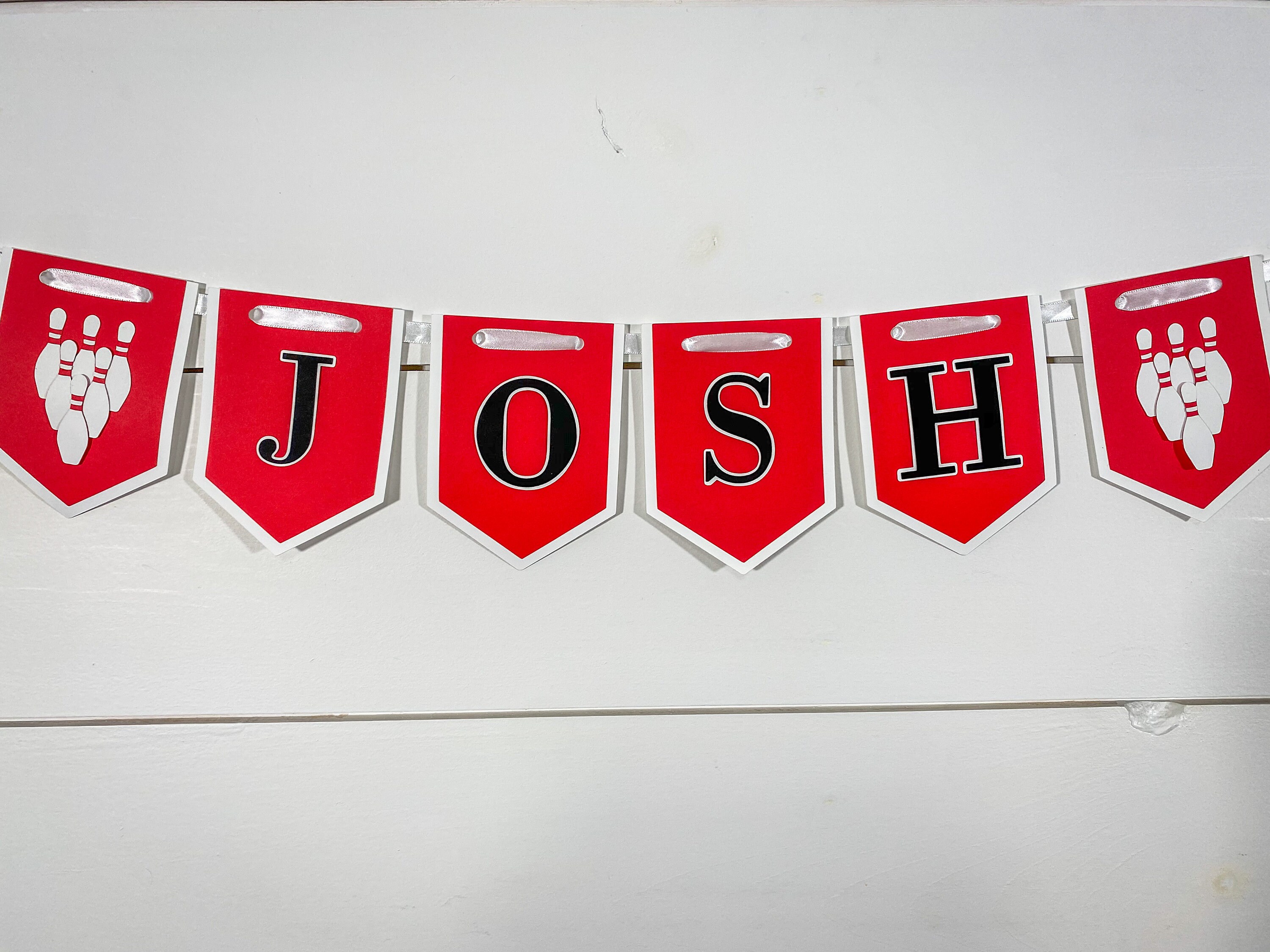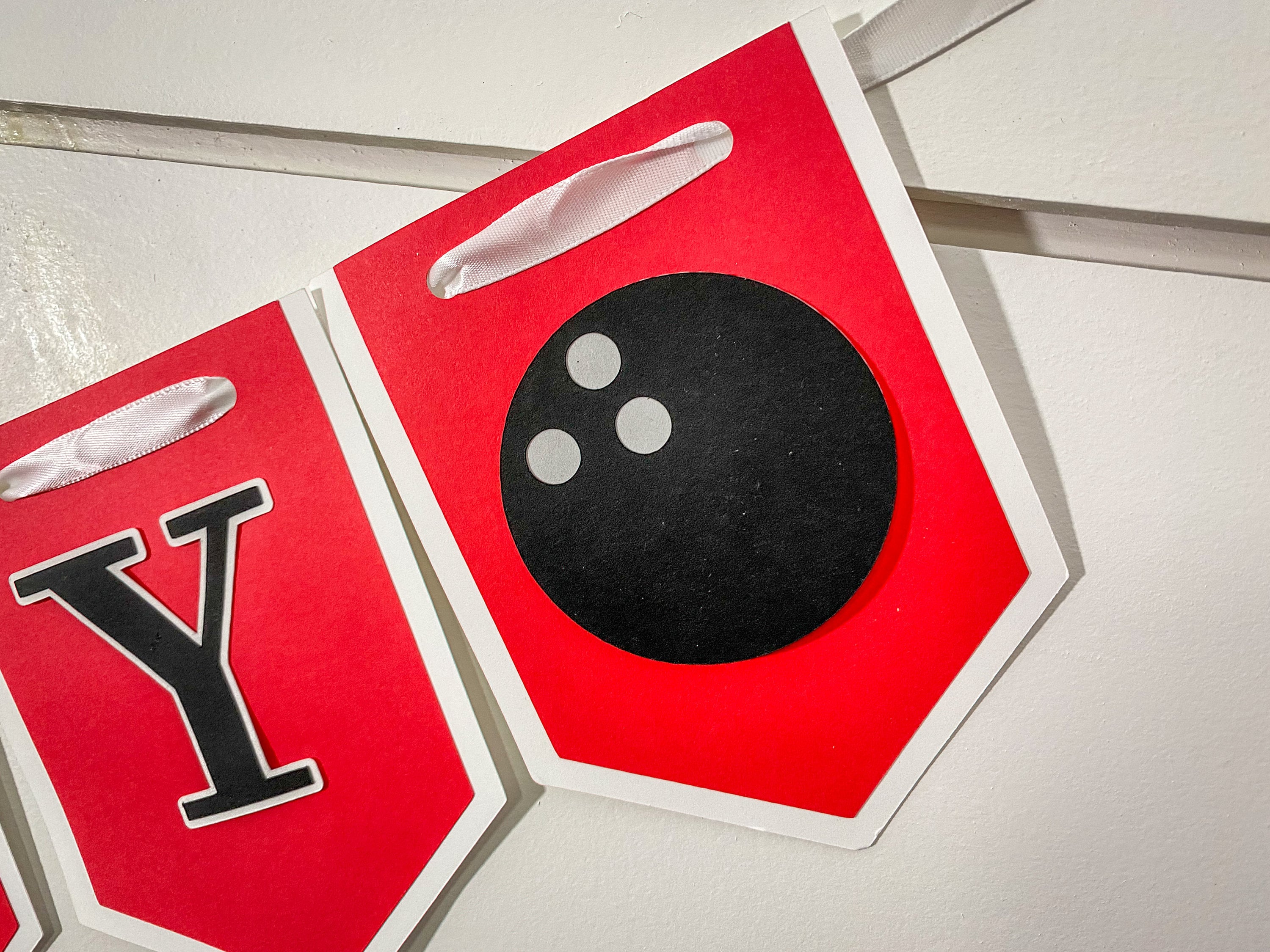 This listing is for the bowling themed happy birthday banner. There is an option to add the name banner from the drop down menu at checkout. The pennant pieces measure approximately 5 inches in length and are attached with a satin ribbon that is looped at the ends to allow for each hanging. The bowling ball and front pin are attached with foam dots to create a 3D effect.
