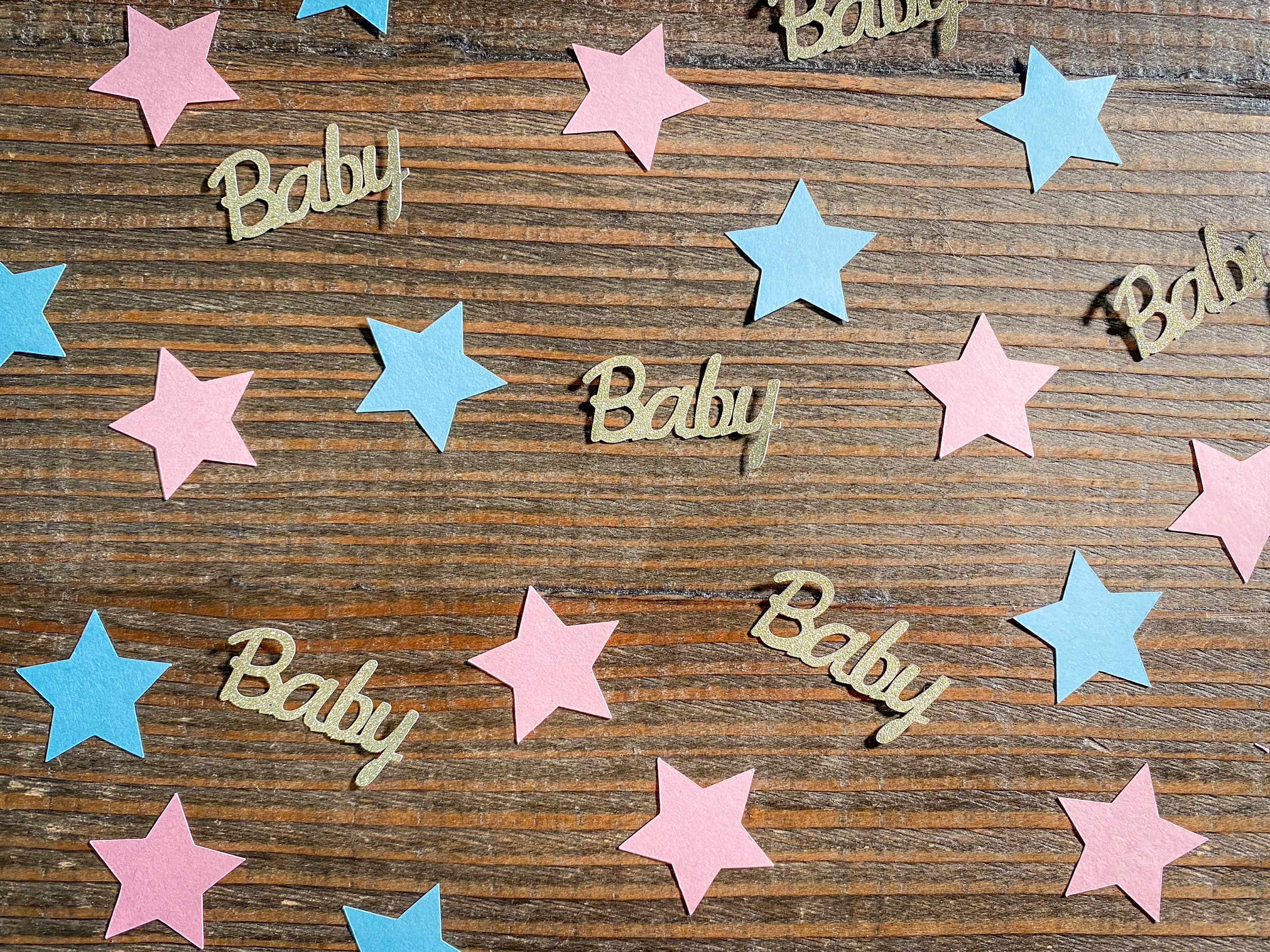 This listing is for 100 pieces of confetti! It includes 30 pieces of glitter gold baby confetti, 35 pieces of light blue star confetti, and 35 pieces of light pink star confetti. The gold confetti is white on the reverse side. The stars measure approximately 1.25 inches.