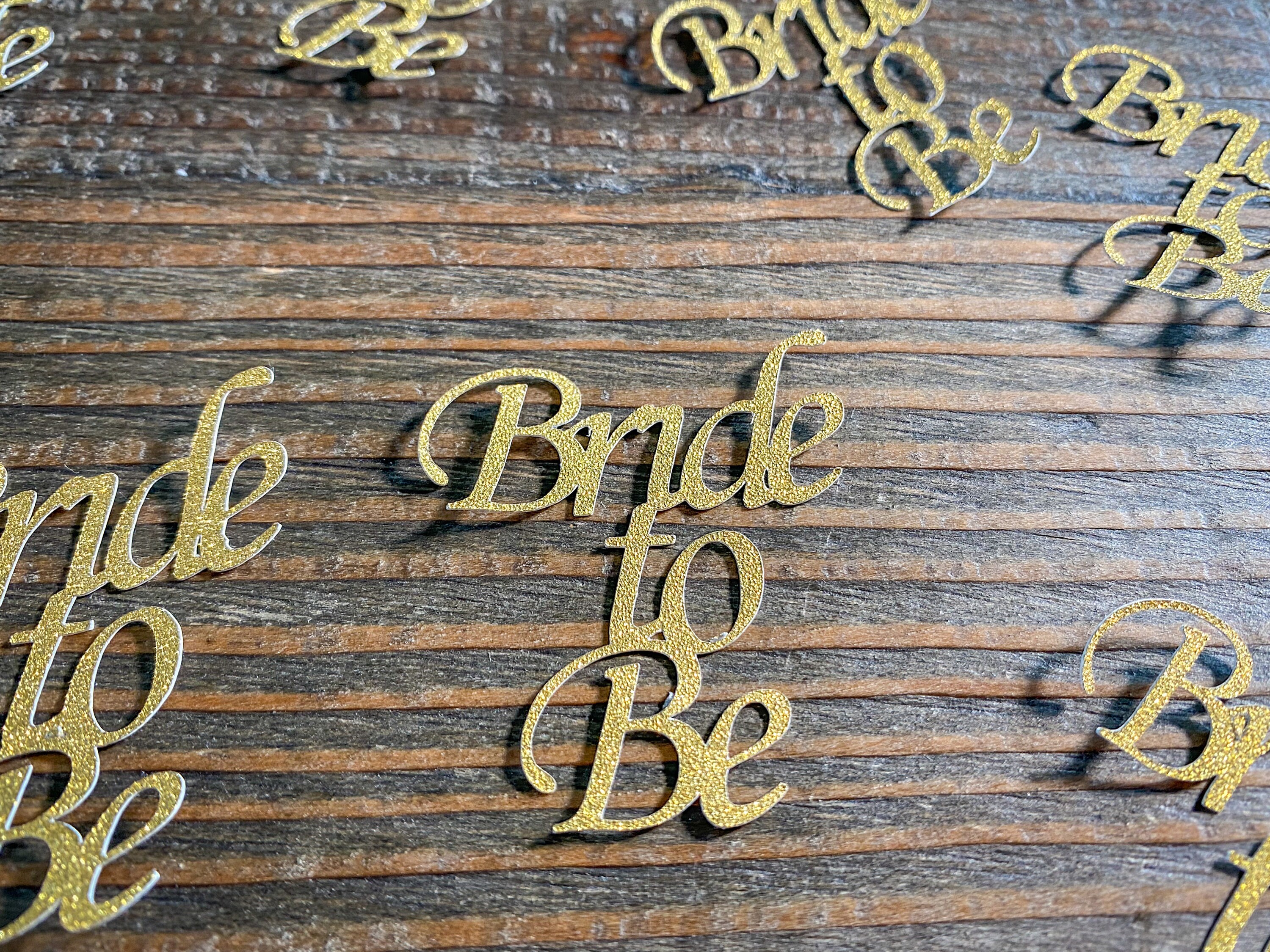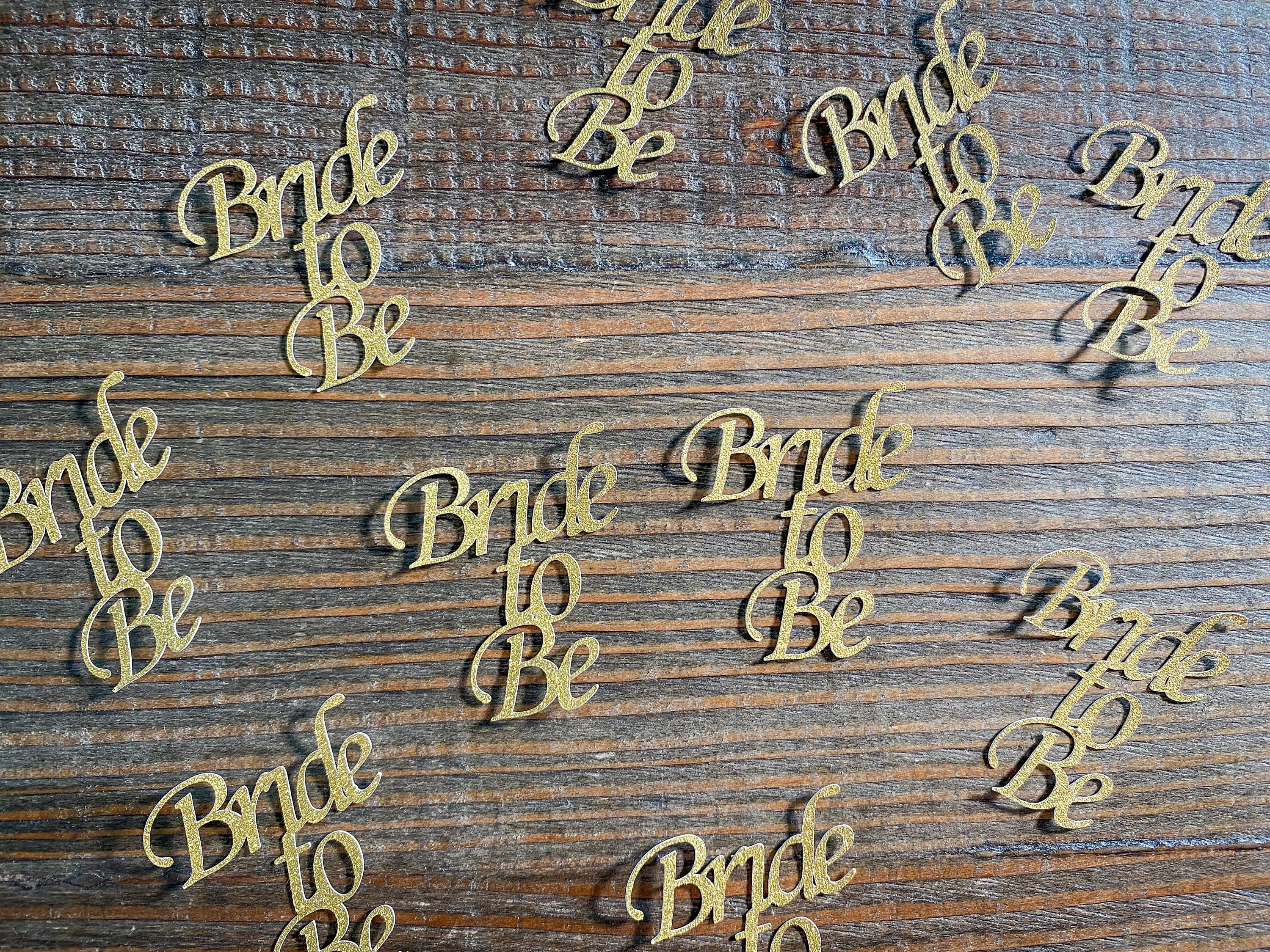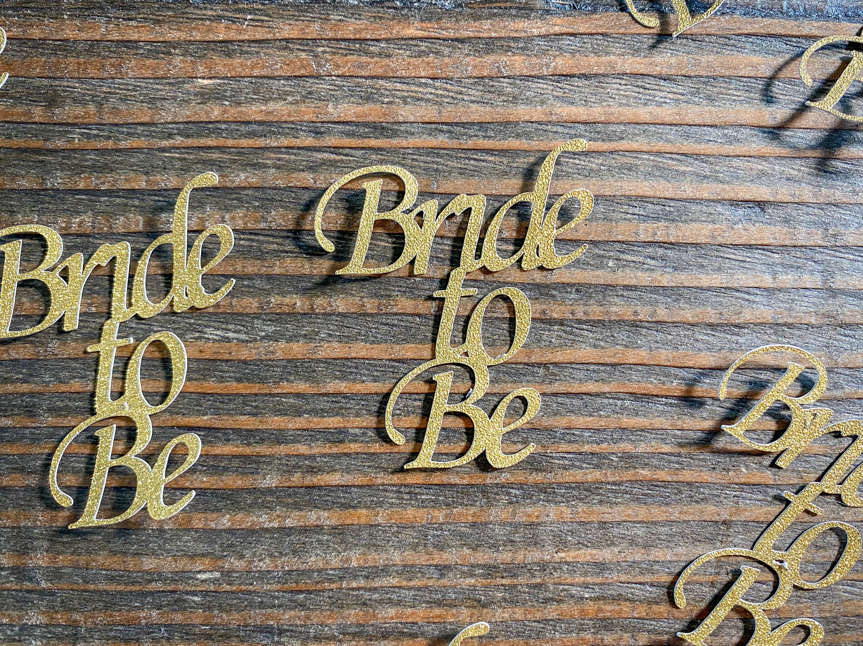 This listing is for 25 pieces of gold glitter bride to be confetti pieces. The confetti is made of premium gold glitter cardstock that is white on the reverse side. Each piece measures approximately 2 inches high by 1.75 inches wide.