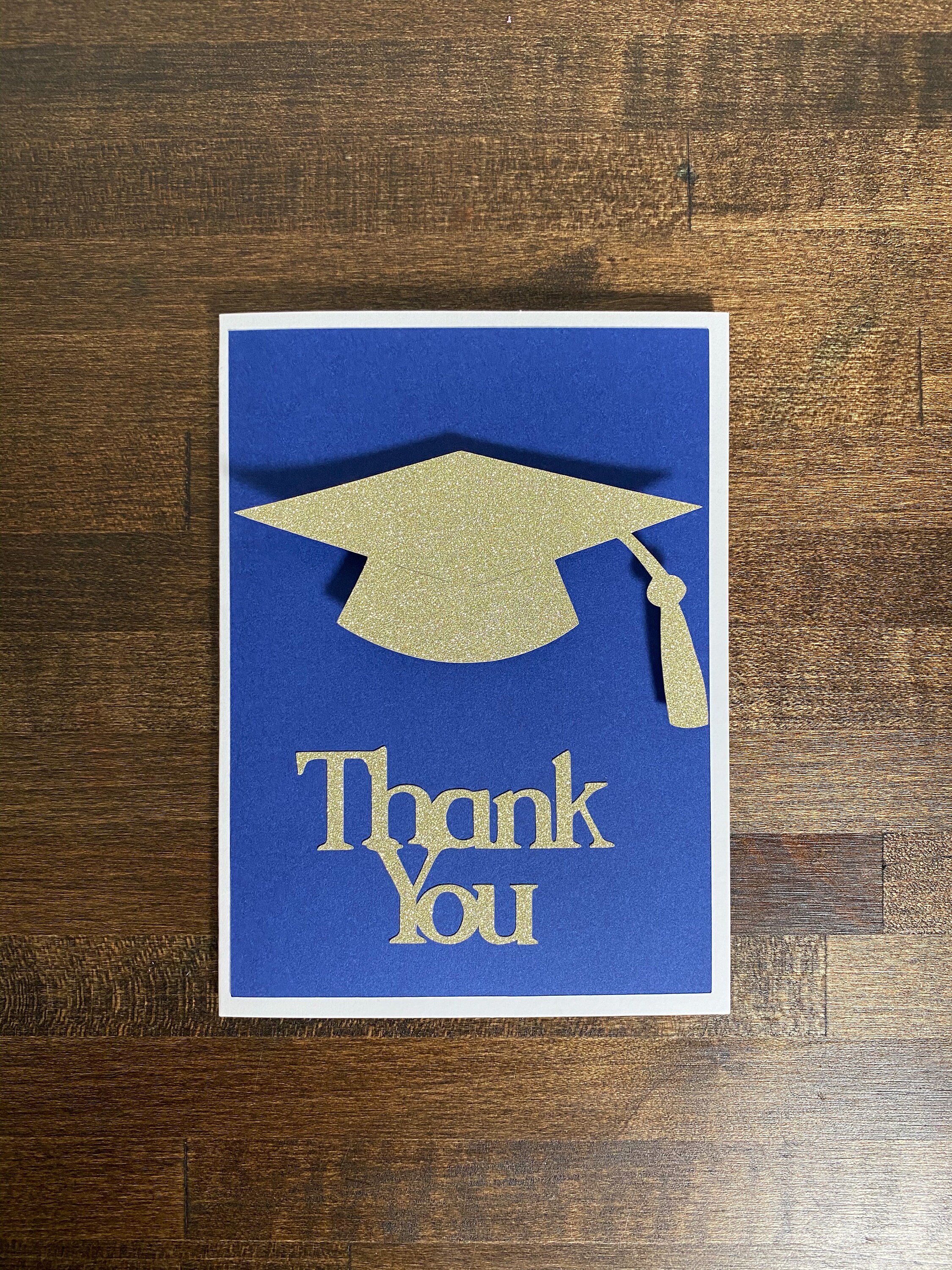 This listing is for a set of 10 cards and envelopes. The cards measure approximately 5.5 inches x 4.25 inches. The cards are blank on the inside for your own special message. The card colors are navy blue and glitter gold.
