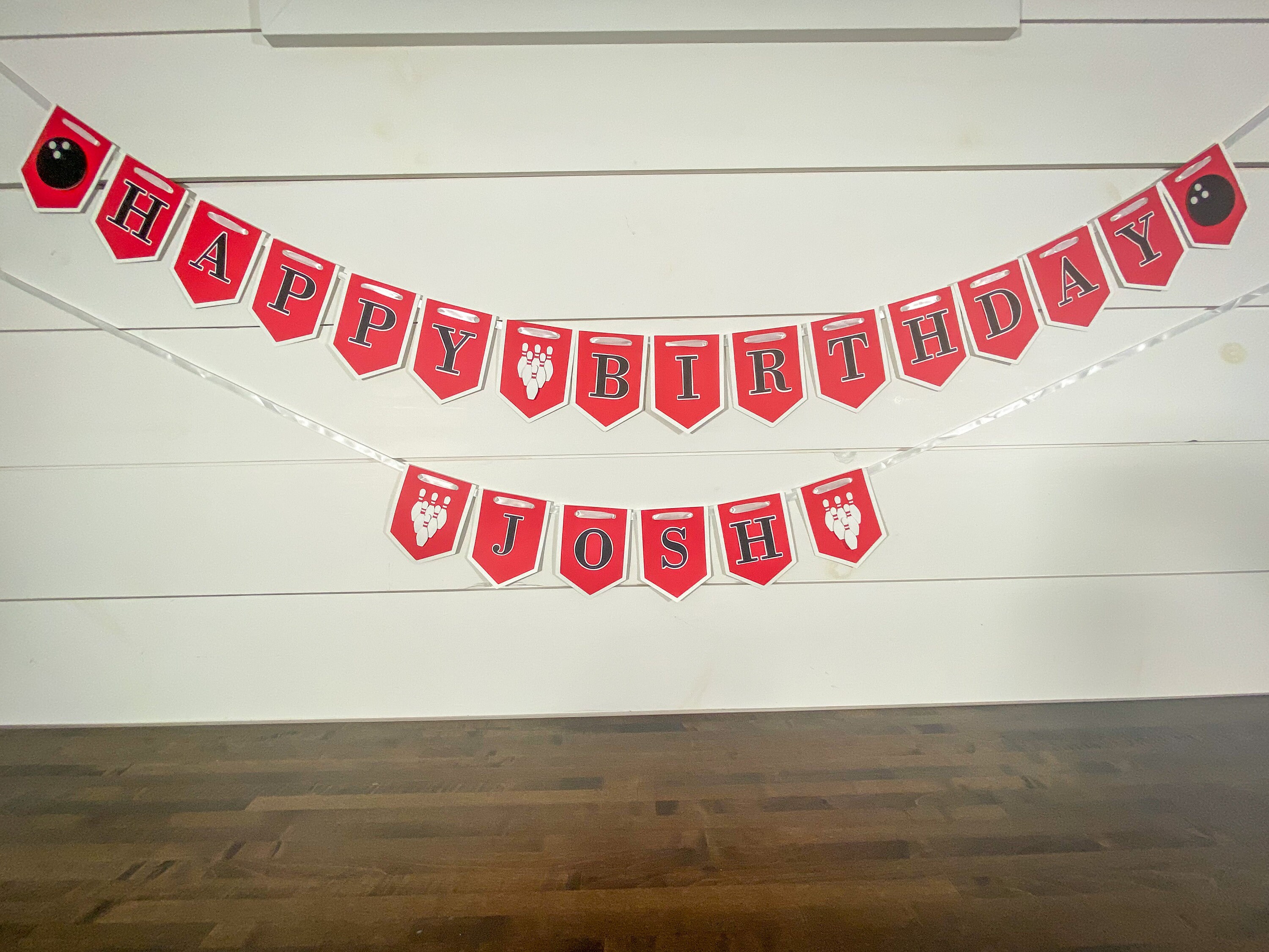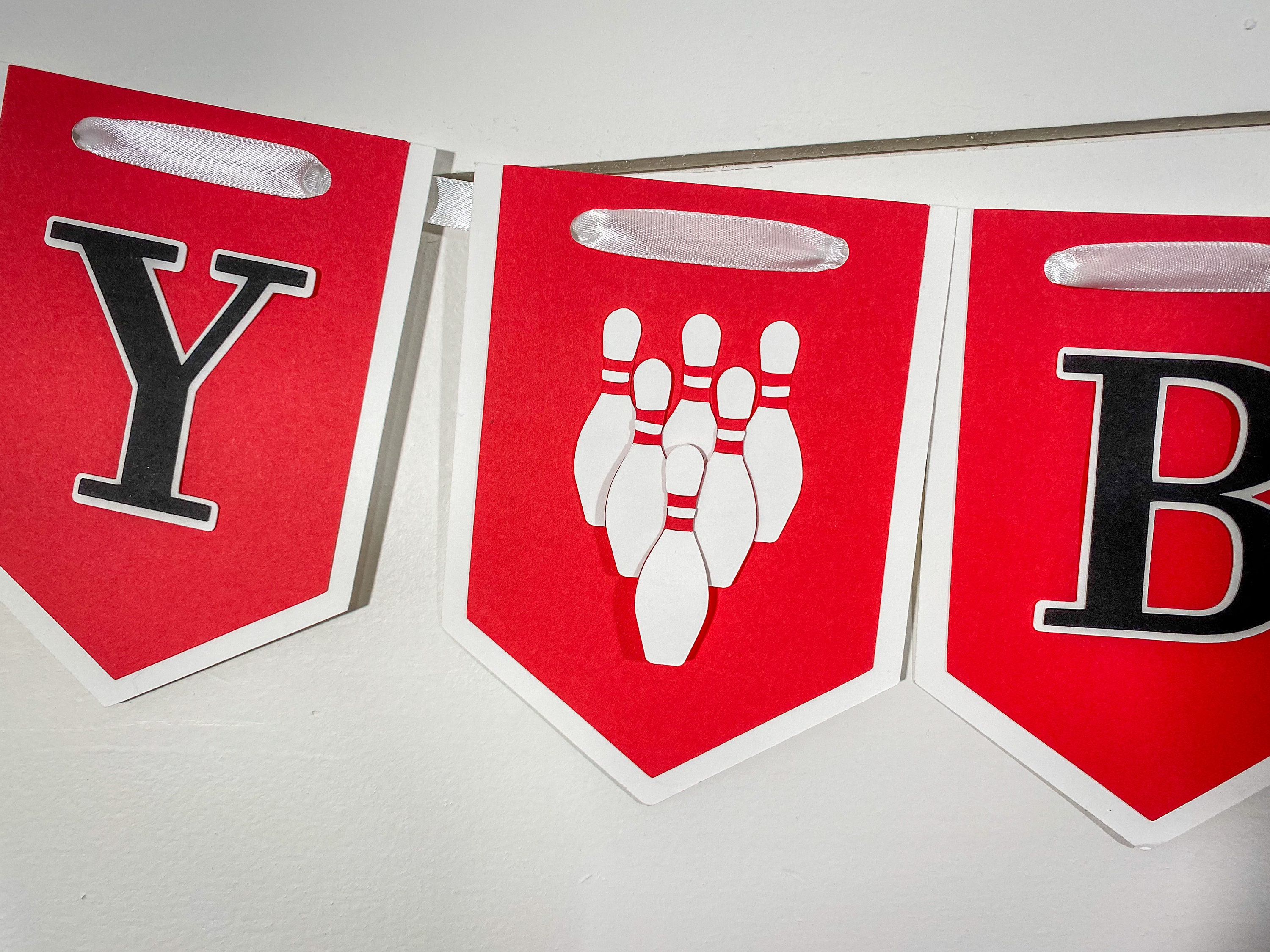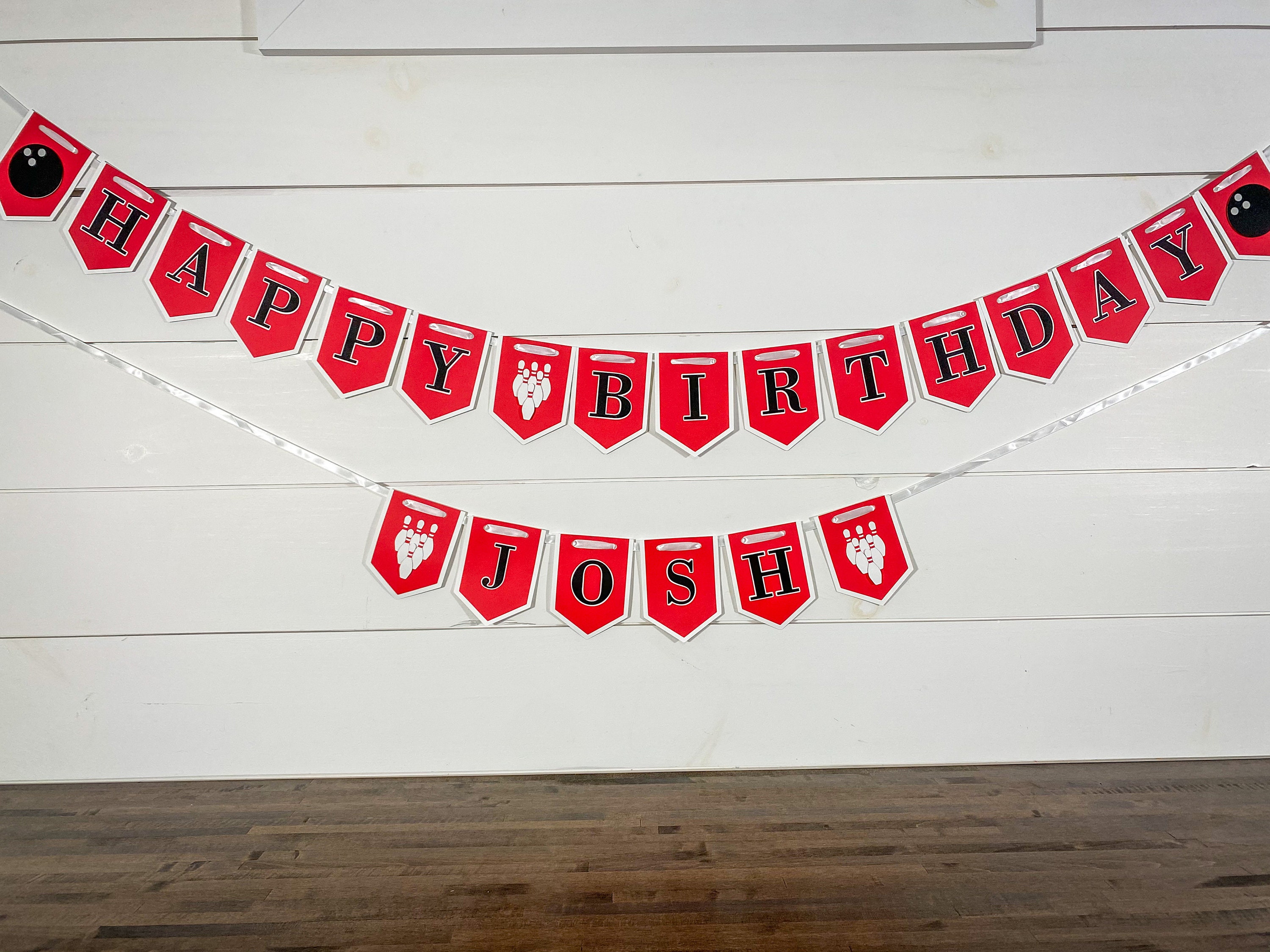This listing is for the bowling themed happy birthday banner. There is an option to add the name banner from the drop down menu at checkout. The pennant pieces measure approximately 5 inches in length and are attached with a satin ribbon that is looped at the ends to allow for each hanging. The bowling ball and front pin are attached with foam dots to create a 3D effect.