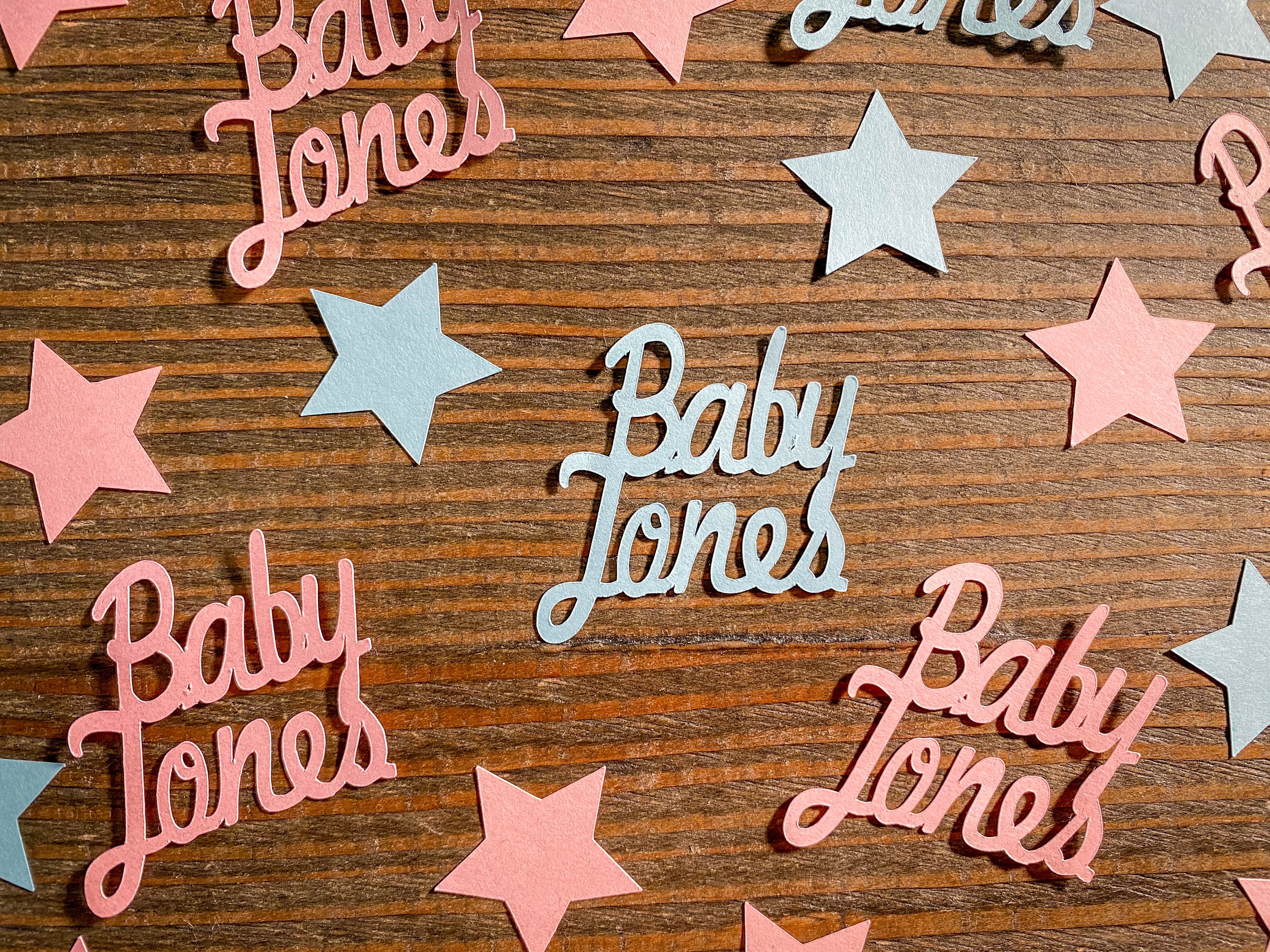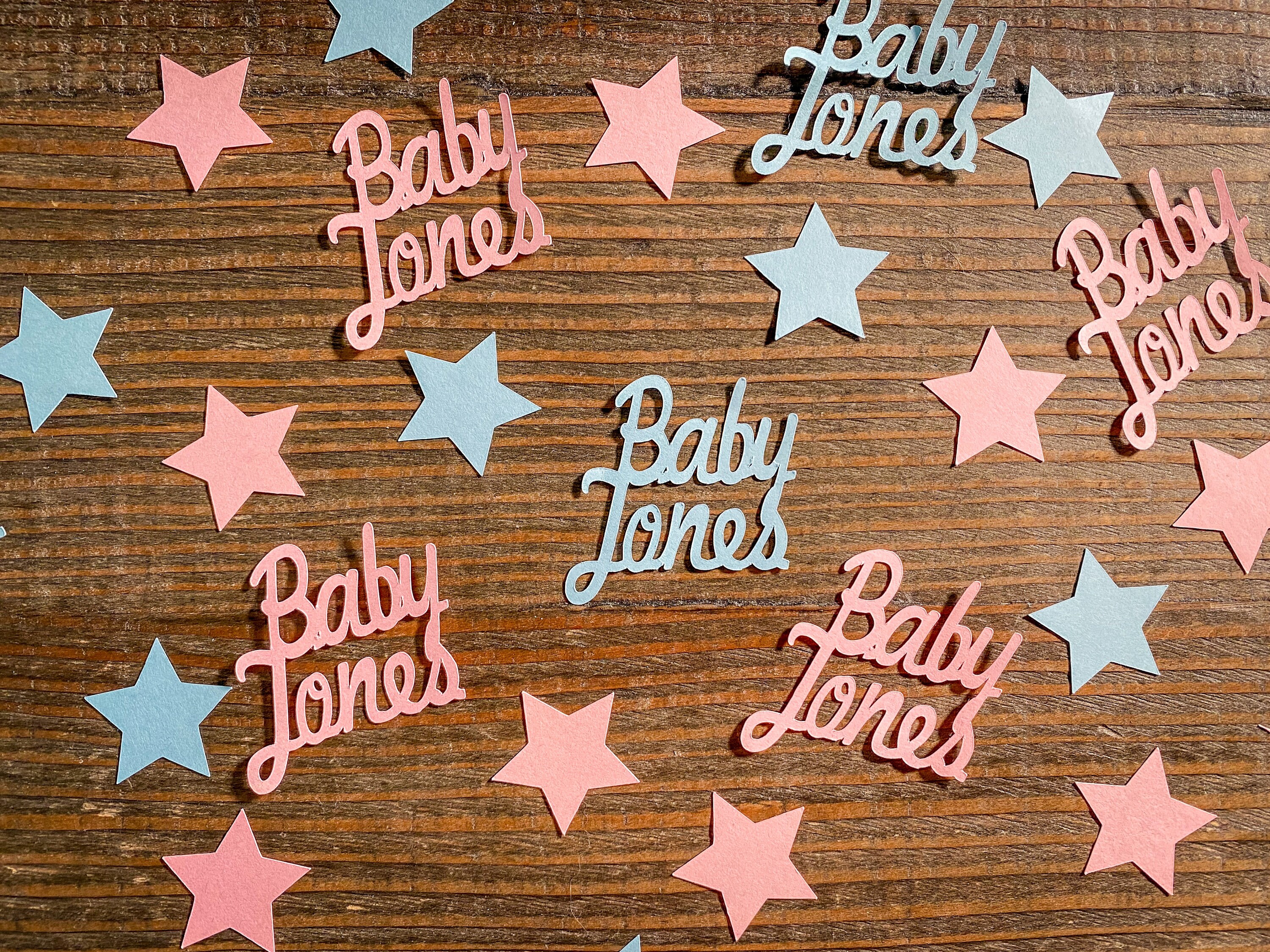 A beautiful bundle of joy will soon be arriving! Be sure to add this pink and blue star confetti to your baby shower or gender reveal decor! The personalized confetti is the perfect touch to any party!