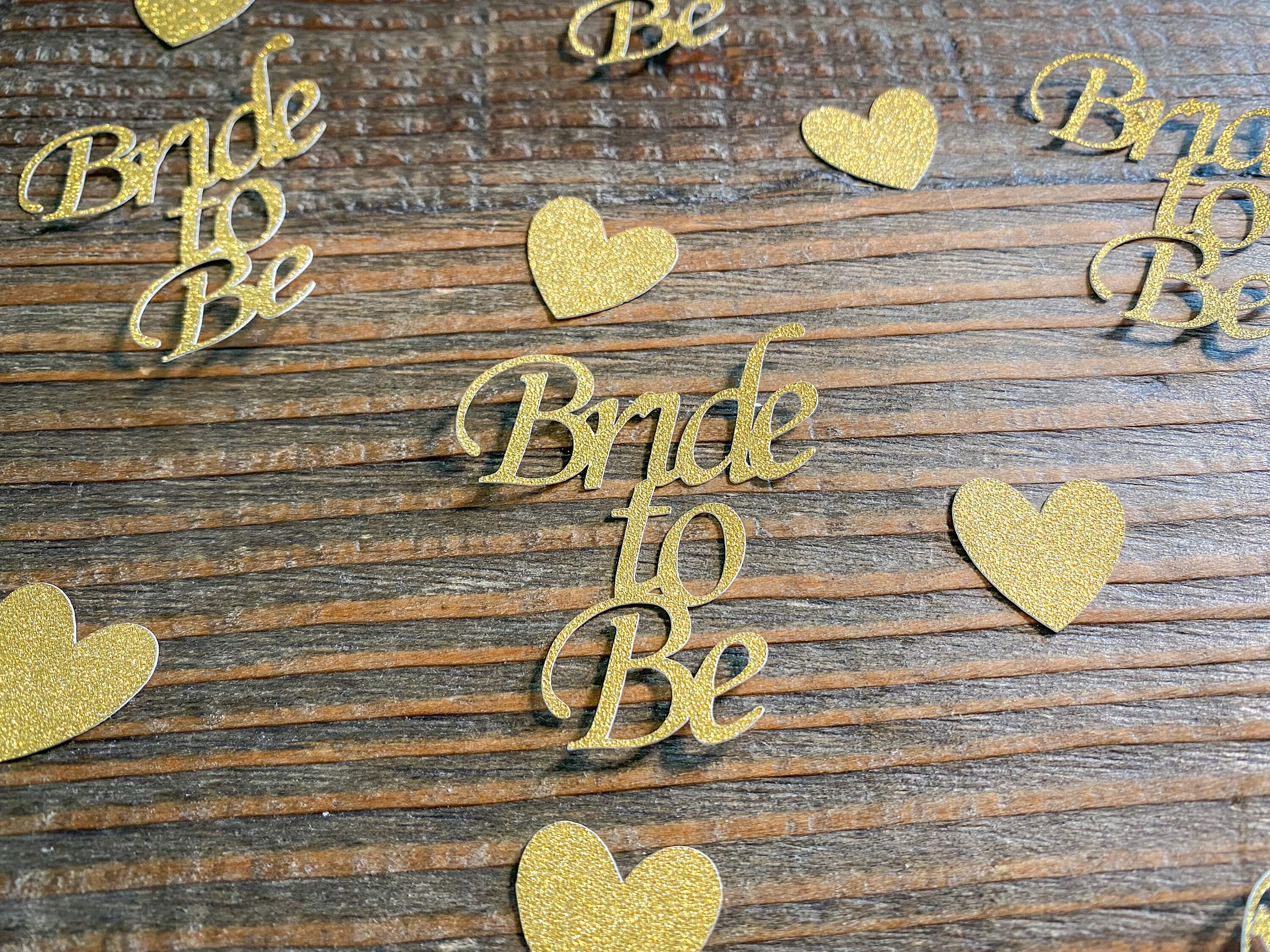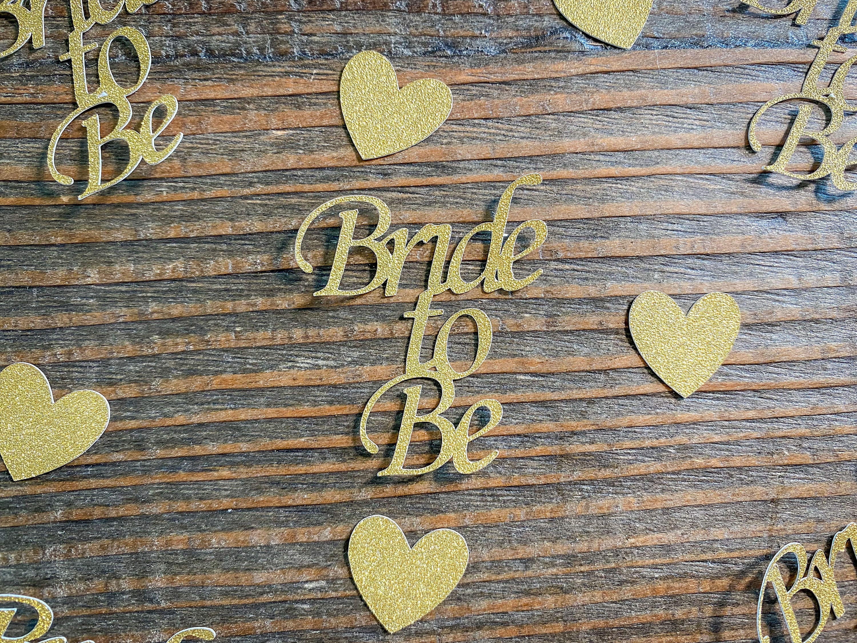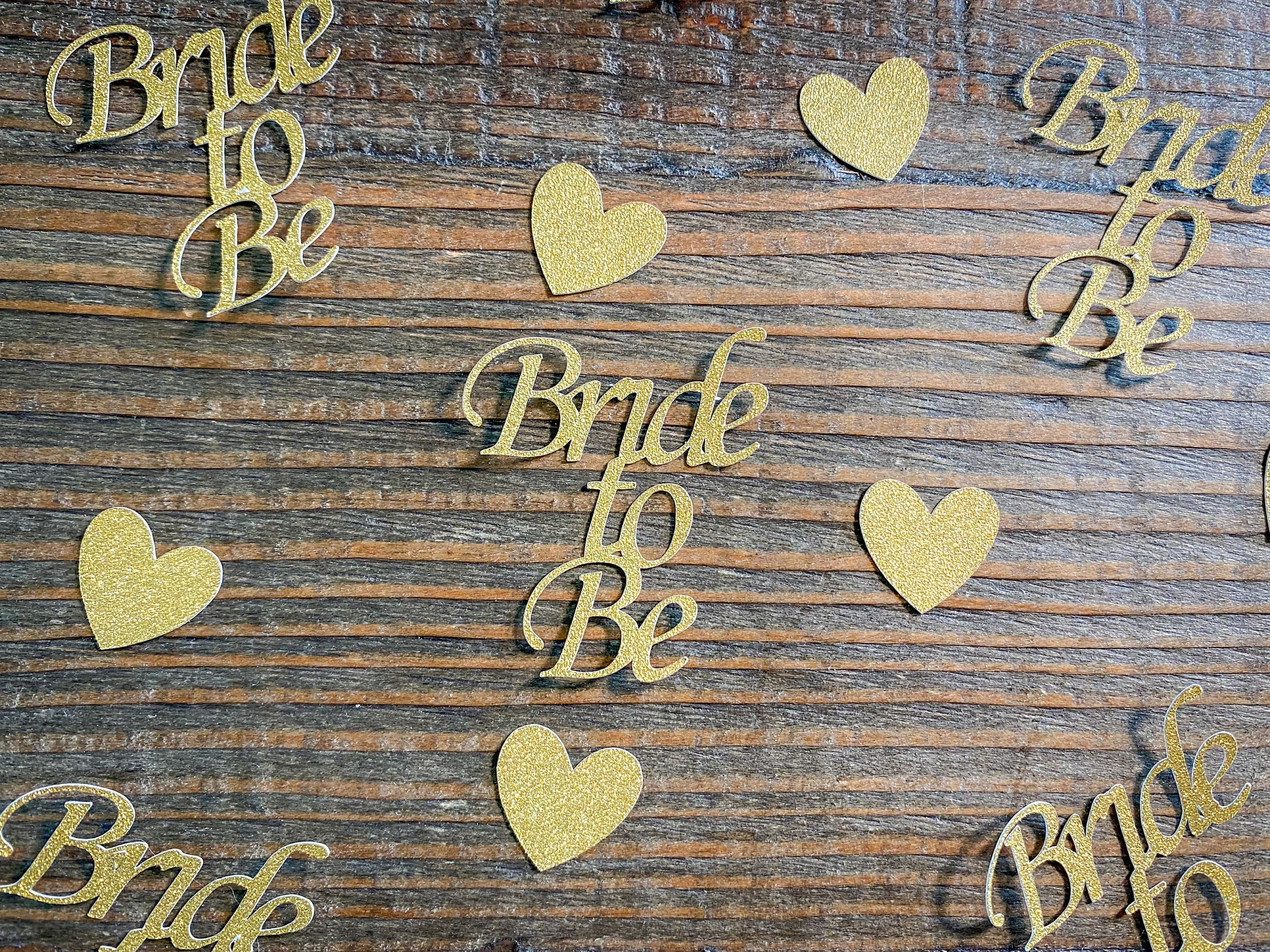 This listing is for 75 pieces of confetti including 20 pieces of bride to be gold glitter confetti and 55 pieces of gold glitter hearts. The gold glitter is white on the reverse side. The hearts measure 3/4 inch.