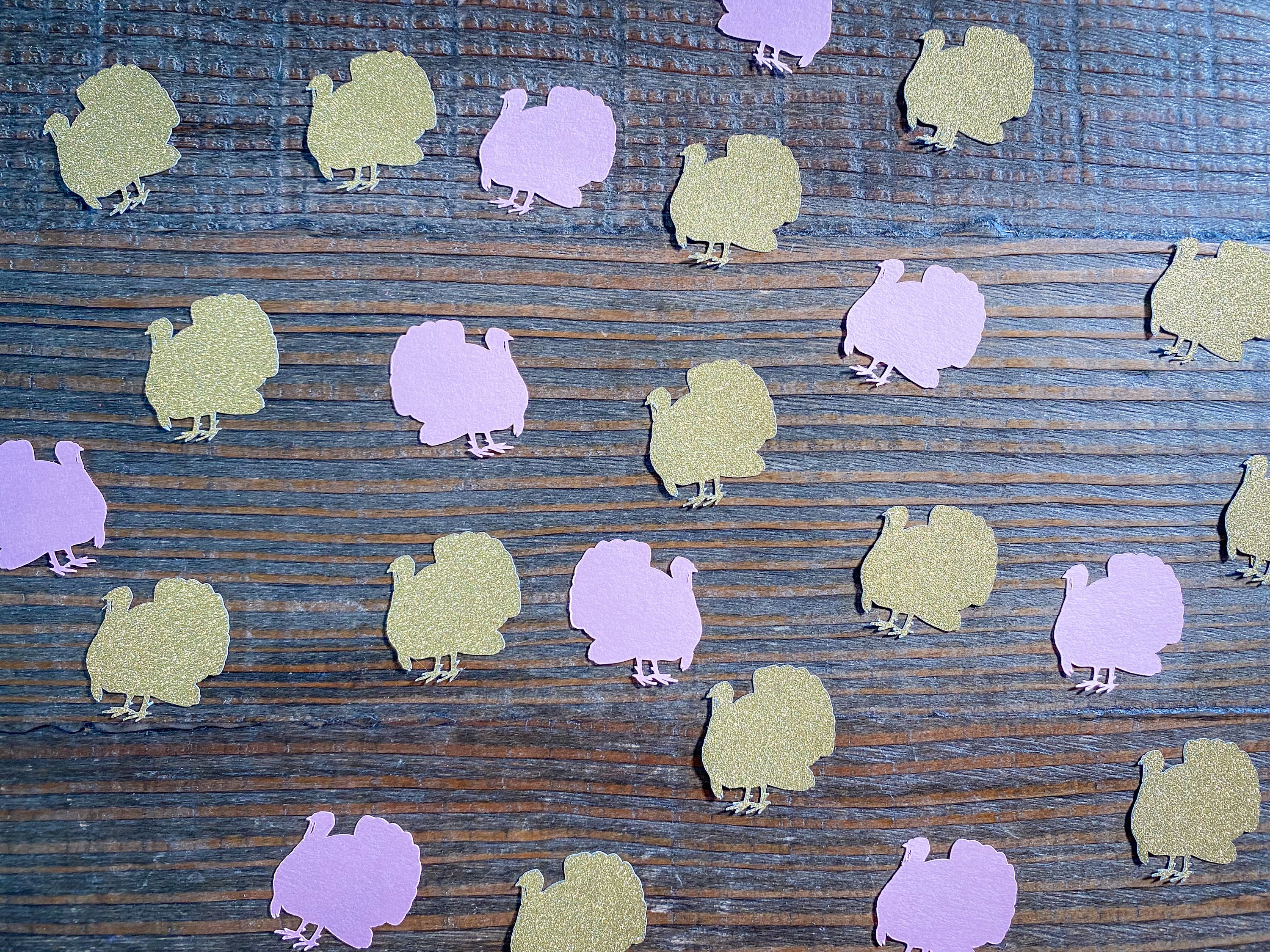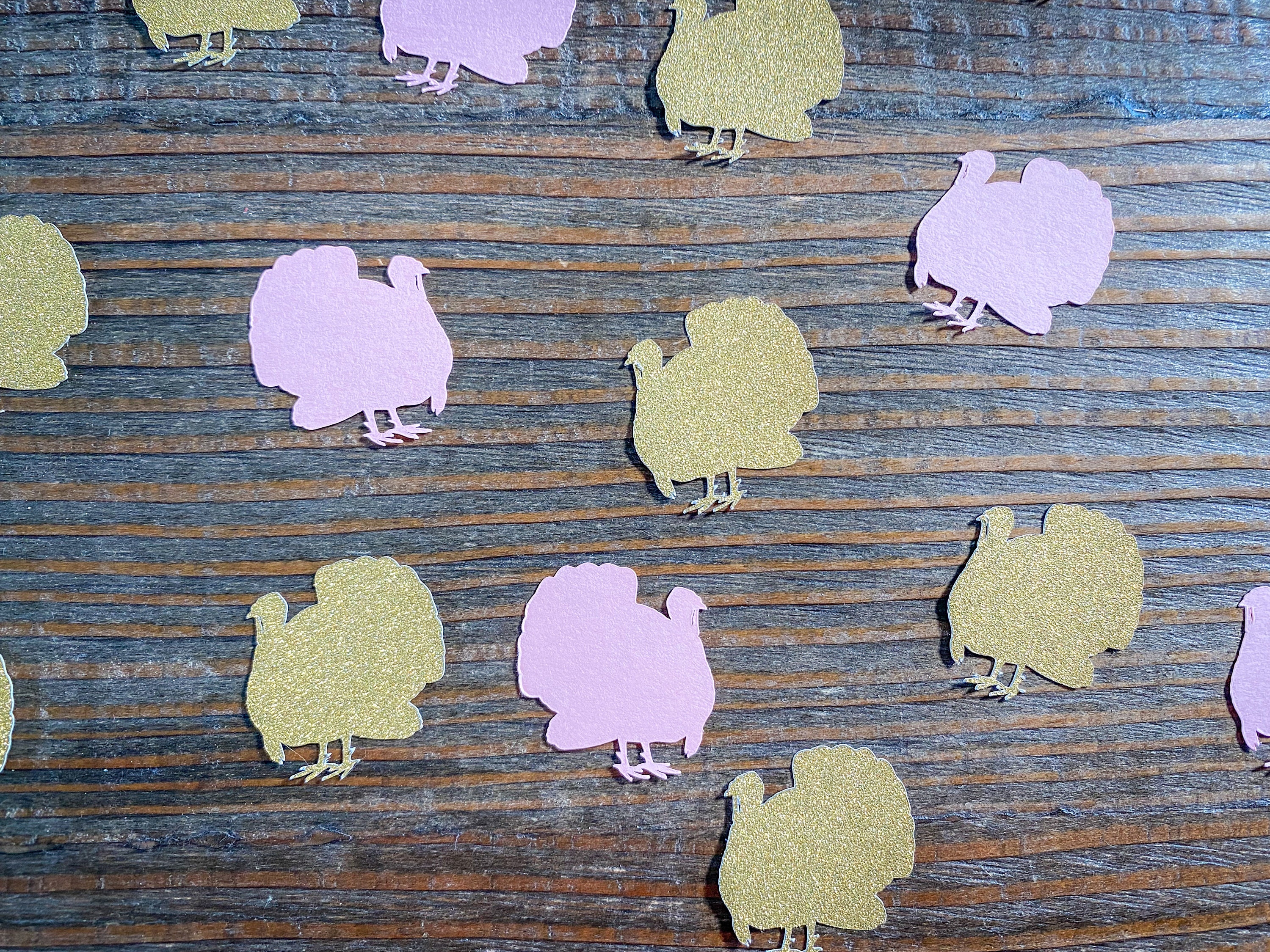 This listing is for 100 pieces of confetti! It includes 30 pieces of glitter gold turkeys and 70 light pink turkeys. The turkeys measure approximately 1.25 inches and the gold ones are white on the reverse side.
