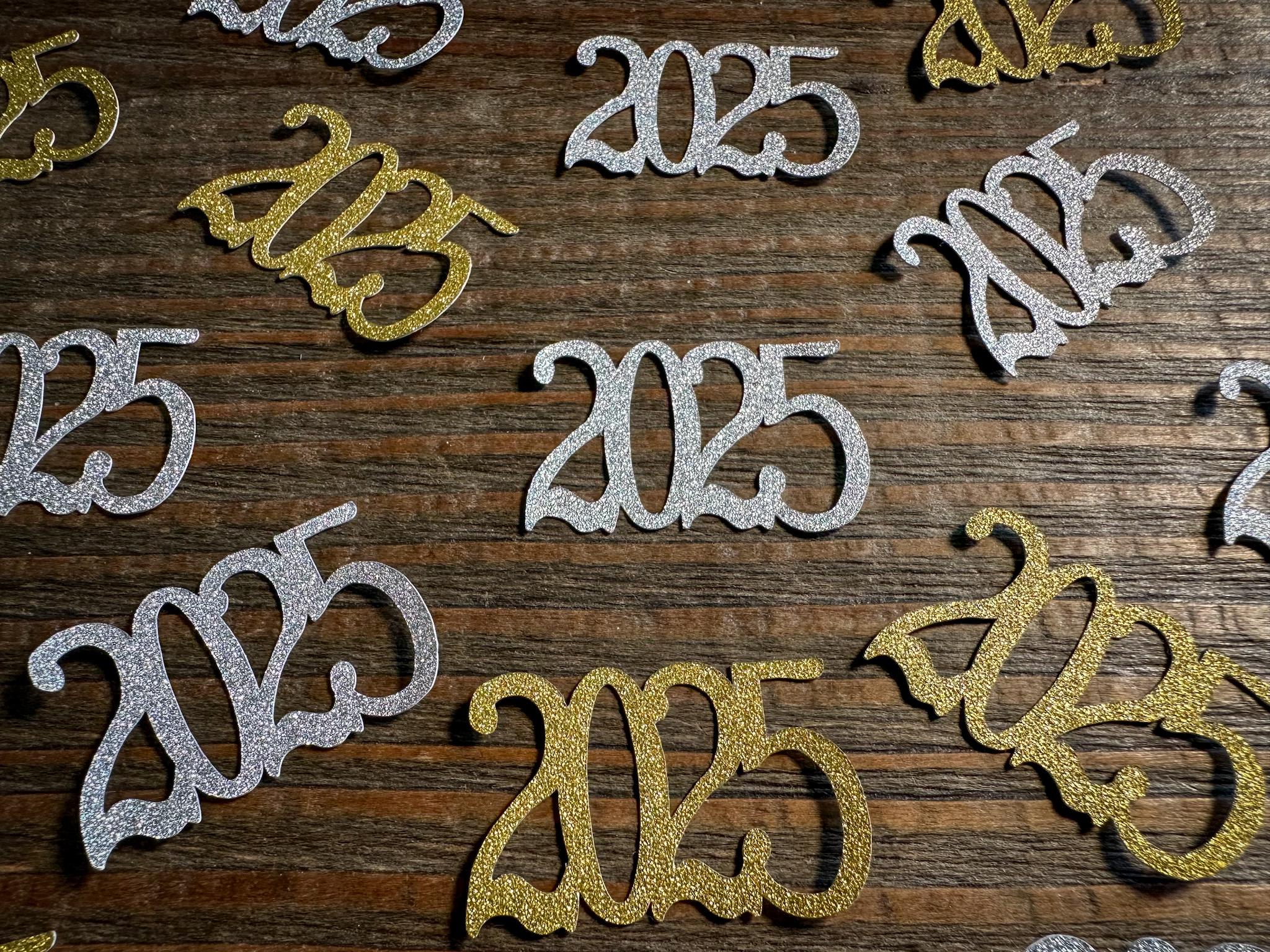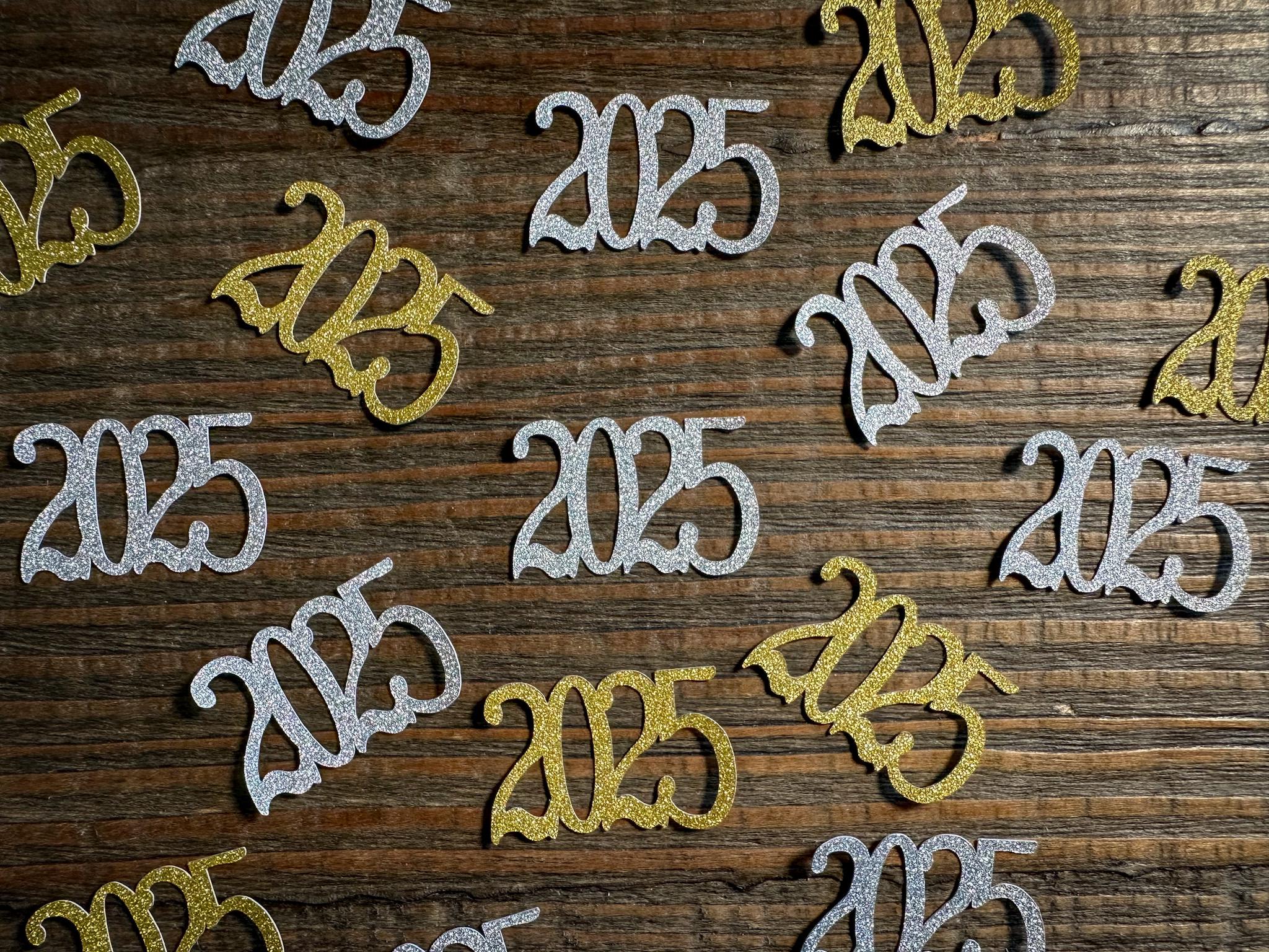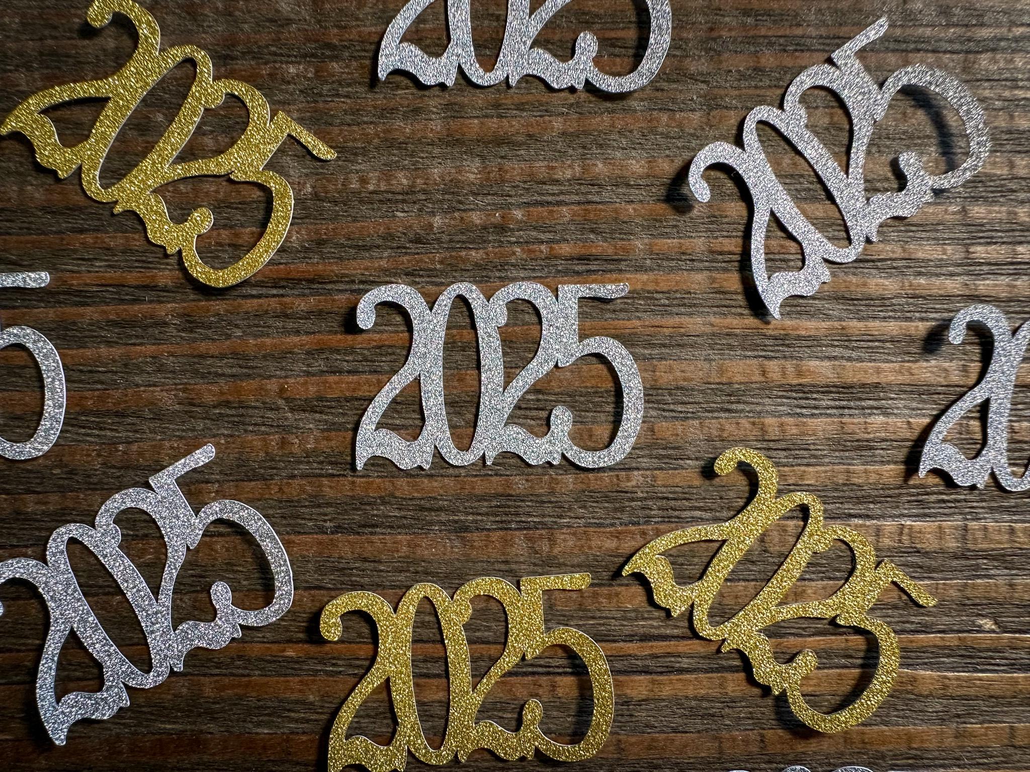 This listing is for 50 pieces of confetti! It includes 25 pieces of gold glitter 2026 confetti and 25 pieces of silver glitter 2026 confetti. The confetti is made of premium glitter cardstock that is white on the reverse side. Each piece measures approximately 1 inch in height by 1.25 inches in length.