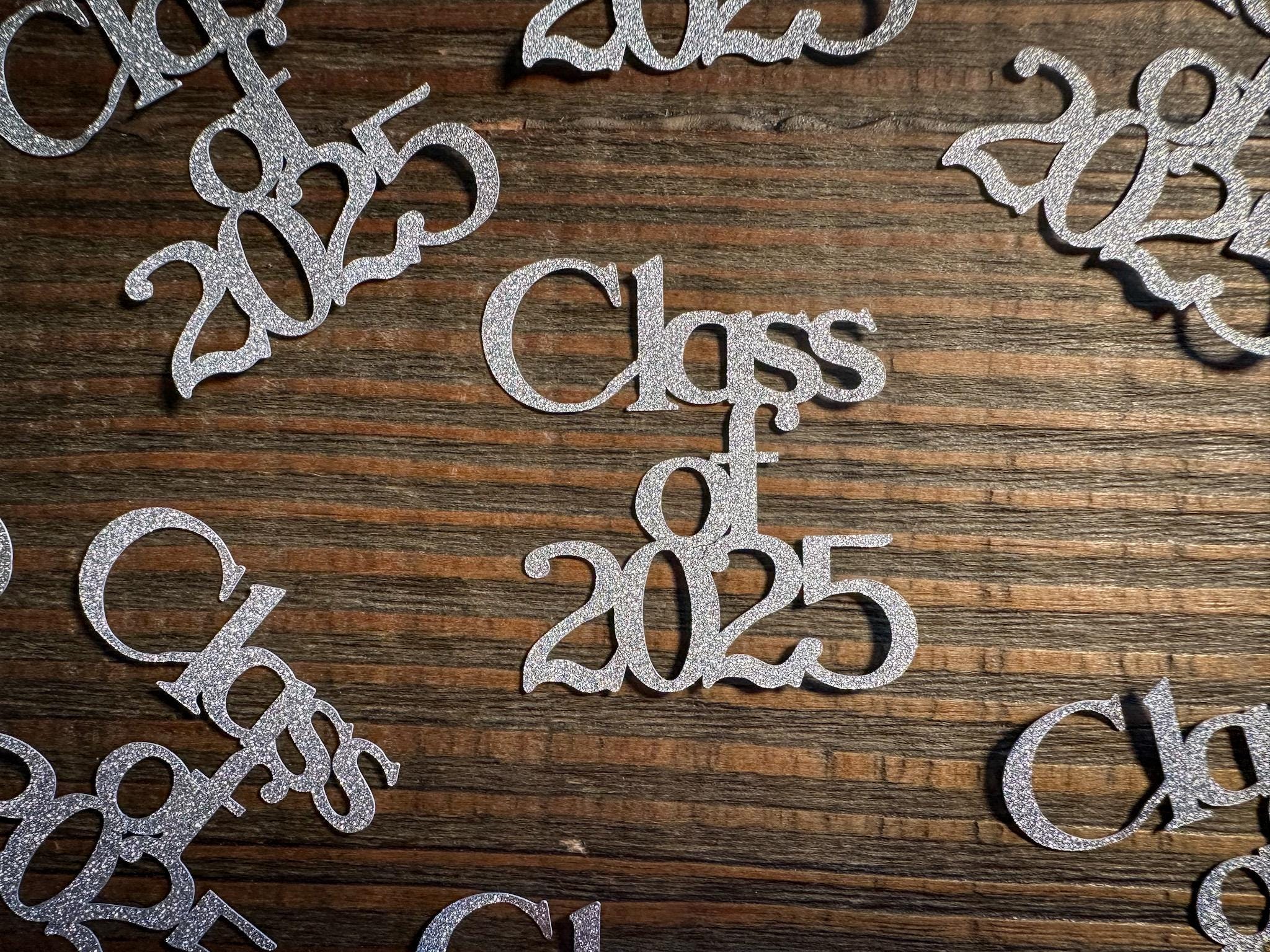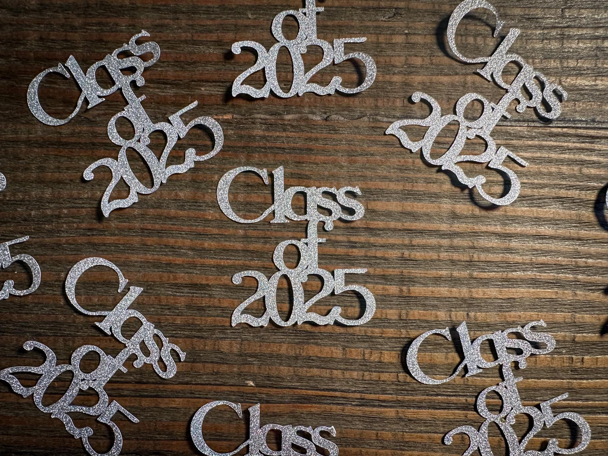 Add a touch of sparkle to your graduation decor with this glitter silver class of 2025 confetti!
