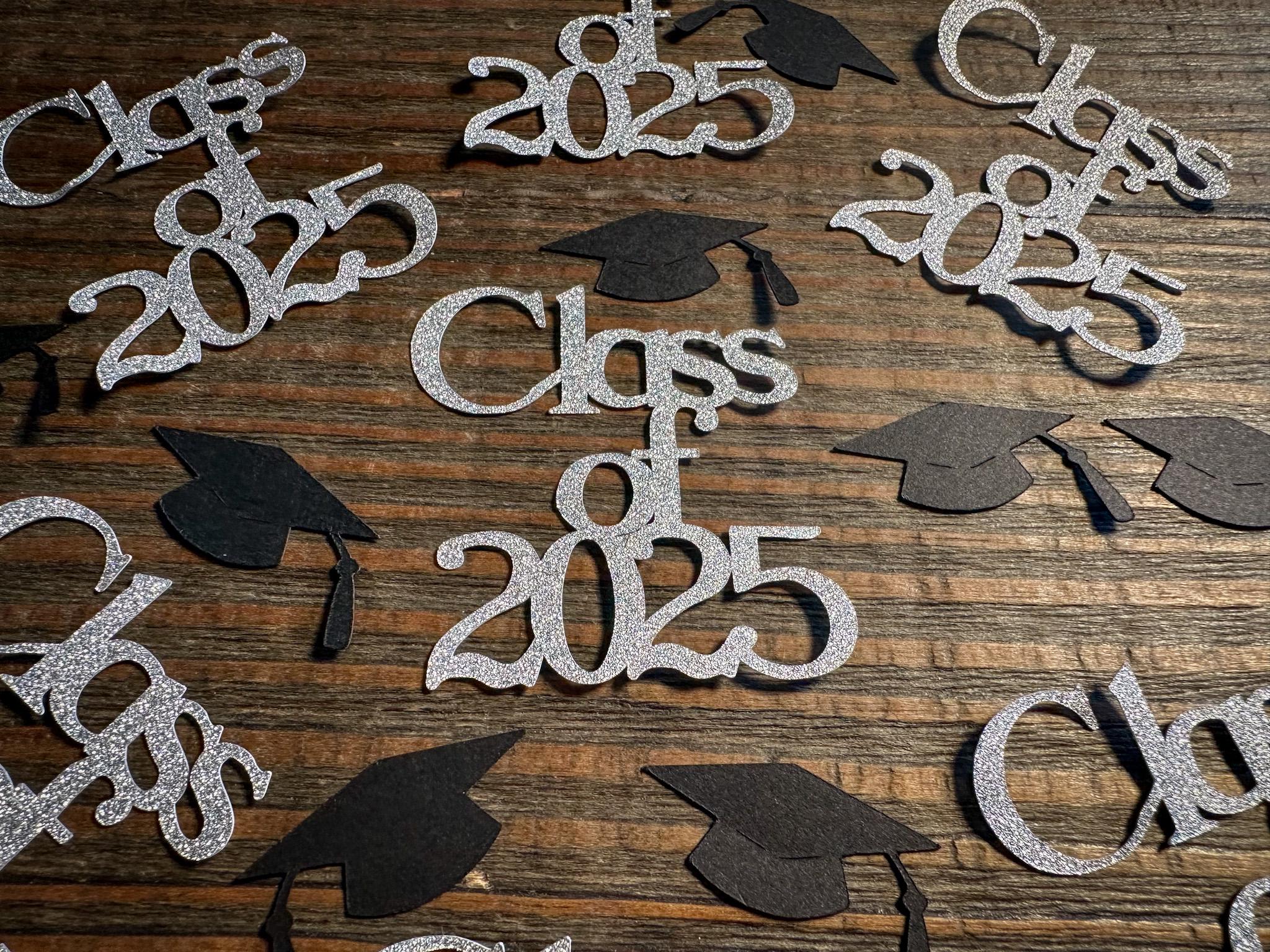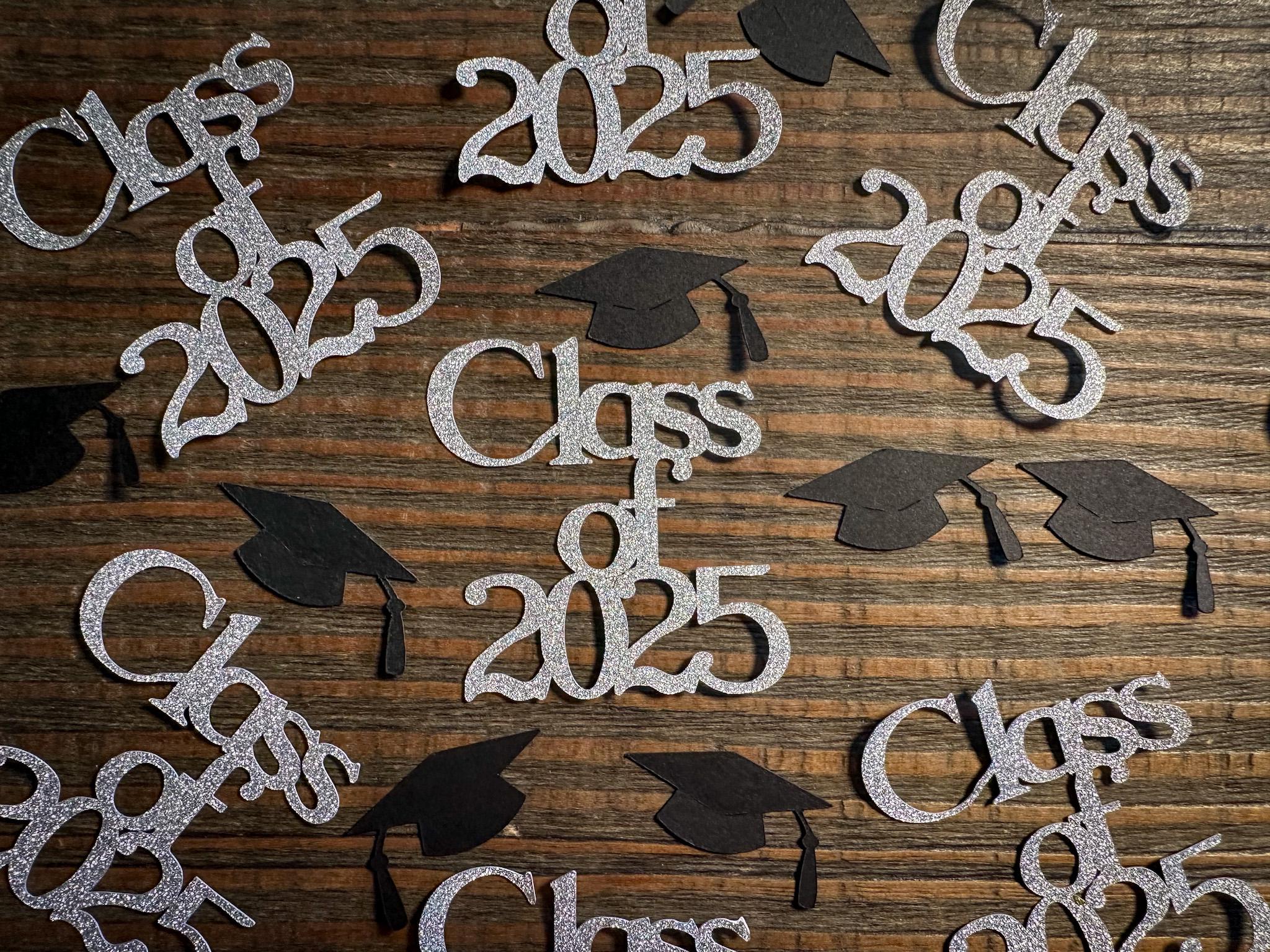 This listing is for 100 pieces of confetti! It includes 15 pieces of silver glitter class of 2025 confetti and 85 pieces of black graduation caps. The "class of 2025" pieces are white on the reverse side and measure approximately 2 inches in height by 2 inches in width. The graduation caps measure approximately 1.25 inches.