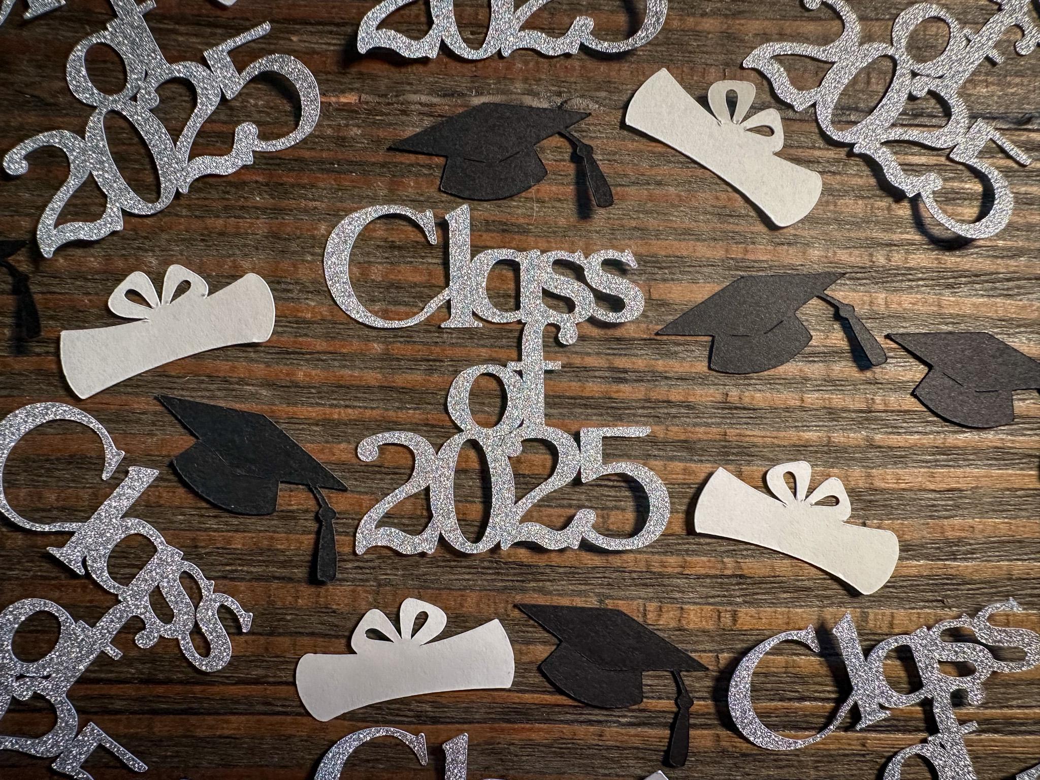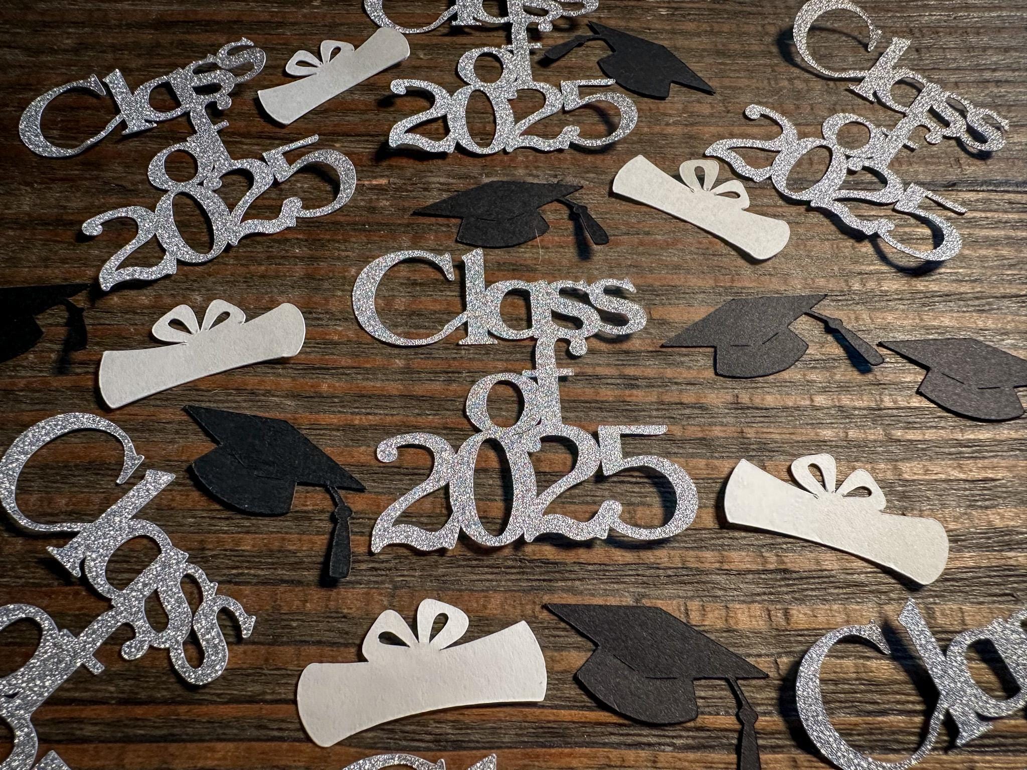This listing is for 100 pieces of confetti! It includes 15 pieces of silver glitter class of 2024 confetti, 45 pieces of black graduation caps, and 40 pieces of white diploma confetti. The "class of 2025" pieces are white on the reverse side and measure approximately 2 inches in height by 2 inches in width. The graduation caps measure approximately 1.25 inches and the diplomas measure approximately 1.25 inches.