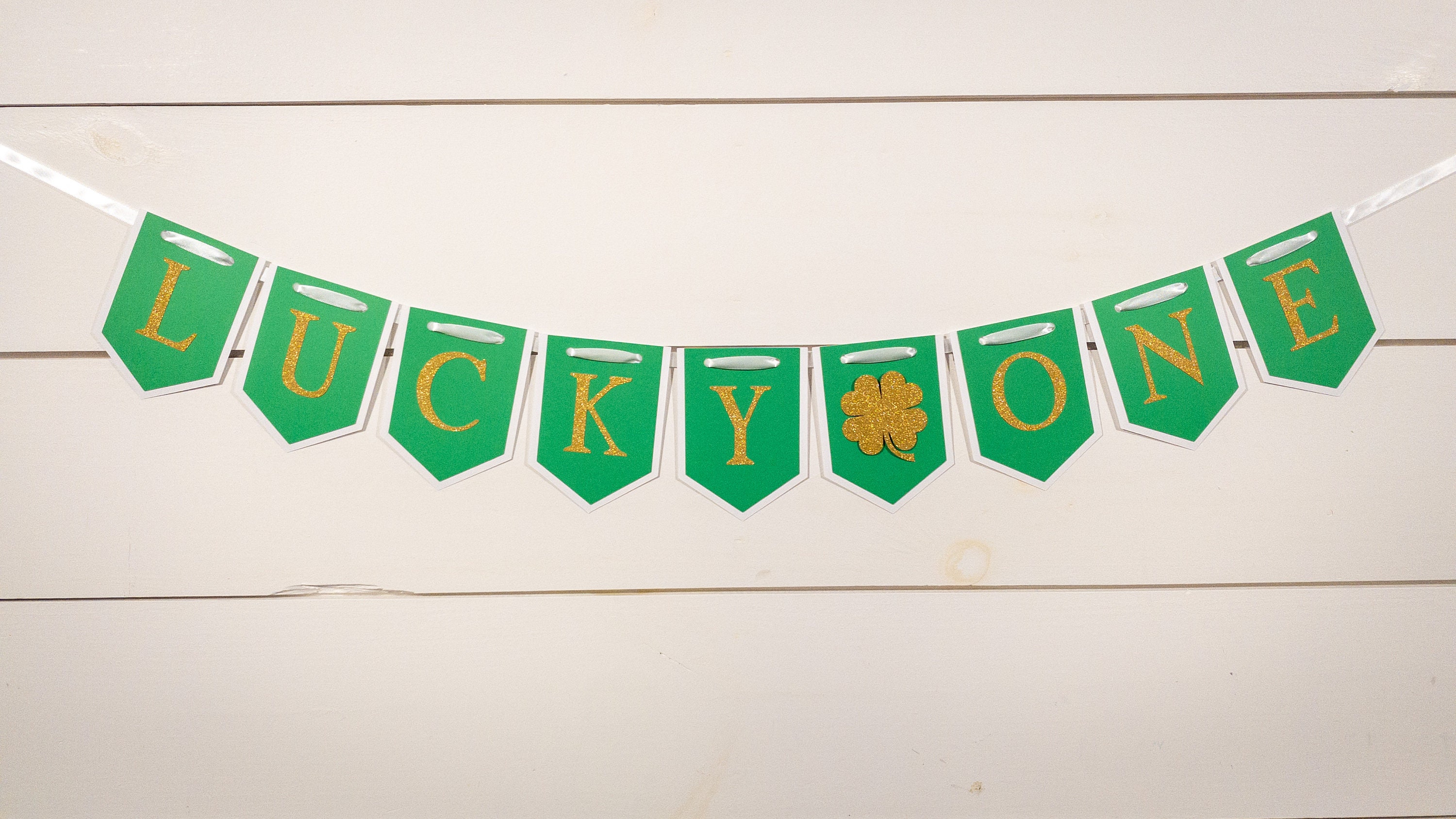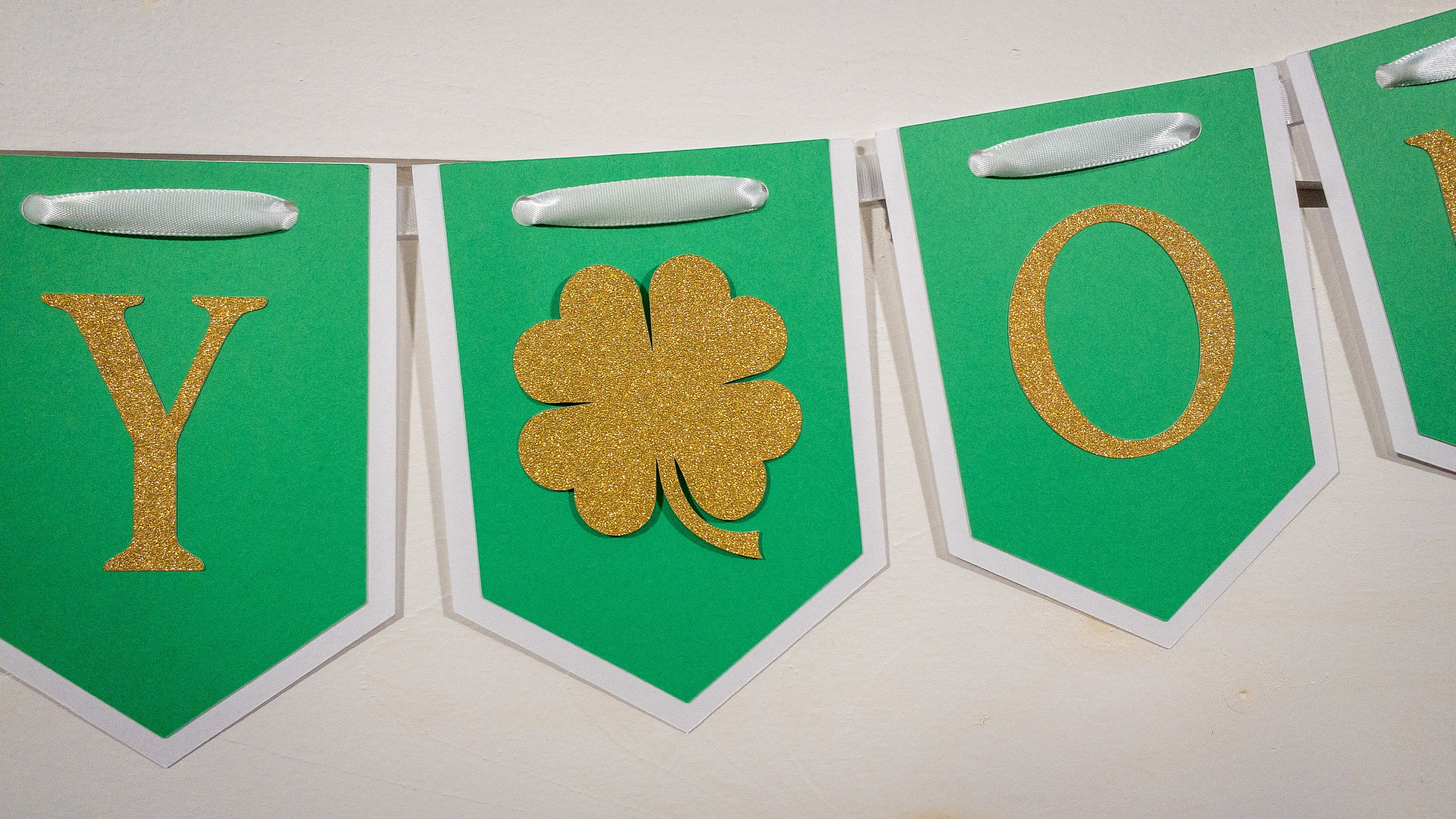 The banner is made from premium cardstock and each pennant piece measures approximately 5 inches in length and 3.75 inches wide. The pennants are attached with a white satin ribbon that is looped on the ends for easy hanging. The letters and shamrocks are made from premium gold glitter cardstock. The shamrocks are attached with a foam dot to create a 3D effect.