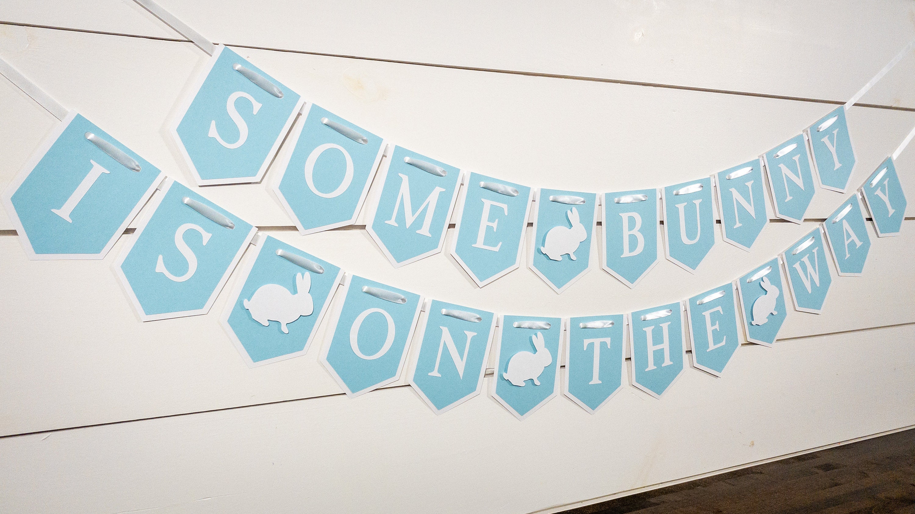Are you expecting a little bunny or hosting a bunny themed baby shower? This blue and white bunny banner is the perfect addition to your party decor!